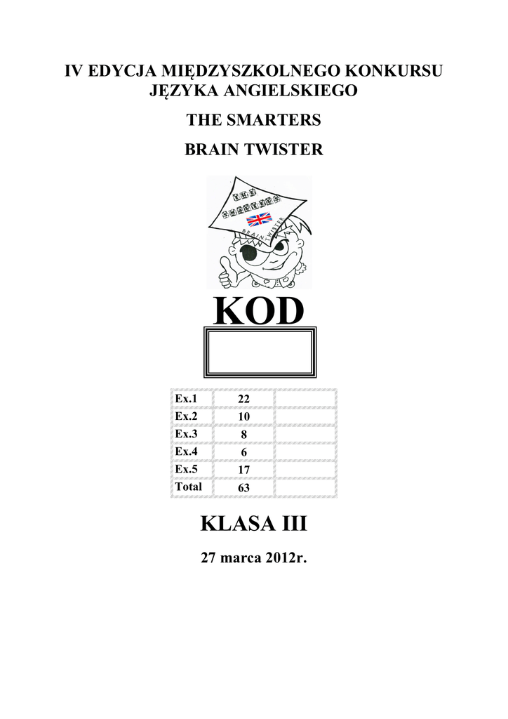 IV EDYCJA MIĘDZYSZKOLNEGO KONKURSU JĘZYKA ANGIELSKIEGO THE SMARTERS BRAIN TWISTER KOD Ex.1 Ex.2 Ex.3 Ex.4 Ex.5 Total 22 10 8 6 17 63 KLASA III 27 marca 2012r. 1. Zaznacz poprawną odpowiedź . UWAGA!!! Tylko JEDNA odpowiedź jest poprawna. 1. I like green … , red … and purple … . a) apples, strawberries, apricots b) pears, pineapples, grapes c) peas, cherries, plums a) lettuce, tomatoes, leek 7. What animal has got wings and a big beak? a) A lizard b) A vulture c) A starfish d) A cheetah 2. What animal has got a big shell on its back? a) An octopus b) A snail c) A shark d) A whale 8. Hen’s child is … a) b) c) d) A rooster A chick A duckling A goose 3. An …………. is delicious! a) orange carrots b) apples c) orange cake d) chocolate 9. Which animal doesn’t live in water? a) A walrus b) A starfish c) A peacock d) A shark 4. A fridge …. a) keeps the food cool. b) washes the food. c) washes the dishes. d) cooks the food. 10. You can’t wear.... a) tights. b) curtains. c) gloves. d) trainers. 5. In London you can’t see …. a) Big Ben. b) Trafalgar Square. c) The Eiffel Tower. d) Buckingham Palace. 11.Where can you send letters? a) At the baker’s. b) At the post office. c) In the book shop. d) At the library. 6. People usually sleep in … a) nests. b) dishwashers. c) chairs. d) beds. 12. My mother’s son is my… a) grandpa. b) brother. c) uncle. d) parents. 13.Hello Cindy! ……………? I’m reading. a) How are you b) What are you doing c) What do you like d) What would you like 14. Which animal has got a curly tail? a) A zebra. b) A frog. c) A pig. d) A rabbit. 17. It’s Halloween time. What season is it? a)It’s November. b)On 30th October. c)It’s October. d)It’s autumn. 18. What time is it? It’s … . a) eighteen o’clock. b) ten to half. c) half to one. d) six o’clock. 15.Do you want some sweets? ………………………….. a) Here you are. b) Yes, I don’t want to. c) No, please. d) Yes, please. 19. Mice and goldfish … a) can count. b) are pets. c) have got toes. d) eat grass. 14.GB in England is : a) Green Ben b) Great British c) Grey Box d) Great Britain 20. What day is Easter celebrated? a) In Spring. b) On Sunday. c) In April. d) In March. 15.My birthday is in … . 21.It’s cold. Can you ....... the window, please? a) touch b) open c) close d) clean a) b) c) d) 12 June June 12th June Monday 16.“I’m hungry”. a) Let’s go to the cinema. b) Let’s go for a walk. c) Let’s go to the restaurant. d) Let’s go to the chemist. 22. Whose book is this? a) It’s Ted. b) It’s on the shelf. c) It’s Mark’s. d) It’s “Red Riding Hood”. 2. Przeczytaj zagadki i wpisz przy każdej z nich właściwy numer obrazka, który opisują. 1 2 6 7 3 4 8 9 5 10 1. I’m a machine. I have got two wings and I can fly in the sky. 2. I’m a car. I come to take sick people to hospital. 3. People use me to cut down trees. 4. I am clean when I am black . I am dirty when I am white . 5. I have four legs but I can’t walk. People use me to sleep at night. 6. I am a box for taking pictures. 7. I have four legs. People sit on me. 8. The teachers use me to write words on the blackboard. 9. I’ve got two hands. I tell the time. 10.Kings and Queens wear me on special occasions. ____ ____ ____ ____ ____ ____ ____ ____ ____ ____ 3. Znajdź pary rymujących się wyrazów. Wpisz pary liczb do tabeli. 2. 1. 3. 7. 6. 8. 9. 14. 12. 13. 5. 4. 10. 15. 11. 16. 4. Przeczytaj tekst i zaznacz właściwą odpowiedź. My name’s Marco and I’m 11 years old. I’m Italian. My favourite sport is football. I play football twice a week at school. I have private football lessons on Monday and Friday. On Saturday I usually have matches with my team. We are very good at football and we often win. Of course I’m in the school team, too! I have a lot of friends and on Sunday we play football in the park. My favourite team is Milan and I hope to be a champion as Paolo Maldini. I’m Simon and I live in London. I’m 14 years old and I practice cycling. I like this sport because I can practice it in the parks. I cycle every day for two hours, usually in the mornings. In summer I cycle every day for three hours. I always wear a helmet to protect my head and I usually drink a lot of water. My parents are also fond of cycling so we often go on holiday by bike. Last year we went to Scotland by bicycles, it was fantastic! Hello, my name’s John and I’m American. I’m 12 years old and I like basketball. Here in the USA it is one of the national sports. Every family has a basket in the garden and you can see lots of girls and boys playing in the parks. I play basketball every afternoon with my friends and on Sunday mornings I play in the garden with my father and brother. I’m in the school team and every month we have a match against other teams. My favourite player is Michael Jordan. 1. Who’s Marco’s favourite player? a) Football b) Michael Jordan c) Paolo Maldini d) School team 2. How often does Simon practice? a) In the parks. b) In the summer. c) Every day. d) Two hours. 3. Who has got matches on Monday? a) Marco b) John c) Simon d) Nobody 4. When does John play basketball with his family? a) In the park. b) Never. c) Every afternoon. d) On Sunday mornings. 5. Does Simon’s father like cycling? a) Yes, he does. b) Yes, they do. c) No , he doesn’t. d) No, they don’t. 6. What’s American national sport? a) Football b) Basketball c) Cycling d) Swimming 5.a)Wpisz właściwe liczby odpowiadające nazwom przedmiotów przedstawionych na ilustracji. Zaznacz czy zdania opisujące pokój są prawdziwe czy fałszywe. 1. table 7. flower 2. hat 8. umbrella 3. kettle 9. shoes 4. basket 10. chair 5. bed 11. clock 6. door 12. pillow 1. There are two mice. Yes 2. There is one striped umbrella. Yes 3.There are two clocks on the ceiling. Yes 4. There is a fireplace. Yes 5. There aren’t any animals. Yes 6. There’s a square-shaped table. Yes 5b) Uzupełnij wierszyk o pokoju 