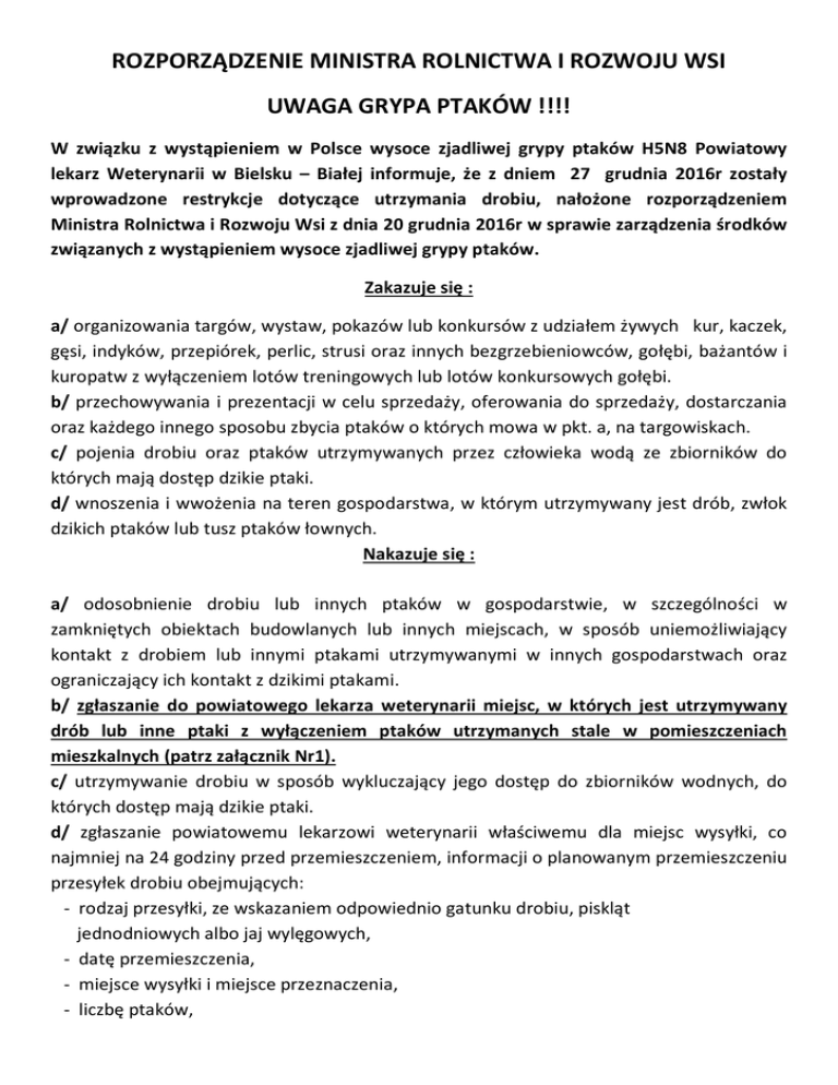 rozporządzenie ministra rolnictwa i rozwoju wsi uwaga grypa ptaków