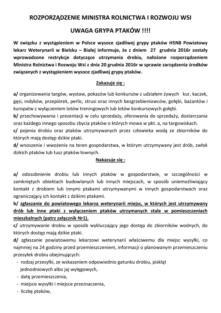 ROZPORZĄDZENIE MINISTRA ROLNICTWA I ROZWOJU WSI UWAGA GRYPA PTAKÓW !!!! W związku z wystąpieniem w Polsce wysoce zjadliwej grypy ptaków H5N8 Powiatowy lekarz Weterynarii w Bielsku – Białej informuje, że z dniem 27 grudnia 2016r zostały wprowadzone restrykcje dotyczące utrzymania drobiu, nałożone rozporządzeniem Ministra Rolnictwa i Rozwoju Wsi z dnia 20 grudnia 2016r w sprawie zarządzenia środków związanych z wystąpieniem wysoce zjadliwej grypy ptaków. Zakazuje się : a/ organizowania targów, wystaw, pokazów lub konkursów z udziałem żywych kur, kaczek, gęsi, indyków, przepiórek, perlic, strusi oraz innych bezgrzebieniowców, gołębi, bażantów i kuropatw z wyłączeniem lotów treningowych lub lotów konkursowych gołębi. b/ przechowywania i prezentacji w celu sprzedaży, oferowania do sprzedaży, dostarczania oraz każdego innego sposobu zbycia ptaków o których mowa w pkt. a, na targowiskach. c/ pojenia drobiu oraz ptaków utrzymywanych przez człowieka wodą ze zbiorników do których mają dostęp dzikie ptaki. d/ wnoszenia i wwożenia na teren gospodarstwa, w którym utrzymywany jest drób, zwłok dzikich ptaków lub tusz ptaków łownych. Nakazuje się : a/ odosobnienie drobiu lub innych ptaków w gospodarstwie, w szczególności w zamkniętych obiektach budowlanych lub innych miejscach, w sposób uniemożliwiający kontakt z drobiem lub innymi ptakami utrzymywanymi w innych gospodarstwach oraz ograniczający ich kontakt z dzikimi ptakami. b/ zgłaszanie do powiatowego lekarza weterynarii miejsc, w których jest utrzymywany drób lub inne ptaki z wyłączeniem ptaków utrzymanych stale w pomieszczeniach mieszkalnych (patrz załącznik Nr1). c/ utrzymywanie drobiu w sposób wykluczający jego dostęp do zbiorników wodnych, do których dostęp mają dzikie ptaki. d/ zgłaszanie powiatowemu lekarzowi weterynarii właściwemu dla miejsc wysyłki, co najmniej na 24 godziny przed przemieszczeniem, informacji o planowanym przemieszczeniu przesyłek drobiu obejmujących: - rodzaj przesyłki, ze wskazaniem odpowiednio gatunku drobiu, piskląt jednodniowych albo jaj wylęgowych, - datę przemieszczenia, - miejsce wysyłki i miejsce przeznaczenia, - liczbę ptaków, e/ przechowywanie paszy dla ptaków w sposób zabezpieczający przed kontaktem z dzikimi ptakami oraz ich odchodami, f/ karmienie i pojenie drobiu oraz ptaków utrzymywanych w niewoli w sposób zabezpieczający paszę i wodę przed dostępem dzikich ptaków oraz ich odchodami, g/ wyłożenie mat dezynfekcyjnych przed wejściami i wyjściami z budynków inwentarskich, w których jest utrzymywany drób, a w przypadku braku niecek dezynfekcyjnych – przed wjazdami i wyjazdami z gospodarstwa, w którym jest utrzymywany drób, oraz stałe utrzymywanie wyłożonych mat lub niecek dezynfekcyjnych w stanie zapewniającym skuteczne działanie środka dezynfekcyjnego, h/ stosowanie przez osoby wchodzące do budynków inwentarskich, w których jest utrzymywany drób, odzieży ochronnej oraz obuwia ochronnego, przeznaczonych do użytku wyłącznie w danym budynku, i/ stosowanie przez osoby wykonujące czynności związane z obsługą drobiu zasad higieny osobistej, w tym mycie rąk przed wejściem do budynków inwentarskich, j/ oczyszczanie i odkażanie sprzętu i narzędzi używanych do obsługi drobiu przed każdym ich użyciem, k/ powstrzymanie się, przez osoby, które w ciągu ostatnich 72 godzin uczestniczyły w polowaniu na ptaki łowne, od wykonywania czynności związanych z obsługą drobiu, l/ dokonywanie codziennego przeglądu stad drobiu wraz z prowadzeniem dokumentacji zawierającej w szczególności informacje na temat liczby padłych ptaków, spadku pobierania paszy lub nieśności, Z uwagi na wysoki stopień zagrożenia wystąpienie grypy ptaków na terenie powiatu bielskiego, Powiatowy Lekarz Weterynarii w Bielsku-Białej zwraca się z prośbą o jak najszybsze wykonanie w/w nakazów co będzie weryfikowane przez pracowników Powiatowego Inspektoratu Weterynarii w Bielsku-Białej. Zgłoszenia przyjmowane są w Powiatowym Inspektoracie Weterynarii w Bielsku-Białej: Tel (33) 4960180 Fax (33) 4960187 e-mail: [email protected] FORMULARZ ZGŁOSZENIA Załącznik nr 1 ………………………………………………………………….. (imię i nazwisko) …………………………………………………………………… (adres) …………………………………………………………………… (telefon) POWIATOWY LEKARZ WETERYNARII W BIELSKU – BIAŁEJ Ul. Karpacka 76 43-316 Bielsko-Biała ZGŁOSZENIE UTRZYMYWANIA DROBIU 1. Adres miejsca utrzymywania drobiu………………………………………………................... …………………………………………………………………………………………………………………………. 2. Gatunki i ilość utrzymywanego drobiu: Kury…………………………………sztuk Gęsi………………………………….sztuk Kaczki……………………………….sztuk Indyki……………………………….sztuk Perliczki…………………………….sztuk Inne…………………………………..sztuk 3. Oświadczam, że jestem świadomy zagrożenia wystąpienia grypy ptaków i podjąłem/am niezbędne czynności zabezpieczające utrzymywany przeze mnie drób. ………………………………………………….. podpis zgłaszającego