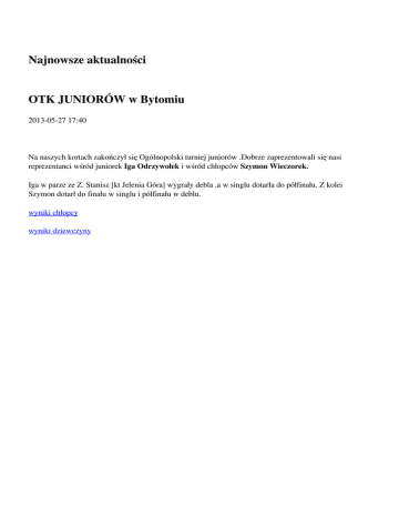 Najnowsze aktualności OTK JUNIORÓW w Bytomiu 2013-05-27 17:40 Na naszych kortach zakończył się Ogólnopolski turniej juniorów .Dobrze zaprezentowali się nasi reprezentanci wśród juniorek Iga Odrzywołek i wśród chłopców Szymon Wieczorek. Iga w parze ze Z. Stanisz [kt Jelenia Góra] wygrały debla ,a w singlu dotarła do półfinału. Z kolei Szymon dotarł do finału w singlu i półfinału w deblu. wyniki chłopcy wyniki dziewczyny Powered by TCPDF (www.tcpdf.org)