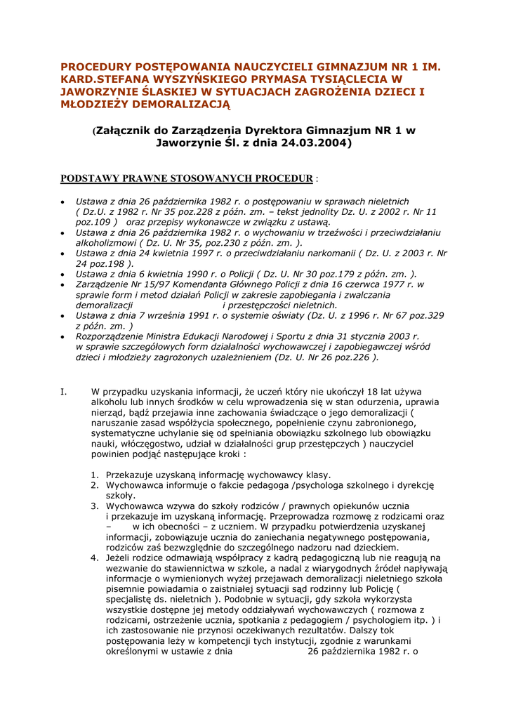 PROCEDURY POSTĘPOWANIA NAUCZYCIELI GIMNAZJUM NR 1 IM. KARD.STEFANA WYSZYŃSKIEGO PRYMASA TYSIĄCLECIA W JAWORZYNIE ŚLASKIEJ W SYTUACJACH ZAGROŻENIA DZIECI I MŁODZIEŻY DEMORALIZACJĄ (Załącznik do Zarządzenia Dyrektora Gimnazjum NR 1 w Jaworzynie Śl. z dnia 24.03.2004) PODSTAWY PRAWNE STOSOWANYCH PROCEDUR : · · · · · · · I. Ustawa z dnia 26 października 1982 r. o postępowaniu w sprawach nieletnich ( Dz.U. z 1982 r. Nr 35 poz.228 z późn. zm. – tekst jednolity Dz. U. z 2002 r. Nr 11 poz.109 ) oraz przepisy wykonawcze w związku z ustawą. Ustawa z dnia 26 października 1982 r. o wychowaniu w trzeźwości i przeciwdziałaniu alkoholizmowi ( Dz. U. Nr 35, poz.230 z późn. zm. ). Ustawa z dnia 24 kwietnia 1997 r. o przeciwdziałaniu narkomanii ( Dz. U. z 2003 r. Nr 24 poz.198 ). Ustawa z dnia 6 kwietnia 1990 r. o Policji ( Dz. U. Nr 30 poz.179 z późn. zm. ). Zarządzenie Nr 15/97 Komendanta Głównego Policji z dnia 16 czerwca 1977 r. w sprawie form i metod działań Policji w zakresie zapobiegania i zwalczania demoralizacji i przestępczości nieletnich. Ustawa z dnia 7 września 1991 r. o systemie oświaty (Dz. U. z 1996 r. Nr 67 poz.329 z późn. zm. ) Rozporządzenie Ministra Edukacji Narodowej i Sportu z dnia 31 stycznia 2003 r. w sprawie szczegółowych form działalności wychowawczej i zapobiegawczej wśród dzieci i młodzieży zagrożonych uzależnieniem (Dz. U. Nr 26 poz.226 ). W przypadku uzyskania informacji, że uczeń który nie ukończył 18 lat używa alkoholu lub innych środków w celu wprowadzenia się w stan odurzenia, uprawia nierząd, bądź przejawia inne zachowania świadczące o jego demoralizacji ( naruszanie zasad współżycia społecznego, popełnienie czynu zabronionego, systematyczne uchylanie się od spełniania obowiązku szkolnego lub obowiązku nauki, włóczęgostwo, udział w działalności grup przestępczych ) nauczyciel powinien podjąć następujące kroki : 1. Przekazuje uzyskaną informację wychowawcy klasy. 2. Wychowawca informuje o fakcie pedagoga /psychologa szkolnego i dyrekcję szkoły. 3. Wychowawca wzywa do szkoły rodziców / prawnych opiekunów ucznia i przekazuje im uzyskaną informację. Przeprowadza rozmowę z rodzicami oraz – w ich obecności – z uczniem. W przypadku potwierdzenia uzyskanej informacji, zobowiązuje ucznia do zaniechania negatywnego postępowania, rodziców zaś bezwzględnie do szczególnego nadzoru nad dzieckiem. 4. Jeżeli rodzice odmawiają współpracy z kadrą pedagogiczną lub nie reagują na wezwanie do stawiennictwa w szkole, a nadal z wiarygodnych źródeł napływają informacje o wymienionych wyżej przejawach demoralizacji nieletniego szkoła pisemnie powiadamia o zaistniałej sytuacji sąd rodzinny lub Policję ( specjalistę ds. nieletnich ). Podobnie w sytuacji, gdy szkoła wykorzysta wszystkie dostępne jej metody oddziaływań wychowawczych ( rozmowa z rodzicami, ostrzeżenie ucznia, spotkania z pedagogiem / psychologiem itp. ) i ich zastosowanie nie przynosi oczekiwanych rezultatów. Dalszy tok postępowania leży w kompetencji tych instytucji, zgodnie z warunkami określonymi w ustawie z dnia 26 października 1982 r. o postępowaniu w sprawach nieletnich „ Jeżeli uczeń przejawia powyższe zachowania po ukończeniu 18 roku życia ( a nie jest to udział w działalności grup przestępczych czy popełnienie przestępstwa ), sposób postępowania nauczyciela w takim przypadku powinien być uregulowany w statucie szkoły. W przypadku uzyskania informacji o popełnieniu przez ucznia, który ukończył 17 lat, przestępstwa ściganego z urzędu lub udziału w działalności grup przestępczych, zgodnie z art. 304 § 2 kodeksu postępowania karnego, szkoła jako instytucja jest obowiązana niezwłocznie zawiadomić o tym prokuratora lub Policję. II. Do podejmowania działań interwencyjnych przez szkołę w sytuacjach kryzysowych zobowiązują treści zawarte w Rozporządzeniu Ministra Edukacji Narodowej i Sportu z dnia 31 stycznia 2003 r. w sprawie szczegółowych form działalności wychowawczej i zapobiegawczej wśród dzieci i młodzieży zagrożonych uzależnieniem. Paragraf 9 rozporządzenia stanowi :”Szkoły i placówki podejmują działania interwencyjne polegające na powiadomieniu rodziców i Policji w sytuacjach kryzysowych w szczególności , gdy dzieci i młodzież używają, posiadają lub rozprowadzają środki o których mowa w § 1 cytowanego rozporządzenia”. W przypadku gdy nauczyciel podejrzewa, że na terenie szkoły uczeń znajduje się pod wpływem alkoholu lub narkotyków powinien podjąć następujące kroki : 1. Nauczyciel odizolowuje ucznia od reszty klasy, ale ze względów bezpieczeństwa nie pozostawia go samego; stwarza warunki, w których nie będzie zagrożone jego życie ani zdrowie. 2. Powiadamia o swoich przypuszczeniach wychowawcę klasy, pedagoga szkoły lub dyrekcję. 3. Nauczyciel, który przejął opiekę nad uczniem wzywa lekarza w celu stwierdzenia stanu zdrowia, ewentualnie udzielenia pomocy medycznej. 4. Zawiadamia o fakcie dyrekcję szkoły oraz rodziców /opiekunów, których zobowiązuje do niezwłocznego odebrania ucznia ze szkoły. - - - W przypadku odmowy ze strony rodziców / opiekunów, o pozostaniu ucznia w szkole, czy też przewiezieniu ucznia do placówki służby zdrowia, bądź też przekazania go do dyspozycji funkcjonariuszom policji decyduje lekarz, po ustaleniu aktualnego stanu zdrowia ucznia i w porozumieniu z dyrektorem szkoły / placówki. W przypadku ucznia będącego pod wpływem alkoholu – jeżeli rodzice odmawiają przyjazdu, a uczeń jest agresywny wobec kolegów, nauczycieli, bądź swoim zachowaniem daje powód do zgorszenia albo zagraża życiu lub zdrowiu innych – szkoła zawiadamia najbliższą jednostkę Policji. W przypadku stwierdzenia stanu nietrzeźwości ( stężenie we krwi powyżej 0,5 ‰ alkoholu lub w wydychanym powietrzu powyżej 0,25 mg alkoholu w 1 dm ³ ) Policja ma możliwość