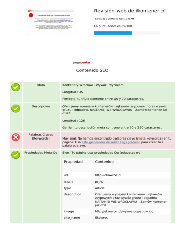 Revisión web de ikontener.pl Generado el 28 Marzo 2016 11:43 AM La puntuación es 69/100 Contenido SEO Título Kontenery Wrocław - Wywóz i wynajem Longitud : 35 Perfecto, tu título contiene entre 10 y 70 caracteres. Descripción Oferujemy wynajem kontenerów i rękawów zsypowych oraz wywóz gruzu i odpadów. NAJTANIEJ WE WROCŁAWIU - Zamów kontener już dziś! Longitud : 126 Genial, tu descripción meta contiene entre 70 y 160 caracteres. Palabras Claves (Keywords) Propiedades Meta Og Muy mal. No hemos encontrado palabras clave (meta keywords) en tu página. Usa este generador de meta tags gratuito para crear tus palabras clave. Bien. Tu página usa propiedades Og (etiquetas og). Propiedad Contenido url http://ekowroc.pl locale pl_PL type article description Oferujemy wynajem kontenerów i rękawów zsypowych oraz wywóz gruzu i odpadów. NAJTANIEJ WE WROCŁAWIU - Zamów kontener już dziś! image http://ekowroc.pl/wywoz-odpadow.jpg site_name Ekowroc Contenido SEO title Titulos Kontenery na gruz i odpady Wrocław. Wywóz i wynajem H1 2 H2 3 H3 11 H4 0 H5 0 H6 0 [H1] Kontenery na gruz, wywóz odpadów Wrocław i okolice [H1] Kontenery Wrocław na gruz, śmieci i odpady.Wywóz oraz wynajem [H2] Jeżeli budujesz, remontujesz lub sprzątasz zamów kontener już dziś [H2] Oferujemy między innymi [H2] Dodatkowo mogą się również przydać [H3] Kontenery na gruz [H3] Kontenery na odpady [H3] Kontenery na śmieci [H3] Wywóz gruzu [H3] Wywóz odpadów [H3] Wywóz śmieci [H3] Prowadzisz własną firmę budowlaną lub potrzebujesz stałych usług związanych z naszą działalnością [H3] Znasz osoby, które budują dom lub remontują mieszkanie albo jesteś jednym z naszych zadowolonych klientów [H3] Rękawy zsypowe [H3] Kruszywa [H3] Wynajem maszyn budowlanych Imagenes Hemos encontrado 17 imágenes en esta web. 6 atributos alt están vacios o no existen. Agrega texto alternativo para que los motores de búsqueda puedan entender las imágenes. Ratio Texto/HTML Ratio : 25% Ideal! El ratio entre texto y código HTML de esta página está entre 25 y 70 por ciento. Flash Iframe Perfecto, no se ha detectado contenido Flash en la página. Genial, no se han detectado Iframes en la página. Enlaces SEO Reescritura URL Bien. Tus enlaces parecen amigables Guiones bajos en las URLs Perfecto! No hemos detectado guiones bajos en tus URLs Enlaces SEO Enlaces en página Hemos encontrado un total de 7 enlaces incluyendo 0 enlace(s) a ficheros Statistics Enlaces Externos : noFollow 0% Enlaces Externos : Pasando Jugo 0% Enlaces Internos 100% Enlaces en página Ancla Tipo Jugo Kontenery na gruz Interna Pasando Jugo Kontenery na śmieci Wrocław Interna Pasando Jugo Kontenery na odpady Interna Pasando Jugo Wywóz gruzu Interna Pasando Jugo RĘKAWY ZSYPOWE Interna Pasando Jugo CZĘSTE PYTANIA Interna Pasando Jugo Wrocław Interna Pasando Jugo Palabras Clave SEO Nube de Palabras Clave wynajem kontenery wywóz bardzo oraz wrocław celu naszą się lub Consistencia de las Palabras Clave Palabra Clave (Keyword) Contenido kontenery 9 się 9 Título Palabras Claves (Keywords) Descripció n Titulos Consistencia de las Palabras Clave lub 5 oraz 5 wrocław 4 Usabilidad Url Dominio : ikontener.pl Longitud : 12 Favicon Genial, tu web tiene un favicon. Imprimibilidad No hemos encontrado una hoja de estilos CSS para impresión. Idioma Genial. Has declarado el idioma pl. Dublin Core Esta página no usa Dublin Core. Documento Tipo de documento (Doctype) HTML 5 Codificación Perfecto. Has declarado como codificación UTF-8. Validez W3C Errores : 1 Avisos : 0 Privacidad de los Emails Genial. No hay ninguna dirección de email como texto plano! HTML obsoleto Genial, no hemos detectado ninguna etiqueta HTML obsoleta. Consejos de Velocidad Excelente, esta web no usa tablas. Perfecto. No se han declaro estilos embenidos (inline CSS) en tus etiquetas HTML! Documento Genial, tu página web usa muy pocos ficheros CSS. Perfecto, tu web usa pocos ficheros JavaScript. Su sitio web no se beneficia de gzip. Intente implementarlo en su sitio web. Movil Optimización Móvil Icono para Apple Etiqueta Meta Viewport Contenido Flash Optimización Mapa del sitio XML No disponible Su sitio web no tiene un mapa del sitio XML. Esto puede traerle problemas. Un mapa del sitio enumera las URL que pueden rastrearse y puede incluir información adicional, como las últimas actualizaciones de su sitio web, la frecuencia de cambios y la importancia de las URL. Esto permite a los motores de búsqueda rastrear el sitio web de una forma más exhaustiva. Robots.txt http://ikontener.pl/robots.txt ¡Estupendo! Su sitio web tiene un archivo robots.txt. Herramientas de Analítica ¡Perfecto! Su sitio web tiene una herramienta de análisis. Google Analytics Powered by TCPDF (www.tcpdf.org)