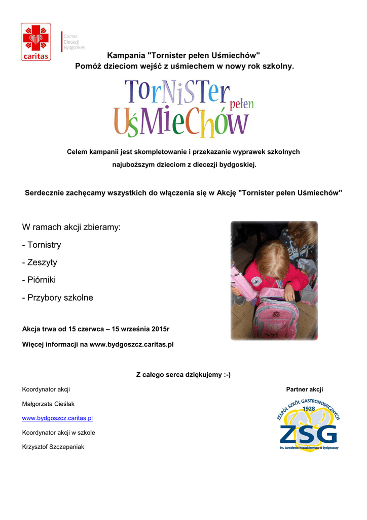 Kampania "Tornister pełen Uśmiechów" Pomóż dzieciom wejść z uśmiechem w nowy rok szkolny. Celem kampanii jest skompletowanie i przekazanie wyprawek szkolnych najuboższym dzieciom z diecezji bydgoskiej. Serdecznie zachęcamy wszystkich do włączenia się w Akcję "Tornister pełen Uśmiechów" W ramach akcji zbieramy: - Tornistry - Zeszyty - Piórniki - Przybory szkolne Akcja trwa od 15 czerwca – 15 września 2015r Więcej informacji na www.bydgoszcz.caritas.pl Z całego serca dziękujemy :-) Koordynator akcji Małgorzata Cieślak www.bydgoszcz.caritas.pl Koordynator akcji w szkole Krzysztof Szczepaniak Partner akcji