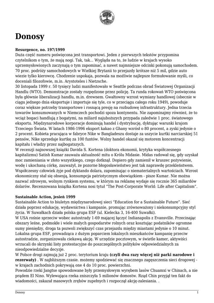 Donosy Resurgence, no. 197/1999 Duża część numeru poświęcona jest transportowi. Jeden z pierwszych tekstów przypomina czytelnikom o tym, że mają nogi. Tak, tak... Wygląda na to, że ludzie w krajach wysoko uprzemysłowionych zaczynają o tym zapominać, a nawet najmniejsze odcinki pokonują samochodem. 70 proc. podróży samochodowych w Wielkiej Brytanii to przejazdy krótsze niż 5 mil, gdzie auto wiezie tylko kierowcę. Chodzenie uspokaja, pozwala na możliwie najlepsze formułowanie myśli, co doceniali filozofowie, m.in. Arystoteles i Nietzsche. 30 listopada 1999 r. 50 tysięcy ludzi manifestowało w Seattle podczas obrad Światowej Organizacji Handlu (WTO). Demonstracje zostały rozpędzone przez policję. Ta runda rokowań WTO poświęcona była głównie liberalizacji handlu, m.in. drewnem. Gwałtowny wzrost wymiany handlowej (obecnie w ciągu jednego dnia eksportuje i importuje się tyle, co w przeciągu całego roku 1949), powoduje coraz większe potrzeby transportowe i rosnącą presję na rozbudowę infrastruktury. Jedna trzecia towarów konsumowanych w Niemczech pochodzi spoza kontynentu. Nie zapominajmy również, że to wciąż bogaci handlują z bogatymi, na miliard najuboższych przypada zaledwie 1 proc. światowego eksportu. Międzynarodowe korporacje dominują handel i dystrybucję, dyktując warunki krajom Trzeciego Świata. W latach 1986-1996 eksport kakao z Ghany wzrósł o 80 procent, a zyski jedynie o 2 procent. Kobieta pracująca w fabryce Nike w Bangladeszu dostaje za uszycie kurtki narciarskiej 51 pensów, Nike sprzedaje kurtkę za 100 funtów. Wolny handel okazał się motorem koncentracji kapitału i władzy przez najbogatszych. W recenzji najnowszej książki Davida S. Kortena (doktora ekonomii, krytyka współczesnego kapitalizmu) Satish Kumar zauważa aktualność mitu o Królu Midasie. Midas radował się, gdy uzyskał moc zamieniania w złoto wszystkiego, czego dotknął. Dopiero gdy zamienił w kruszec pożywienie, wodę i ukochaną córkę, zauważył, że pozorne błogosławieństwo jest tak naprawdę przekleństwem. Współczesny człowiek żyje pod dyktando dolara, zapominając o niematerialnych wartościach. Wzrost ekonomiczny stał się obsesją, konsumpcja patriotycznym obowiązkiem - pisze Kumar. Nie można nazwać zdrowym, wolnym rynkiem systemu, w którym na reklamę wydaje się rocznie 365 miliardów dolarów. Recenzowana książka Kortena nosi tytuł “The Post-Corporate World: Life after Capitalism”. Sustainable Action, jesień 1999 Sustainable Action to biuletyn międzynarodowej sieci “Education for a Sustainable Future”. Sieć działa poprzez edukację, wydawnictwa i kampanie, promując zrównoważony i niekonsumpcyjny styl życia. W Suwałkach działa polska grupa ESF (ul. Kielecka 3, 16-400 Suwałki). W USA rośnie sprzeciw wobec autostrady 1-69 mającej łączyć Indianapolis z Evansville. Przecinając obszary leśne, podmokłe i wiele małych gospodarstw rolnych oraz kosztując podatników ogromne sumy pieniędzy, droga ta pozwoli zwiększyć czas przejazdu między miastami jedynie o 10 minut. Lokalna grupa ESF, prowadząca z dużym poparciem lokalnych mieszkańców kampanię przeciw autostradzie, zorganizowała ciekawą akcję. W urzędzie pocztowym, w świetle kamer, aktywiści wrzucali do skrzynki listy protestacyjne do poszczególnych polityków odpowiedzialnych za nieodpowiedzialne decyzje. W Polsce drogi zajmują już 2 proc. terytorium kraju (czyli dwa razy więcej niż parki narodowe i rezerwaty) . W najbliższym czasie. możemy spodziewać się znacznego zagęszczenia sieci drogowej w krajach zachodnich pokrywają one 4 do 10 proc. powierzchni. Powodzie rzeki Jangtse spowodowane były przemysłowym wyrębem lasów Chuamxi w Chinach, a nie prądem El Nino. Wylewająca rzeka zniszczyła 5 milionów domostw. Rząd Chin przyjął ten fakt do wiadomości, zakazał masowych zrębów zupełnych i rozpoczął akcję-zalesiania. . Donosy 1 Jednym z priorytetów koncernu General Motors jest obecnie zaszczepienie kultury samochodowej w Chinach. Prezydent Clinton obiecał ułatwienia dla firm motoryzacyjnych inwestujących na chińskim rynku. Według raportu Worldwatch Institute, gdy Chińczycy zaczną korzystać z paliwa na poziomie USA, dziennie zużywać będą 80 milionów baryłek, czyli o 13 milionów baryłek więcej niż obecnie spala każdego dnia cała ludzka populacja. LD Donosy 2