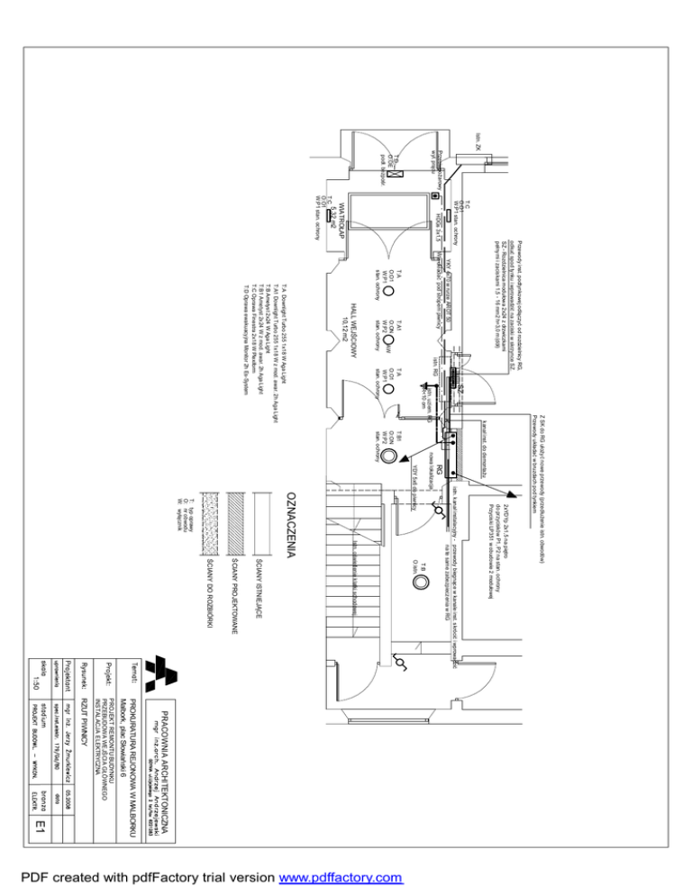 Istn. ZK Przeciwpożarowy wył. prądu T:D O:OE podł. bezpośr. YKY 4x70 w rurze AROT 50 O:ON AW W:P2 stan. ochrony T:A1 Wlz układać pod stropem piwnicy T:A O:O1 W:P1 stan. ochrony HALL WEJŚCIOWY 10,12 m2 SZ YDY 5x6 do piwnicy OZNACZENIA ŚCIANY DO ROZBIÓRKI ŚCIANY PROJEKTOWANE ŚCIANY ISTNIEJĄCE Istn. oświetlenie klatki schodowej T:B O:istn. istn. kanał instalacyjny - przewody biegnące w kanale inst. skrócić i wprowadzić na te same zabezpieczenia w RG 2xYDYp 2x1,5 na piętro do przycisków P1, P2 na stan. ochrony Przyciski LP351 w obudowie 2 modułowej Z SK do RG ułożyć nowe przewody (przedłużenie istn. obwodów) Przewody układać w bruzdach pod tynkiem T:B1 O:ON W:P2 stan. ochrony nowa lokalizacja RG kanał inst. do demontażu istn. uziem. RG R<10 om T:A O:O1 W:P1 stan. ochrony istn. RG Przewody inst. podtynkowej odłączyć od rozdzielnicy RG, odkuć spod tynku i wprowadzić na zaciski w skrzynce SZ. SZ - Rozdzielnica modułowa 2x24 z drzwiczkami pełnymi i zaciskami 1,5 - 16 mm2 h=3,0 m (dół) T:C O:O1 W:P1 stan. ochrony HDGs 3x1,5 WIATROŁAP 5,32 m2 T:C O:O1 W:P1 stan. ochrony T:A Downlight Turbo 255 1x18 W Aga Light T:A1 Downlight Turbo 255 1x18 W z mod. awar. 2h Aga Light T:B Ametyst 2x24 W Aga Light T:B1 Ametyst 2x24 W z mod. awar. 2h Aga Light T:C Oprawa Finestra 2x18 W Plexiform T:D Oprawa ewakuacyjna Monitor 2h Es-System T: typ oprawy O: nr obwodu W: wyłącznik PRACOWNIA ARCHITEKTONICZNA PROKURATURA REJONOWA W MALBORKU Malbork, plac Słowiański 6 PROJEKT REMONTU BUDYNKU PRZEBUDOWA WEJŚCIA GŁÓWNEGO INSTALACJA ELEKTRYCZNA RZUT PIWNICY E1 PDF created with pdfFactory trial version www.pdffactory.com