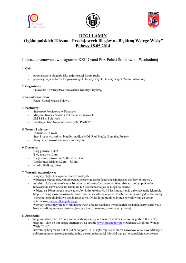 REGULAMIN Ogólnopolskich Uliczno - Przełajowych Biegów o „Błękitną Wstęgę Wisły” Puławy 18.05.2014 Impreza promowana w programie XXII Grand Prix Polski Środkowo – Wschodniej 1. Cel: - popularyzacja biegania jako najprostszej formy ruchu popularyzacja walorów krajoznawczych, turystycznych i historycznych Ziemi Puławskiej 2. Organizator: - Puławskie Towarzystwo Krzewienia Kultury Fizycznej 3. Współorganizator: Rada i Urząd Miasta Puławy 4. Partnerzy: Starostwo Powiatowe w Puławach - Miejski Ośrodek Sportu i Rekreacji w Puławach - ZM SZS w Puławach - Fundacja Osób Niepełnosprawnych „PA-KT” 5. Termin i miejsce: - 18 maja 2014 roku - Start i meta wszystkich biegów: stadion MOSiR ul. Hauke-Bossaka, Puławy - Trasy: ulice wokół stadionu i las miejski 6. Dystanse: - Bieg główny: 10km - Bieg masowy: 5km - Biegi młodzieżowe: od 500m do 2,1km - Wózki inwalidzkie: 4,2km – 5,3km - Nordic Walking: 5km 7. Warunki uczestnictwa: wszyscy chętni bez ograniczeń zdrowotnych w biegach młodzieżowych obowiązuje zaświadczenie lekarskie (dopuszcza się listy zbiorowe), młodzież, która nie ukończyła 16 lat może startować w biegu na 5km tylko za zgodą opiekunów (obowiązują zaświadczenia lekarskie lub oświadczenia jak w biegu na 10km) w biegu na 10km mogą startować osoby, które ukończyły 16 lat i przedstawią zaświadczenie lekarskie (dopuszcza się złożenie oświadczenia o starcie na własną odpowiedzialność przez osoby dorosłe, osoby niepełnoletnie dodatkowo zgoda rodziców). Druki do pobrania w biurze zawodów lub ze strony internetowej www.ptkkf.pulawy.pl wszyscy uczestnicy biegów młodzieżowych oraz na wózkach inwalidzkich posiadają karty startowe, a Nordic walking numery startowe (wydaje biuro zawodów, wzór w załączeniu) 8. Zgłoszenia: - biegi młodzieżowe, wózki i nordic walking zapisy w biurze zawodów (stadion w godz. 9.00-12.30) - biegi na 10km i 5 km drogą internetową na stronie www.pulsarsport.pl w zakładce „Błękitna Wstęga Wisły 2014”. uczestnicy biegów na 10km i 5km do godz. 11.30 zgłaszają się w biurze zawodów w celu weryfikacji i odbioru numeru startowego (niezbędny dowód tożsamości i dowód wpłaty) oraz pakietu startowego 9. Opłata startowa: uczestnicy biegów na 10km i 5km (dokonują wpłaty i zgłoszenia): w terminie do 15 kwietnia – 30zł (liczy się data wpływu) w terminie do 1 maja – 35 zł w terminie do 11 maja – 40 zł w dniu 18 maja w biurze zawodów 50 zł (bez względu na ewentualne wcześniejsze zapisy internetowe) Opłatę należy wpłacić na konto PTKKF nr 57 1020 3219 0000 9502 0043 1007 w PKO BP S.A. o/Puławy z podaniem imiennie i nazwiska oraz dopiskiem „Błękitna Wstęga Wisły” 10. Kategorie wiekowe: - biegi młodzieżowe osobno chłopcy i dziewczęta 2004 i młodsi (-sze), 2001-2003, 1998 – 2000, 1995-1997) wózki inwalidzkie: kobiety open, mężczyźni tetraplegia i paraplegia nordic walking: kobiety open, mężczyźni open - bieg na 5km: kobiety open, mężczyźni open - bieg na 10km: kobiety open, do 35 lat (1979 i młodsze), 36 lat i starsze (1978 i starsze) Mężczyźni open oraz M1 16-29lat (1998-1985); M2 30-39 lat (1984-1975); M3 40-49 lat (1974-1965), M4 50-59 lat (1964-1955), M5 60 lat i starsi (1954 i starsi) 11. Klasyfikacja: - punktuje 30 zawodników w każdym biegu rywalizacji indywidualnej: Im-35pkt; IIm-32pkt; IIIm-29pkt; IVm-27pkt; Vm-26pkt ……XXXm-1pkt. - dodatkowo do klasyfikacji drużynowej szkół i klubowej dolicza się po 1pkt. za każdego zawodnika, który ukończył bieg klasyfikacja grup wiekowych w biegu na 10km tylko w sytuacji, gdy bieg ukończy co najmniej 3 zawodników danej grupy 12. Opis tras: asfalt, kostka, w lesie podłoże twarde i piaszczyste; trasa mało zróżnicowana Trasa I – stadion, Hauke-Bossaka, stadion (ok. 500m) Trasa II – stadion, Hauke-Bossaka, Bema, Kościuszki, Dąbrowskiego, Hauke-Bossaka, stadion (ok. 1050m) Trasa III – stadion, Hauke-Bossaka, Bema, Kościuszki, Sowińskiego, Hauke Bossaka, stadion (1350m) Trasa IV – stadion, Hauke-Bossaka, Bema, Kościuszki, Sowińskiego, las miejski, Hauke Bossaka, stadion (2500m) Pomiar czasu w biegach na 10km i 5km elektroniczny za pomocą zwrotnych czipów. 13. Nagrody: - wszyscy uczestnicy biegów młodzieżowych, na wózkach i nordic walking otrzymują dyplomy uczestnictwa - biegi młodzieżowe miejsca I – III medale, dyplomy, nagrody rzeczowe, IV – VI dyplomy, upominki - nordic walking Kobiety i mężczyźni miejsca I – III medale, upominki - wózki; miejsca I – III w każdej kategorii; nagrody rzeczowe - bieg na 5km; Kobiety i Mężczyźni za miejsca I – III; puchary, nagrody rzeczowe - bieg na 10km: kobiety i mężczyźni open za miejsca I – VI nagrody finansowe, puchary; kategorie wiekowe kobiet i mężczyzn: za miejsca I – III, puchary, nagrody rzeczowe (ew. za Im nagroda finansowa). Nagrody nie podlegają kumulacji. - nagrody specjalne dla zwycięzców klasyfikacji: najlepsi puławianie, najlepsi nauczyciele, najstarsi uczestnicy (osobno kobiety i mężczyźni) 14. Finanse: - koszty organizacyjne pokrywają organizatorzy - przejazdy i inne koszty własne pokrywają uczestnicy 15. Uwagi końcowe: - wszyscy uczestnicy są ubezpieczeni na czas biegu - organizator zabezpiecza przebieralnię, ale nie bierze odpowiedzialności za pozostawiony tam sprzęt, odzież itp. - impreza odbywa się bez względu na pogodę - organizator zabezpiecza sobie prawo do zmiany regulaminu nagradzania - pobranie numeru startowego oznacza akceptację regulaminu, zgodę na przetwarzanie danych osobowych oraz wykorzystanie wizerunku uczestników dla potrzeb Biegu i Organizatora - w sprawach spornych i nie ujętych w regulaminie decyduje organizator - protesty można składać wyłącznie w formie pisemnej po wpłaceniu kaucji (100 zł) do sędziego głównego w ciągu 0,5 godz. po zakończeniu biegu. Inne formy nie będą rozpatrywane. W przypadku nie uznania pro