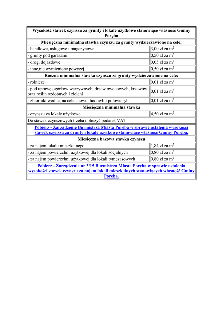 Wysokość stawek czynszu za grunty i lokale użytkowe stanowiące własność Gminy Poręba Miesięczna minimalna stawka czynszu za grunty wydzierżawione na cele; - handlowe, usługowe i magazynowe 3,00 zł za m2 - grunty pod garażami 0,50 zł za m2 - drogi dojazdowe 0,05 zł za m2 - inne,nie wymienione powyżej 0,50 zł za m2 Roczna minimalna stawka czynszu za grunty wydzierżawione na cele: - rolnicze 0,01 zł za m2 - pod uprawę ogórków warzywnych, drzew owocowych, krzewów 0,01 zł za m2 oraz roślin ozdobnych i zieleni - zbiorniki wodne, na cele chowu, hodowli i połowu ryb 0,01 zł za m2 Miesięczna minimalna stawka - czynszu za lokale użytkowe Do stawek czynszowych trzeba doliczyć podatek VAT 4,50 zł za m2 Pobierz - Zarządzenie Burmistrza Miasta Poręba w sprawie ustalenia wysokości stawek czynszu za grunty i lokale użytkowe stanowiące własność Gminy Poręba. Miesięczna bazowa stawka czynszu - za najem lokalu mieszkalnego 1,84 zł za m2 - za najem powierzchni użytkowej dla lokali socjalnych 0,80 zł za m2 - za najem powierzchni użytkowej dla lokali tymczasowych 0,80 zł za m2 Pobierz - Zarządzenie nr 3/15 Burmistrza Miasta Poręba w sprawie ustalenia wysokości stawek czynszu za najem lokali mieszkalnych stanowiących własność Gminy Poręba.