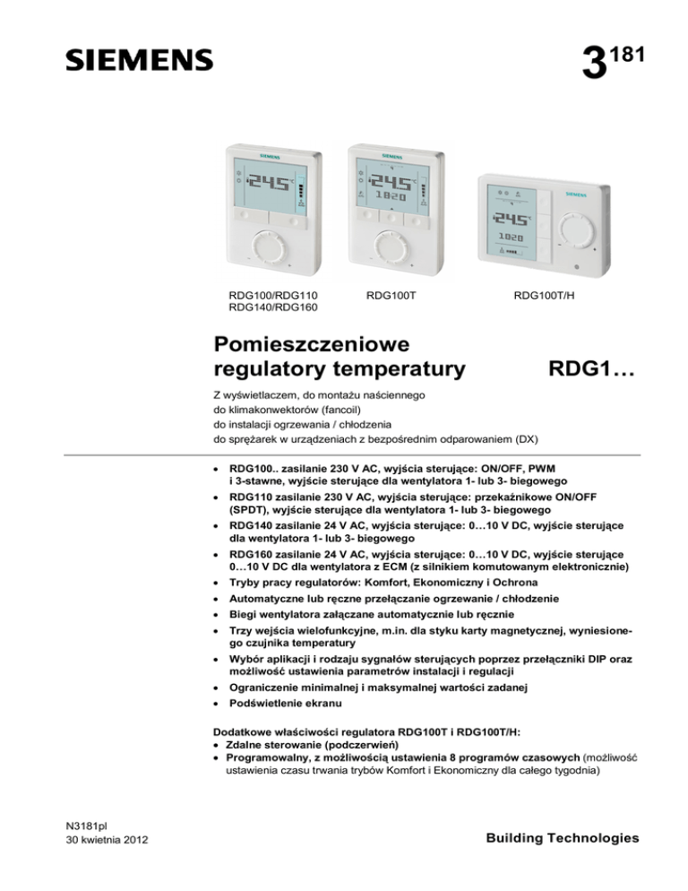 3 RDG100/RDG110 RDG140/RDG160 RDG100T 181 RDG100T/H Pomieszczeniowe regulatory temperatury RDG1… Z wyświetlaczem, do montażu naściennego do klimakonwektorów (fancoil) do instalacji ogrzewania / chłodzenia do sprężarek w urządzeniach z bezpośrednim odparowaniem (DX) RDG100.. zasilanie 230 V AC, wyjścia sterujące: ON/OFF, PWM i 3-stawne, wyjście sterujące dla wentylatora 1- lub 3- biegowego RDG110 zasilanie 230 V AC, wyjścia sterujące: przekaźnikowe ON/OFF (SPDT), wyjście sterujące dla wentylatora 1- lub 3- biegowego RDG140 zasilanie 24 V AC, wyjścia sterujące: 0…10 V DC, wyjście sterujące dla wentylatora 1- lub 3- biegowego RDG160 zasilanie 24 V AC, wyjścia sterujące: 0…10 V DC, wyjście sterujące 0…10 V DC dla wentylatora z ECM (z silnikiem komutowanym elektronicznie) Tryby pracy regulatorów: Komfort, Ekonomiczny i Ochrona Automatyczne lub ręczne przełączanie ogrzewanie / chłodzenie Biegi wentylatora załączane automatycznie lub ręcznie Trzy wejścia wielofunkcyjne, m.in. dla styku karty magnetycznej, wyniesionego czujnika temperatury Wybór aplikacji i rodzaju sygnałów sterujących poprzez przełączniki DIP oraz możliwość ustawienia parametrów instalacji i regulacji Ograniczenie minimalnej i maksymalnej wartości zadanej Podświetlenie ekranu Dodatkowe właściwości regulatora RDG100T i RDG100T/H: Zdalne sterowanie (podczerwień) Programowalny, z możliwością ustawienia 8 programów czasowych (możliwość ustawienia czasu trwania trybów Komfort i Ekonomiczny dla całego tygodnia) N3181pl 30 kwietnia 2012 Building Technologies Przeznaczenie Pomieszczeniowe regulatory temperatury linii RDG1… przeznaczone są do: Klimakonwektorów (sygnał sterujący ON/OFF lub modulowany): 2-rurowych 2-rurowych z nagrzewnicą elektryczną 2-rurowych wraz z grzejnikiem / ogrzewaniem podłogowym 4-rurowych 4-rurowych z nagrzewnicą elektryczną z 2-etapowym ogrzewaniem / chłodzeniem Instalacji uniwersalnych (sygnał sterujący ON/OFF lub modulowany): sufitów chłodzących / grzewczych sufitów chłodzących / grzewczych z nagrzewnicą elektryczną sufitów chłodzących / grzewczych wraz z grzejnikiem / ogrzewaniem podłogowym sufitów chłodzących / grzewczych z 2-etapowym ogrzewaniem / chłodzeniem Sprężarek pomp ciepła z bezpośrednim odparowaniem (DX): 1-stopniowych do ogrzewania / chłodzenia 1-stopniowych do ogrzewania / chłodzenia z nagrzewnicą elektryczną 1-stopniowych do ogrzewania / chłodzenia wraz z grzejnikiem / ogrzewaniem podłogowym 1-stopniowych do ogrzewania i chłodzenia z zaworem rewersyjnym 2-stopniowych do ogrzewania / chłodzenia Funkcje Utrzymanie żądanej temperatury w pomieszczeniu dzięki wbudowanemu lub wyniesionemu czujnikowi temperatury lub czujnikowi temperatury powietrza powrotnego oraz sterowaniu siłownikami zaworów i urządzeń ogrzewania / chłodzenia oraz – w aplikacjach z klimakonwektorami – sterowaniu pracą wentylatora Automatyczne lub ręczne przełączanie ogrzewanie/chłodzenie Wybór aplikacji oraz rodzaju sygnału sterującego poprzez przełączniki DIP Wybór trybu pracy przyciskiem na regulatorze Sygnał sterujący dla wentylatora 1- lub 3-biegowego lub z ECM Wyświetlanie bieżącej temperatury w pomieszczeniu lub nastawy w °C lub/i °F Ograniczenie minimalnej i maksymalnej wartości zadanej Blokada klawiatury (automatyczna lub ręczna) 3 wielofunkcyjne wejścia do wyboru dla: – przełącznika trybu pracy (styk karty magnetycznej, okna, itd.) – czujnika automatycznie przełączającego między ogrzewaniem / chłodzeniem – przełącznika funkcji ogrzewanie / chłodzenie – czujnika wyniesionego lub czujnika temperatury powietrza powrotnego – czujnika punktu rosy – załączenia / wyłączenia nagrzewnicy elektrycznej – wejście błędu Zaawansowane funkcje regulacji wentylatora: wybór pracy zależnie od opcji ogrzewanie/chłodzenie, wentylator aktywny lub nie – zależnie od aplikacji, opóźnienie startu w systemie z regulacją ON/OFF, okresowe załączanie, opóźnienie wyłączenia wentylatora dla ochrony nagrzewnicy elektrycznej, utrzymanie pracy każdego biegu przez określony czas (nastawialny) Przypomnienie o czyszczeniu filtrów wentylatora Funkcja obiegu czynnika i kontroli jego temperatury w aplikacji z 2-drogowym zaworem i automatycznym przełączaniem ogrzewanie / chłodzenie Ograniczenie maksymalnej temperatury dla ogrzewania podłogowego Powtórne załadowanie ustawień fabrycznych Możliwość nastawienia programu tygodniowego z 8 programami czasowymi do przełączania między trybem Komfort i Ekonomiczny (RDG100T i RDG100T/H) Zdalne sterowanie (RDG100T i RDG100T/H) 2/12 Siemens Building Technologies RDG1.. Pomieszczeniowy regulator temperatury N3181pl 30 kwietnia 2012 Zastosowanie Wybór aplikacji odbywa się poprzez odpowiednie nastawienie przełączników DIP (1, 2 i 3), które znajdują się z tyłu regulatora. W zależności od typu regulatora do dyspozycji są sygnały sterujące ON/OFF lub modulowane. Zastosowanie Przełącznik DIP ON/OFF, PWM, 3-stawny Ogrzewanie lub chłodzenie Sufit chłodzący / grzejący 1-stopniowa sprężarka RDG100… T Klimakonwektor 2-rurowy Regulator B2 T Sygnał sterujący (wyjściowy) (B1) ON ON/OFF (SPDT) RDG110 DC 0..10 V RDG140 DC 0..10 V 2) RDG160 Y1 OFF M1 1) 1 2 3 4 5 T (B1) Ogrzewanie lub chłodzenie z nagrzewnicą pomocniczą ON/OFF, PWM, 3-stawny T Klimakonwektor 2-rurowy z nagrzewnicą elektryczną T (B1) Y1 Sufit chłodzący / grzejący i nagrzewnica elektryczna ON/OFF (SPDT) ON 1 2 3 4 5 T (B1) Uwaga: sygnał modulowany do nagrzewnicy elektrycznej Uwaga: sygnał modulowany do nagrzewnicy elektrycznej RDG160 ON/OFF, PWM, 3-stawny RDG100… B2 T T (B1) ON Y1 Klimakonwektor 2-rurowy i grzejnik / ogrzewanie podłogowe ON/OFF (SPDT) RDG110 DC 0..10 V RDG140 DC 0..10 V 2) RDG160 OFF M1 1 2 3 4 5 T (B1) YR Ogrzewanie i chłodzenie ON/OFF, PWM, 3-stawny Klimakonwektor 4-rurowy Sufit chłodzący i grzejnik 1-stopniowa sprę