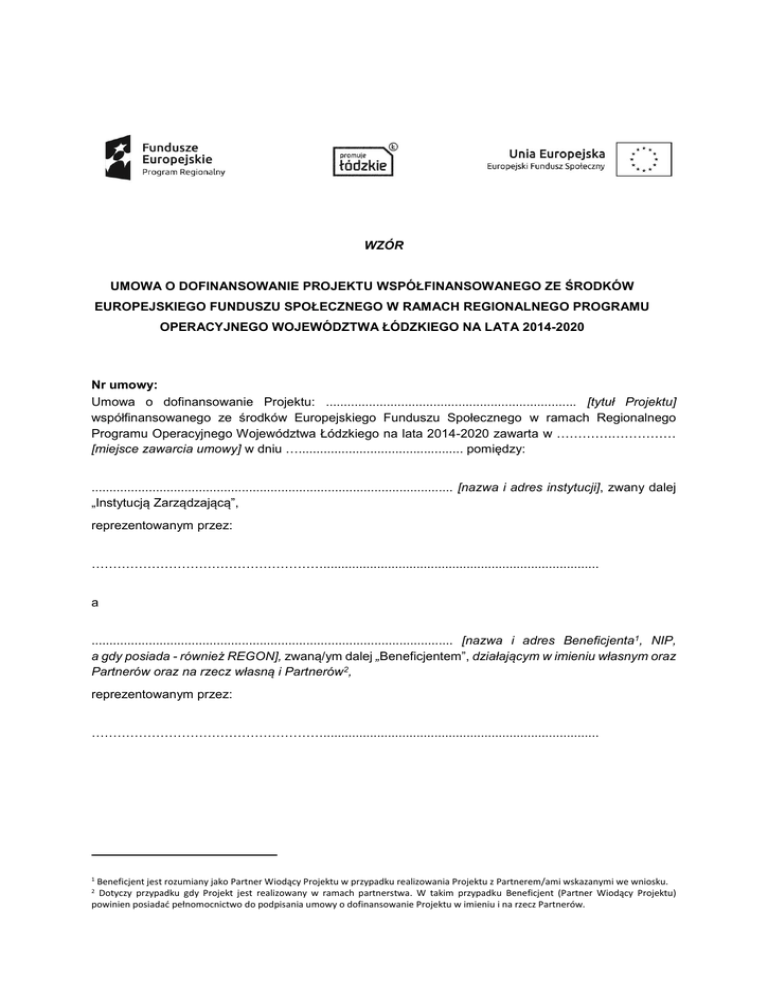 WZÓR UMOWA O DOFINANSOWANIE PROJEKTU WSPÓŁFINANSOWANEGO ZE ŚRODKÓW EUROPEJSKIEGO FUNDUSZU SPOŁECZNEGO W RAMACH REGIONALNEGO PROGRAMU OPERACYJNEGO WOJEWÓDZTWA ŁÓDZKIEGO NA LATA 2014-2020 Nr umowy: Umowa o dofinansowanie Projektu: ...................................................................... [tytuł Projektu] współfinansowanego ze środków Europejskiego Funduszu Społecznego w ramach Regionalnego Programu Operacyjnego Województwa Łódzkiego na lata 2014-2020 zawarta w ………….…………… [miejsce zawarcia umowy] w dniu ….............................................. pomiędzy: ..................................................................................................... [nazwa i adres instytucji], zwany dalej „Instytucją Zarządzającą”, reprezentowanym przez: ………………………………………………............................................................................. a ..................................................................................................... [nazwa i adres Beneficjenta1, NIP, a gdy posiada - również REGON], zwaną/ym dalej „Beneficjentem”, działającym w imieniu własnym oraz Partnerów oraz na rzecz własną i Partnerów2, reprezentowanym przez: ………………………………………………............................................................................. 1 Beneficjent jest rozumiany jako Partner Wiodący Projektu w przypadku realizowania Projektu z Partnerem/ami wskazanymi we wniosku. Dotyczy przypadku gdy Projekt jest realizowany w ramach partnerstwa. W takim przypadku Beneficjent (Partner Wiodący Projektu) powinien posiadać pełnomocnictwo do podpisania umowy o dofinansowanie Projektu w imieniu i na rzecz Partnerów. 2 § 1. Ilekroć w umowie jest mowa o: 1) „danych osobowych” oznacza to dane osobowe w rozumieniu ustawy z dnia 29 sierpnia 1997 r. o ochronie danych osobowych, zwanej dalej „ustawą o ochronie danych osobowych”, dotyczące uczestników Projektu, które muszą być przetwarzane przez Instytucję Zarządzającą oraz Beneficjenta w celu realizacji Regionalnego Programu Operacyjnego Województwa Łódzkiego na lata 2014-2020; 2) „Działaniu” oznacza to [nazwa i numer Działania]; 3) „Instytucji Zarządzającej” oznacza to Zarząd Województwa Łódzkiego; 4) „korekcie finansowej” oznacza to kwotę, o jaką pomniejsza się współfinansowanie UE dla Projektu w związku z nieprawidłowością indywidualną; 5) „kosztach pośrednich” oznacza to koszty administracyjne związane z obsługą Projektu, o których mowa w Wytycznych w zakresie kwalifikowalności; 6) „nieprawidłowości indywidualnej” oznacza to każde naruszenie prawa unijnego lub prawa krajowego dotyczącego stosowania prawa unijnego, wynikające z działania lub zaniechania podmiotu gospodarczego zaangażowanego we wdrażanie funduszy polityki spójności, które ma lub może mieć szkodliwy wpływ na budżet Unii poprzez obciążenie budżetu Unii nieuzasadnionym wydatkiem; 7) „Osi Priorytetowej” oznacza to [nazwa i numer Osi]; 8) „Partnerze” oznacza to podmiot w rozumieniu art. 33 ust. 1 ustawy wdrożeniowej, realizujący wspólnie z Beneficjentem (i ewentualnie innymi Partnerami) Projekt na warunkach określonych w umowie o dofinansowanie, porozumieniu albo w umowie o partnerstwie i wnoszący do Projektu zasoby ludzkie, organizacyjne, techniczne lub finansowe; 9) „Powierzającym” oznacza to odpowiednio: a) Instytucję Zarządzającą dla zbioru „Beneficjenci w ramach RPO WŁ 2014-2020”, b) Ministra Rozwoju dla zbioru „Centralny system teleinformatyczny wspierający realizację programów operacyjnych”, pełniących rolę właściwego dla danego zbioru administratora danych osobowych; 10) „Programie” oznacza to Regionalny Program Operacyjny Województwa Łódzkiego na lata 2014-2020 przyjęty Uchwałą Zarządu Województwa Łódzkiego z dnia ……….., w związku z decyzją Komisji Europejskiej z dnia 18 grudnia 2014 r. Nr CCI2014PL16M20P005; 11) „Projekcie” oznacza to Projekt pt. [tytuł Projektu] realizowany w ramach Działania określony we Wniosku o dofinansowanie projektu nr .................., zwanym dalej „Wnioskiem”, stanowiącym załącznik nr 1 do umowy; 12) „przetwarzaniu danych osobowych” oznacza to jakiekolwiek operacje wykonywane na danych osobowych, takie jak zbieranie, utrwalanie, przechowywanie, opracowywanie, zmienianie, udostępnianie i usuwanie, a zwłaszcza te, które wykonuje się w systemach informatycznych; 13) „SL2014” oznacza to centralny system teleinformatyczny wykorzystywany w procesie rozliczania Projektu oraz komunikowania się z Instytucją Zarządzającą, o którym mowa w Wytycznych Ministra Infrastruktury i Rozwoju w zakresie warunków gromadzenia i przekazywania danych w postaci elektronicznej na lata 2014-2020, zwane dalej „Wytycznymi w zakresie gromadzenia danych”; 14) „stawkach jednostkowych” oznacza to stawkę dla danego towaru lub usługi, o której mowa w Wytycznych w zakresie kwalifikowalności; 15) „stronie internetowej Instytucji Zarządzającej” oznacza to stronę internetową pod adresem: [adres strony internetowej]; 16) „uczestniku Projektu” oznacza to uczestnika w rozumieniu Wytycznych Ministra Infrastruktury i Rozwoju w zakresie monitorowania postępu rzeczowego realizacji programów operacyjnych na lata 2014-2020, zwanych dalej „Wytycznymi w zakresie monitorowania”, zamieszczonych na stronie internetowej Instytucji Zarządzającej; 17) „ustawie o finansach publicznych” oznacza to ustawę z dnia 27 sierpnia 2009 r. o finansach publicznych; 18) „ustawie Pzp” oznacza to ustawę z dnia 29 stycznia 2004 r. – Prawo zamówień publicznych; 2 19) „ustawie wdrożeniowej” oznacza to ustawę z dnia 11 lipca 2014 r. o zasadach realizacji programów w zakresie polityki spójności finansowanych w perspektywie finansowej 2014-2020; 20) „wydatkach 