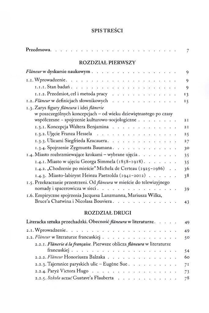 SPIS TREŚCI Przedm ow a................................................................................................................ 7 ROZDZIAŁ PIERWSZY dyskursie n au k o w y m .......................................................................... 9 I . I . W prow adzenie.............................................................................................. 9 1.1.1. Stan b a d a ń ............................................................................................. 9 1. 1.2. Przedmiot, cel i m etoda p r a c y .................................................... 13 1.2. F/áwíwr w definicjach s ło w n ik o w y c h ........................................................ 15 1.3. Zarys figury jiâneura i idei flânerie w poszczególnych koncepcjach - od wieku dziewiętnastego po czasy współczesne - spojrzenie kulturow o-socjologiczne................................. 21 1.3.1. Koncepcj a W altera B enj a m i n a ........................................................ 21 1.3.2. Ujęcie Franza H e s s e l a ...................................................................... 25 1.3.3. Ulicami Siegfrieda Kracauera............................................................. 27 1.3.4. Spojrzenie Zygm unta B aum ana........................................................ 30 1.4. M iasto rozbrzmiewające krokami - wybrane u jęcia................................. 35 1.4.1. M iasto w ujęciu Georga Simmela (1858-1918)............................ 35 1.4.2. „Chodzenie po mieście” M ichela de Certeau (1925-1986) . . 36 1.4.3. M iasto-labirynt H einza Paetzolda (1 9 4 1 - 2 0 1 2 ) ....................... 3^ 1.5. Przekraczanie przestrzeni. O d flàneura w mieście do telewizyjnego nomady i spacerowicza w sieci...................................................................... 39 1.6. Empiryczne spojrzenia Jacquesa Lanzm anna, M ariusza W ilka, Bruce’a C hatw ina i Nicolasa B ouviera........................................................ 43 ROZDZIAŁ DRUGI Literacka sztuka przechadzki. flàneura w literatu rze.................... 49 2.1. W prow adzenie..................................................................................................... 49 2 50 . 2 . w literaturze fi'ancuskie j ..................................................................... 2.2.1. Flânerie á lafrançaise. Pierwsze ohXiczdifláneura w literaturze fran cu sk iej............................................................................................. 54 2 . 2 . 2 . Honori usza B a lz a k a ............................................................ 60 2.2.3. Tajemnice paryskich ulic - Eugène S u e .......................................... 71 2.2.4. Paryż Victora H u g o .......................................................................... 73 2.2.5. 7^ «fZwc'Gustave’a F l a u b e r t a ................................................... 2.2.6. C harles’a Baudelaire’a ........................................................ 82 2.2.7. Em ila Zoli spojrzenie na_/Zá«(?nV................................................... 2.2.8. vi la recherche du temps perdu M arcela P ro u sta ................................ 90 2. 3 .Flâneur na obczyźnie - wybrane reprezentacje.......................................... 98 2.3.1. Flânerie á l ’anglaise ............................................................................... 2.3.1.1. Pierwsze oblicza^á«í?«ra w literaturze anglojęzycznej. . . 98 98 2.3.1.2. The M an in the Crowd, czyli Człowiek tłum u Edgara Allana P o e ........................................................................... 100 2.3.1.3. Charlesa Dickensa spojrzenie na L o n d y n .................................lo i 2.3.1.4. O d u r z o n y T h o m a s a de Q u in cey a..................................... 103 2.3.1.5. Portret D oriana Graya Oscara W ilde’a ..................................... 104 2.3.1.6. Y jih ïtct flânerie —M rs. D alloway Y íT g m ú ^ o d lí ........................105 2.3.1.7. M roczne^áw m 'eA rth u ra M ac h en a .............................................. 107 2.3.1.8. F/áwOTí?po D u b lin ie-J a m e s J o y c e ...............................................108 2.3.1.9. C yberflâneur].Q .W cTï ...................................................................... 109 2 .T,.2. Flânerie á la polonaise ................................................................................ n o 2.^,.^. Flânerie á l'a lle m a n d ................................................................................ 144 2.3.4. Flânerie à la r u s s e ............................................................................174 ROZDZIAŁ TRZECI Przechadzki filozofów i a r t y s t ó w ...................................................................... 185 3.1. W prow adzenie....................................................................................................... 185 3.2. Śladam i w ielkich tego św iata —na drodze ku w ieczności........................ 185 3.2.1. Starożytny W schód. H induski^áwewr-pielgrzym i wędrowny filozof z C h i n .......................................................................185 3.2.2. Starożytna Grecja. Perypatetycy i wędrowcy „niezrzeszeni” . . 189 3.2.2.1. S o k r a t e s ..............................................................................................191 3.2.2.2. P l a t o n ...................................................................................................193 3.2.2.3. A ry s to te le s ......................................................................................... 193 3.2.2.4. M enem edos, Polem on,Teofrast z Efezu, Demetrios z Faleronu, Z enon z Kition i sofiści............................................... 194 3 . 2 . 3 . st arożytnych R z y m ia n ............................................................. 195 3.2.4. Średniowiecze i święty Franciszek z A s y ż u .......................