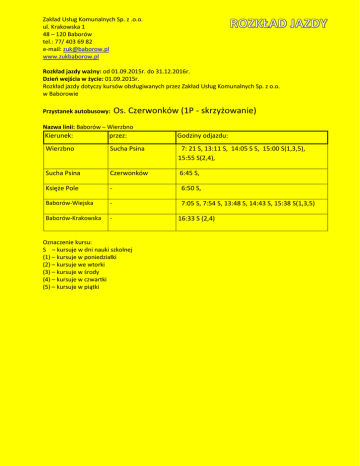 Zakład Usług Komunalnych Sp. z .o.o. ul. Krakowska 1 48 – 120 Baborów tel.: 77/ 403 69 82 e-mail: [email protected] www.zukbaborow.pl Rozkład jazdy ważny: od 01.09.2015r. do 31.12.2016r. Dzień wejścia w życie: 01.09.2015r. Rozkład jazdy dotyczy kursów obsługiwanych przez Zakład Usług Komunalnych Sp. z o.o. w Baborowie Przystanek autobusowy: Os. Czerwonków (1P - skrzyżowanie) Nazwa linii: Baborów – Wierzbno Kierunek: przez: Godziny odjazdu: Wierzbno Sucha Psina 7: 21 S, 13:11 S, 14:05 S S, 15:00 S(1,3,5), 15:55 S(2,4), Sucha Psina Czerwonków 6:45 S, Księże Pole - 6:50 S, Baborów-Wiejska - 7:05 S, 7:54 S, 13:48 S, 14:43 S, 15:38 S(1,3,5) Baborów-Krakowska - Oznaczenie kursu: S – kursuje w dni nauki szkolnej (1) – kursuje w poniedziałki (2) – kursuje we wtorki (3) – kursuje w środy (4) – kursuje w czwartki (5) – kursuje w piątki 16:33 S (2,4)