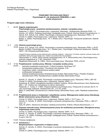 Dr Patrycja Rudnicka Katedra Psychologii Pracy i Organizacji PODSTAWY PSYCHOLOGII PRACY Psychologia III, rok akademicki 2008/2009, s. letni studia stacjonarne Program zajęć wraz z literaturą: 1 24.02 Zajęcia organizacyjne Psychologia pracy - przedmiot zainteresowania, metody i narzędzia pracy Ratajczak, Z. (2007). Psychologia pracy i organizacji. Warszawa : Wydawnictwo Naukowe PWN, r. 9 Karney, J.E. (2004). Podstawy psychologii i pedagogiki pracy. Pułtusk: Wyższa Szkoła Humanistyczna, r.1 Schulz, D.P., Schulz, S.E. (2002). Psychologia a wyzwania dzisiejszej pracy. Warszawa: PWN, r. 2 Chmiel, N. (2000). Psychologia pracy i organizacji. Gdańsk: GWP, r. 2 Bańka, A. (2000). Psychologia pracy . W: J. Strelau (red.). Psychologia. Podręcznik akademicki. Gdańsk: GWP, r. 50. 2, 3 3.03 Historia psychologii pracy 10.03 Schulz, D.P., Schulz, S.E. (2002). Psychologia a wyzwania dzisiejszej pracy. Warszawa: PWN, s. 29-32 Bańka, A.(2000). Psychologia pracy . W: J. Strelau (red.). Psychologia. Podręcznik akademicki. Gdańsk: GWP, r. 50.3 Rozwój psychologii pracy. Uwaga! Poniższe materiały proszę traktować jako materiały źródłowe – historyczne. W trakcie czytania i podczas analizy tych materiałów należy brać pod uwagę czas, miejsce oraz okoliczności ich powstania. Gliszczyńska, X. (1979). Zarys rozwoju psychologii pracy. W: X. Gliszczyńska (red.) Psychologia pracy: wybrane zagadnienia (s. 7-25). Warszawa: PWN. Biegeleisen-Żelazowski, B. (1963). Zarys psychologii pracy. Warszawa: PWN, s.20-22. 4, 5 17.03 Projektowanie i analiza pracy. Metody i narzędzia analizy pracy 24.03 – technika incydentów krytycznych / Critical Incidents Technique CIT – funkcjonalna analiza pracy / Functional Job Analysis, FJA – inwentarze zadań, hierarchiczna analiza zadań – profilowanie kompetencji – metody kwestionariuszowe (Kwestionariusz Analizy Stanowiska Pracy / Position Analysis Questionnaire PAQ, Kwestionariusz Lubelski Analizy Stanowiska Pracy) Schultz, D., Schultz, S. (2003). Psychologia a wyzwania dzisiejszej pracy. Warszawa. PWN, s.98-102 Chmiel, N. (2000). Psychologia pracy i organizacji. Gdańsk: GWP, r. 3 Armstrong, M. (2000). Zarządzanie zasobami ludzkimi. Kraków. Oficyna Ekonomiczna. Dom Wydawniczy ABC, r. 22 - Analiza roli i kompetencji na danym stanowisku Ratajczak, Z., Turska, E. (1983). Eksperymentalna psychologia pracy. Podręcznik do ćwiczeń dla III i IV roku psychologii. Katowice. Wydawnictwo UŚ., s.41-43, aneks Biela, A. (red)(1992). Kwestionariusz Lubelski Analizy Stanowiska Pracy. Lublin. Redakcja wydawnictwo KUL. 6 31.03 Projektowanie pracy a motywacja i satysfakcja z pracy. Wzbogacanie zadań pracy (Herzberg). Model właściwości pracy (Hackman i Oldham) Chmiel, N. (2000). Psychologia pracy i organizacji. Gdańsk: GWP, s. 75-77 oraz r. 13 Schultz, D., Schultz, S. (2003). Psychologia a wyzwania dzisiejszej pracy. Warszawa. PWN, s. 296-317 oraz r. 8 Dale, M. (2001). Skuteczna rekrutacja i selekcja pracowników. Kraków. Oficyna Ekonomiczna, r. 2 7 7.04 Fizyczne warunki pracy. Dostosowywania pracy do możliwości pracownika. Obciążenie pracą. Organizacja czasu pracy Chmiel, N. (2000). Psychologia pracy i organizacji. Gdańsk: GWP, r. 8, 9. Schultz, D., Schultz, S. (2003). Psychologia a wyzwania dzisiejszej pracy. Warszawa. PWN, r. 10 Karney, J. E. (2004). Podstawy psychologii i pedagogiki pracy. Pułtusk: Wyższa Szkoła Humanistyczna, r. 6 oraz s.125-141 14.04 Przerwa świąteczna 8 21.04 Kolokwium I Bezpieczeństwo i ergonomia w miejscu pracy Schultz, D., Schultz, S. (2003). Psychologia a wyzwania dzisiejszej pracy. Warszawa. PWN, r. 11, s. 388-404 Chmiel, N. (2000). Psychologia pracy i organizacji. Gdańsk: GWP, r. 11 9 28.04 Nowe technologie a praca Chmiel, N. (2000). Psychologia pracy i organizacji. Gdańsk: GWP, r. 10 Rudnicka, P. (2007). Praca a rozwój technologii informacyjnych. W: B. Kożusznik i M Górnik-Durose (red.). Perspektywy psychologii pracy (s. 103-119). Katowice: Wydawnictwo UŚ. 10 5.05 Społeczne warunki pracy. Wyzwania współczesnego rynku pracy. Równowaga praca-życie Chmiel, N. (2000). Psychologia pracy i organizacji. Gdańsk: GWP, r. 17, 18 Schultz, D., Schultz, S. (2003). Psychologia a wyzwania dzisiejszej pracy. Warszawa. PWN, s. 32-35. Górnik-Durose, M.. (2007). Praca w wielokulturowym otoczeniu. W: B. Kożusznik i M Górnik-Durose (red.). Perspektywy psychologii pracy (s. 82-102). Katowice: Wydawnictwo UŚ. 11 12.05 Przygotowanie projektu grupowego – studium przypadku. 12 19.05 Stres zawodowy Chmiel, N. (2000). Psychologia pracy i organizacji. Gdańsk: GWP, r.7 Schultz, D., Schultz, S. (2003). Psychologia a wyzwania dzisiejszej pracy. Warszawa. PWN, r.12 Dudek, B. (2007). Stres związany z pracą: teoretyczne i metodologiczne podstawy badań zależności między zdrowiem a stresem zawodowym. W: B. Kożusznik i M Górnik-Durose (red.) Perspektywy psychologii pracy (s. 220-244). Katowice: Wydawnictwo UŚ. 13 26.05 Termin przesyłania projektów grupoweych ([email protected]) Negatywne konsekwencje pracy – wypalenie zawodowe Sęk, H. (2006). Wypalenie zawodowe. Przyczyny i zapobieganie. Gdańsk: GWP. 14 2.06 Kolokwium II Omówienie prac grupowych. Podsumowanie zajęć. Warunki uzyskania zaliczenia Kolokwium I, II – do 200 pkt Projekt grupowy – do 100 pkt Aktywny udział w zajęciach, praca w małych grupach – należy uzbierać 50 pkt, aby uzyskać zaliczenie Prezentacja – do 50 pkt Punktacja i skala ocen bdb ~90-100% 400-360 pkt db+ ~80-89% 320-359 pkt db ~70-79% 280-319 pkt dst+ ~60-69% 240-279 pkt dst ~50-59% 200-239 pkt Kolokwium Test wiadomości (wielokrotnego wyboru i uzupełnień) w oparciu o literaturę przedstawioną w programie zajęć oraz materiały do zajęć zamieszczane na mojej stronie internetowej. Oceny z kolokwium będą przeliczane na punkty według następujących zasad: bdb db+ db dst+ dst 100 pkt 90 pkt 80 pkt 70 pkt 60 pkt Projekt grupowy – studium przypadku Celem projektu grupowego 