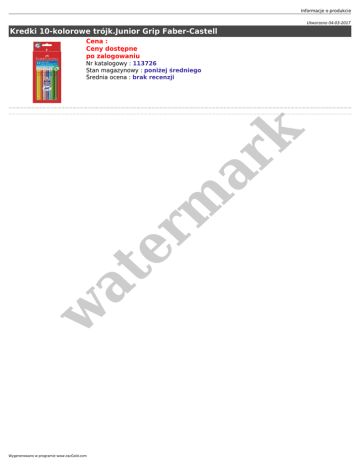 Informacje o produkcie Utworzono 04-03-2017 Kredki 10-kolorowe trójk.Junior Grip Faber-Castell Cena : Ceny dostępne po zalogowaniu w at er m ar k Nr katalogowy : 113726 Stan magazynowy : poniżej średniego Średnia ocena : brak recenzji Wygenerowano w programie www.oscGold.com