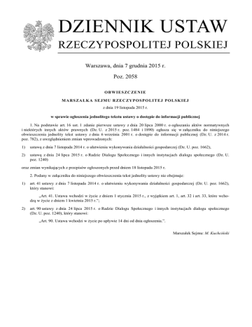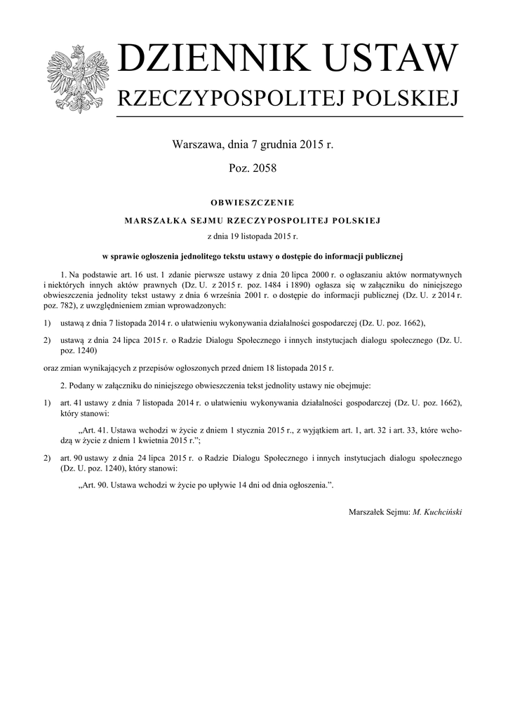 DZIENNIK USTAW RZECZYPOSPOLITEJ POLSKIEJ Warszawa, dnia 7 grudnia 2015 r. Poz. 2058 O B W IE S ZC ZE N I E M ARS ZA ŁK A S EJ M U R ZE C ZY P O S PO LI T EJ PO L SK I EJ z dnia 19 listopada 2015 r. w sprawie ogłoszenia jednolitego tekstu ustawy o dostępie do informacji publicznej 1. Na podstawie art. 16 ust. 1 zdanie pierwsze ustawy z dnia 20 lipca 2000 r. o ogłaszaniu aktów normatywnych i niektórych innych aktów prawnych (Dz. U. z 2015 r. poz. 1484 i 1890) ogłasza się w załączniku do niniejszego obwieszczenia jednolity tekst ustawy z dnia 6 września 2001 r. o dostępie do informacji publicznej (Dz. U. z 2014 r. poz. 782), z uwzględnieniem zmian wprowadzonych: 1) ustawą z dnia 7 listopada 2014 r. o ułatwieniu wykonywania działalności gospodarczej (Dz. U. poz. 1662), 2) ustawą z dnia 24 lipca 2015 r. o Radzie Dialogu Społecznego i innych instytucjach dialogu społecznego (Dz. U. poz. 1240) oraz zmian wynikających z przepisów ogłoszonych przed dniem 18 listopada 2015 r. 2. Podany w załączniku do niniejszego obwieszczenia tekst jednolity ustawy nie obejmuje: 1) art. 41 ustawy z dnia 7 listopada 2014 r. o ułatwieniu wykonywania działalności gospodarczej (Dz. U. poz. 1662), który stanowi: „Art. 41. Ustawa wchodzi w życie z dniem 1 stycznia 2015 r., z wyjątkiem art. 1, art. 32 i art. 33, które wchodzą w życie z dniem 1 kwietnia 2015 r.”; 2) art. 90 ustawy z dnia 24 lipca 2015 r. o Radzie Dialogu Społecznego i innych instytucjach dialogu społecznego (Dz. U. poz. 1240), który stanowi: „Art. 90. Ustawa wchodzi w życie po upływie 14 dni od dnia ogłoszenia.”. Marszałek Sejmu: M. Kuchciński Dziennik Ustaw –2– Poz. 2058 Załącznik do obwieszczenia Marszałka Sejmu Rzeczypospolitej Polskiej z dnia 19 listopada 2015 r. (poz. 2058) US T AW A z dnia 6 września 2001 r. o dostępie do informacji publicznej1) Rozdział 1 Przepisy ogólne Art. 1. 1. Każda informacja o sprawach publicznych stanowi informację publiczną w rozumieniu ustawy i podlega udostępnieniu i ponownemu wykorzystywaniu na zasadach i w trybie określonych w niniejszej ustawie. 2. Przepisy ustawy nie naruszają przepisów innych ustaw określających odmienne zasady i tryb dostępu do informacji będących informacjami publicznymi, pod warunkiem że nie ograniczają obowiązków przekazywania informacji publicznej do centralnego repozytorium informacji publicznej, o którym mowa w art. 9b ust. 1, zwanym dalej „centralnym repozytorium”. 3. Przepisów ustawy w zakresie przekazywania informacji publicznej do centralnego repozytorium oraz jej udostępniania w tym repozytorium nie stosuje się do: 1) centralnej bazy danych ksiąg wieczystych, o której mowa w art. 363 ust. 1 ustawy z dnia 6 lipca 1982 r. o księgach wieczystych i hipotece (Dz. U. z 2013 r. poz. 707, z późn. zm.2)); 2) Krajowego Rejestru Karnego, o którym mowa w art. 1 ustawy z dnia 24 maja 2000 r. o Krajowym Rejestrze Karnym (Dz. U. z 2015 r. poz. 1036 i 1629); 3) Krajowego Rejestru Sądowego, o którym mowa w art. 1 ustawy z dnia 20 sierpnia 1997 r. o Krajowym Rejestrze Sądowym (Dz. U. z 2015 r. poz. 1142) oraz elektronicznego katalogu dokumentów spółek, o którym mowa w art. 4 ust. 2 pkt 1 tej ustawy; 4) rejestru zastawów, o którym mowa w art. 36 ust. 1 ustawy z dnia 6 grudnia 1996 r. o zastawie rejestrowym i rejestrze zastawów (Dz. U. z 2009 r. Nr 67, poz. 569, z późn. zm.3)). Art. 2. 1. Każdemu przysługuje, z zastrzeżeniem art. 5, prawo dostępu do informacji publicznej, zwane dalej „prawem do informacji publicznej”. 2. Od osoby wykonującej prawo do informacji publicznej nie wolno żądać wykazania interesu prawnego lub faktycznego. Art. 2a. 1. Każdemu przysługuje, z zastrzeżeniem art. 5, prawo do ponownego wykorzystywania informacji publicznej. 2. Zasady ponownego wykorzystywania informacji publicznej nie naruszają prawa dostępu do informacji publicznej ani wolności jej rozpowszechniania. Art. 3. 1. Prawo do informacji publicznej obejmuje uprawnienia do: 1) uzyskania informacji publicznej, w tym uzyskania informacji przetworzonej w takim zakresie, w jakim jest to szczególnie istotne dla interesu publicznego; 2) wglądu do dokumentów urzędowych; 3) dostępu do posiedzeń kolegialnych organów władzy publicznej pochodzących z powszechnych wyborów. 1) 2) 3) Niniejsza ustawa wdraża dyrektywę 2003/98/WE Parlamentu Europejskiego i Rady z dnia 17 listopada 2003 r. w sprawie ponownego wykorzystywania informacji sektora publicznego (Dz. Urz. UE L 345 z 31.12.2003, str. 90). Zmiany tekstu jednolitego wymienionej ustawy zostały ogłoszone w Dz. U. z 2013 r. poz. 830, 941, 1289 i 1641 oraz z 2015 r. poz. 218, 978 i 1433. Zmiany tekstu jednolitego wymienionej ustawy zostały ogłoszone w Dz. U. z 2009 r. Nr 69, poz. 595 i Nr 215, poz. 1663 oraz z 2015 r. poz. 978 i 1045. Dziennik Ustaw –3– Poz. 2058 2. Prawo do informacji publicznej obejmuje uprawnienie do niezwłocznego uzyskania informacji publicznej zawierającej aktualną wiedzę o sprawach publicznych. Art. 4. 1. Obowiązane do udostępniania informacji publicznej są władze publiczne oraz inne podmioty wykonujące zadania publiczne, w szczególności: 1) organy władzy publicznej; 2) organy samorządów gospodarczych i zawodowych; 3) podmioty reprezentujące zgodnie z odrębnymi przepisami Skarb Państwa; 4) podmioty reprezentujące państwowe osoby prawne albo osoby prawne samorządu terytorialnego oraz podmioty reprezentujące inne państwowe jednostki organizacyjne albo jednostki organizacyjne samorządu terytorialnego; 5) podmioty reprezentujące inne osoby lub jednostki organizacyjne, które wykonują zadania publiczne lub dysponują majątkiem publicznym, oraz osoby prawne, w których Skarb Państwa, jednostki samorządu terytorialnego lub samorządu gospodarczego albo zawodowego mają pozycję dominującą w rozumieniu przepisów o ochronie konkurencji i konsumentów. 2.4) Obowiązane do udostępnienia informacji publiczne