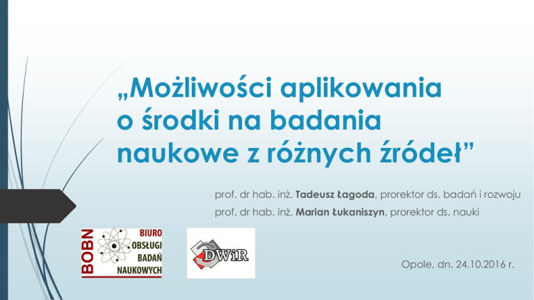 „Możliwości aplikowania o środki na badania naukowe z różnych źródeł” prof. dr hab. inż. Tadeusz Łagoda, prorektor ds. badań i rozwoju prof. dr hab. inż. Marian Łukaniszyn, prorektor ds. nauki Opole, dn. 24.10.2016 r. „Możliwości aplikowania o środki na badania naukowe z NCN, MNiSW i FNP” Opole, dn. 24.10.2016 r. Plan prezentacji Biuro Obsługi Badań Naukowych – w kilku słowach Narodowe Centrum Nauki- instytucja finansująca badania naukowe Informacja o aktualnie otwartych naborach Przedstawienie informacji o konkursach Projekty Ministerstwa Nauki i Szkolnictwa Wyższego Projekty Fundacji na rzecz Nauki Polskiej Gdzie warto zajrzeć? – ciekawe linki Działalność Biura Obsługi Badań Naukowych Informujemy o naborach Pomagamy przygotować wniosek Sprawdzamy wniosek pod względem formalnym Zdobywamy podpisy władz uczelni Informujemy o wynikach konkursów Pomagamy przy przygotowaniu/zmianach umów Pomagamy w raportowaniu oraz rozliczaniu projektów www.bobn.po.opole.pl Biuro Obsługi Badań Naukowych Kontakt: Opole, ul. Prószkowa 76, bud. 7, p. 14 tel. 77 449 81 72, 449 81 71 e-mail: [email protected] [email protected] [email protected] Liczba wniosków projektowych i projektów realizowanych w latach 2014-2016 Liczba wniosków projektowych NCN MNiSW inne 2013 24 bd. bd. 2014 28 5 5 2015 21 4 6 2016 15 5 1 Liczba realizowanych projektów NCN MNiSW inne 2013 21 9 - 2014 12 7 - 2015 9 5 - 2016 8 2 - Od wniosku projektowego do końcowego rozliczenia Przygotowanie wniosku Sprawdzenie kwalifikowalności kosztów przez Kwesturę i wstępna kontrola przez BOBN Wydruk ostatecznej wersji wniosku i podpisanie go przez Dziekana i kierownika projektu Kontrola formalna ostatecznego wniosku przez BOBN Podpisanie wniosku przez Kwestora i Prorektora ds. badań i rozwoju Wysłanie wniosku w wersji papierowej przez BOBN (Wysłanie wniosku w formie elektronicznej) Decyzja Decyzja Pozytywna Negatywna Ponowienie wniosku Przygotowanie/ wygenerowanie umowy Podpisanie umowy przez Dziekana i kierownika projektu Podpisanie umowy przez Kwestora i Prorektora ds. badań i rozwoju Wysłanie umowy do instytucji finansującej przez BOBN Otrzymanie podpisanej umowy Realizacja projektu Aneksowanie umowy Raport roczny/ Raport końcowy Decyzja o rozliczeniu projektu i wykonaniu umowy Narodowe Centrum Nauki Badania podstawowe- „oryginalne prace badawcze eksperymentalne lub teoretyczne podejmowane przede wszystkim w celu zdobywania nowej wiedzy o podstawach zjawisk i obserwowalnych faktów bez nastawienia na bezpośrednie zastosowanie komercyjne” Wnioski w oczywisty sposób aplikacyjne, nie mogą być finansowane przez NCN. „Praktyczna przydatność" wyników badań wcale nie musi dyskwalifikować ich „podstawowości”. Nie są odrzucane wnioski z tego powodu , że wyniki proponowanych badań mogą stanowić punkt wyjścia do badań stosowanych i których wnioskodawcy nie ukrywają motywacji wykorzystania możliwości ich kontynuacji w postaci wdrożenia w praktyce gospodarczej i społecznej. Harmonogram naboru wniosków Rodzaj konkursu 2016 Rozpoczęcie naboru Zakończenie naboru Rozstrzygnięcie konkursu wniosków wniosków do 15 marca 15 czerwca 15 grudnia 15 września 15 grudnia 15 czerwca 2017 15 marca 15 czerwca 15 grudnia 15 września 15 grudnia 15 czerwca 2017 15 marca 15 czerwca 15 grudnia 15 września 15 grudnia 15 czerwca 2017 SONATA BIS HARMONIA MAESTRO 15 czerwca 15 czerwca 15 czerwca 15 września 15 września 15 września 15 marca 2017 15 marca 2017 15 marca 2017 SONATINA 15 grudnia 15 marca 2017 15 września 2017 ETIUDA 15 grudnia 15 marca 2017 15 września 2017 UWERTURA 15 grudnia 15 marca 2017 15 września 2017 POLONEZ 15 marca 15 września 15 czerwca 15 grudnia 15 grudnia 30 maja 2017 BEETHOVEN 15 września 15 grudnia 31 października 2017 OPUS PRELUDIUM SONATA Wybrane konkursy NCN PRELUDIUM na projekty badawcze realizowane przez osoby rozpoczynające karierę naukową, nieposiadające stopnia naukowego doktora OPUS na projekty badawcze, w tym finansowanie zakupu lub wytworzenia aparatury naukowo-badawczej niezbędnej do realizacji tych projektów SONATA na projekty badawcze realizowane przez osoby rozpoczynające karierę naukową, które uzyskały stopień naukowy doktora nie wcześniej niż 7 lat przed rokiem wystąpienia z wnioskiem, w którym możliwe jest stworzenie unikatowego warsztatu naukowego POLONEZ konkurs dla naukowców przyjeżdżających z zagranicy BEETHOVEN konkurs na polsko-niemieckie projekty badawcze z zakresu nauk humanistycznych, społecznych i o sztuce oraz wybranych dyscyplin nauk ścisłych i technicznych, realizowane przez zespoły polsko-niemieckie UWERTURA na staże w zagranicznych zespołach naukowych realizujących granty ERC SONATINA dla naukowców do 3 lat po doktoracie na sfinansowanie ich etatów badawczych oraz krótkoterminowych (3-6-miesięcznych) staży zagranicznych Ogólne informacje nt. konkursów NCN Kierownik może wystąpić w danej edycji konkursów z jednym wnioskiem; Jednocześnie można kierować maksymalnie dwoma projektami NCN; Jako kierownik może wystąpić również osoba fizyczna, niezatrudniona w Uczelni. Po otrzymaniu grantu osoby fizyczne zatrudniane są w Politechnice Opolskiej na podstawie ustalonej wcześniej formy zatrudnienia; Wnioski składamy w dwóch językach – szczegółowy opis projektu - po angielsku, skrócony - po polsku, pozostałe części wniosku w jednym lub dwóch językach; Finansowanie projektach obejmuje w szczególności: wynagrodzenia, aparaturę, delegacje, konferencje, zakupy, materiały, wyposażenie, usługi, koszty wydania publikacji, itp. Wnioski składane są ze wskazaniem panelu dyscyplin wybranego z listy paneli NCN PRELUDIUM Adresaci Osoby rozpoczynające karierę naukową nieposiadające stopnia naukowego doktora Kryteria Czas realizacji projektu: 12, 24 lub 36 miesięcy Wysokość finansowania: 50 tys. zł na 12 miesięcy; 100 tys. zł na 24 miesięcy; 150 tys. zł na 36 mi