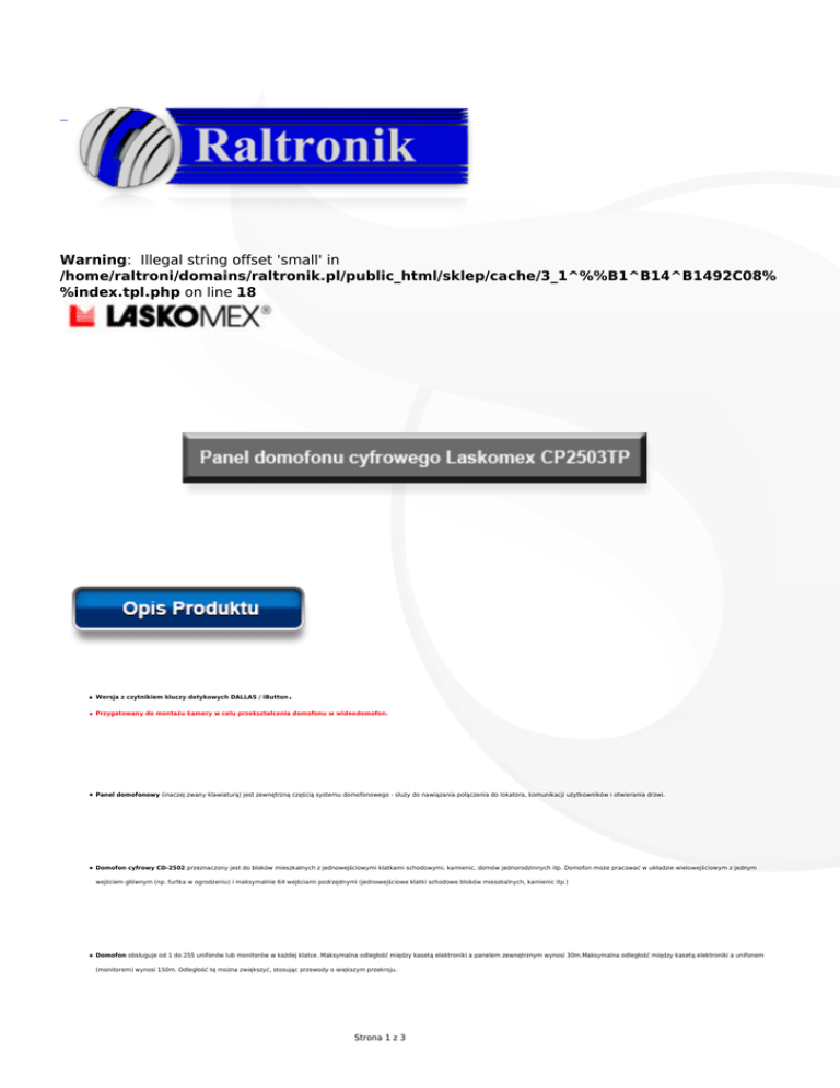 Warning: Illegal string offset 'small' in /home/raltroni/domains/raltronik.pl/public_html/sklep/cache/3_1^%%B1^B14^B1492C08% %index.tpl.php on line 18 Wersja z czytnikiem kluczy dotykowych DALLAS / iButton . Przygotowany do montażu kamery w celu przekształcenia domofonu w wideodomofon. Panel domofonowy (inaczej zwany klawiaturą) jest zewnętrzną częścią systemu domofonowego - służy do nawiązania połączenia do lokatora, komunikacji użytkowników i otwierania drzwi. Domofon cyfrowy CD-2502 przeznaczony jest do bloków mieszkalnych z jednowejściowymi klatkami schodowymi, kamienic, domów jednorodzinnych itp. Domofon może pracować w układzie wielowejściowym z jednym wejściem głównym (np. furtka w ogrodzeniu) i maksymalnie 64 wejściami podrzędnymi (jednowejściowe klatki schodowe bloków mieszkalnych, kamienic itp.) Domofon obsługuje od 1 do 255 unifonów lub monitorów w każdej klatce. Maksymalna odległość między kasetą elektroniki a panelem zewnętrznym wynosi 30m.Maksymalna odległość między kasetą elektroniki a unifonem (monitorem) wynosi 150m. Odległość tę można zwiększyć, stosując przewody o większym przekroju. Strona 1 z 3 Możliwość budowy systemu domofonowego z jednym wejściem głównym i wejściami podrzędnymi. Podświetlana klawiatura. Zamek szyfrowy z kodem wejściowym indywidualnym dla każdego lokalu. Domofon dostępny jest w wersji audio i wideo. W domofonie wykorzystuje się tylko jeden rodzaj kasety elektroniki. Przeznaczenie (obsługa wejścia głównego lub obsługa wejścia podrzędnego) definiuje instalator. Do kasety elektroniki można podłączyć akumulator, umożliwiający pracę domofonu po zaniku napięcia w sieci energetycznej. Indywidualne dla każdego mieszkania nastawy tonu, długości i głośności wywołania. Funkcja przekierowania numerów wybranych z klawiatury pod jeden numer unifonu. Doskonałe rozwiązanie w domku jednorodzinnym, firmie lub instytucji, gdzie montowany jest tylko jeden unifon. Klawiatura optyczna pełni jednocześnie rolę zamka szyfrowego. Do każdego lokalu przypisany jest czterocyfrowy kod zamka. Funkcja "szybkie wejście" w systemie z wejściem głównym. Lokator może uaktywnić tą funkcję po odblokowaniu osobie odwiedzającej wejścia głównego. Dzięki niej osoba ta nie musi ponownie łączyć się z tym samym lokalem z poziomu wejścia podrzędnego, wystarczy, że wybierze z klawiatury przy wejściu prowadzącym bezpośrednio do lokalu jego numer, aby wejście zostało automatycznie odblokowane. Panele zewnętrzne domofonu wyposażone są w klawiaturę optyczną. Kolor: 1 - Czarny. Strona 2 z 3 Dwużyłowa instalacja cyfrowa . Przedstawiony panel nie stanowi całości instalacji domofonowej - do jego działania wymagana jest jeszcze kaseta elektroniki oraz zasilacz - dostępne w naszym sklepie internetowym. Strona 3 z 3