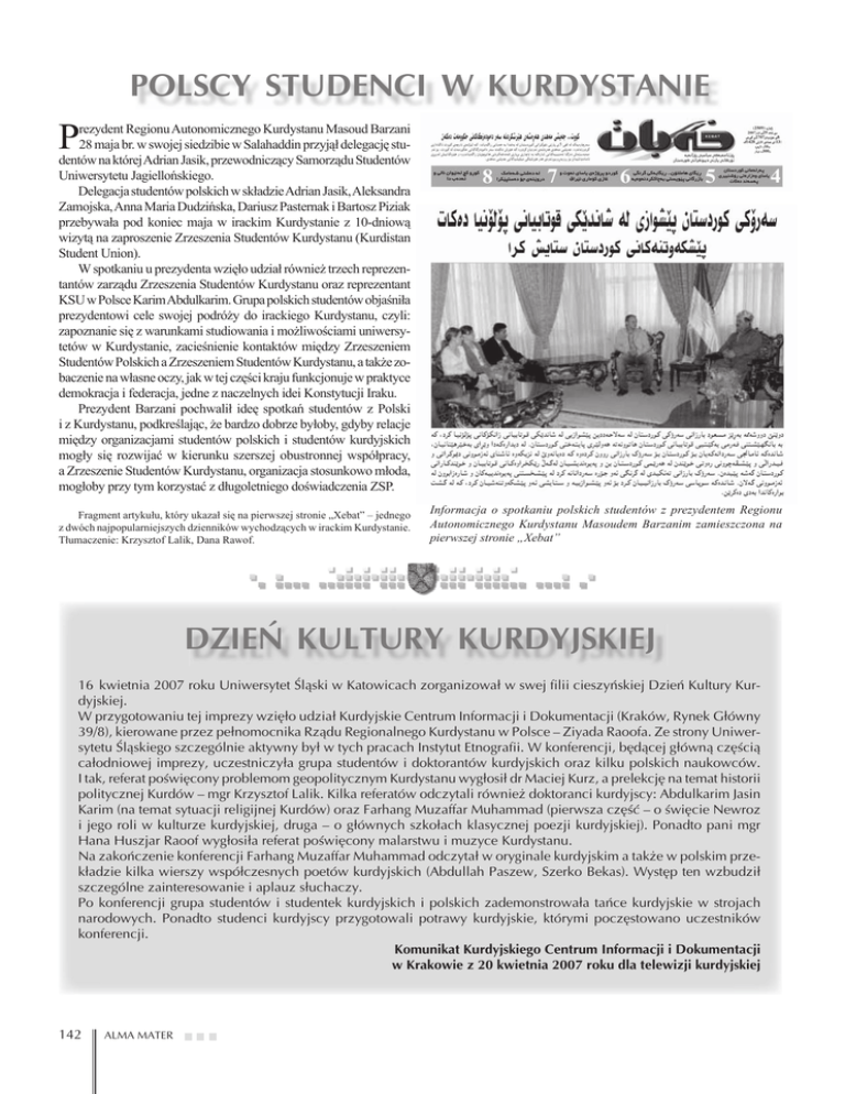 POLSCY STUDENCI W KURDYSTANIE P rezydent Regionu Autonomicznego Kurdystanu Masoud Barzani 28 maja br. w swojej siedzibie w Salahaddin przyjął delegację studentów na której Adrian Jasik, przewodniczący Samorządu Studentów Uniwersytetu Jagiellońskiego. Delegacja studentów polskich w składzie Adrian Jasik, Aleksandra Zamojska, Anna Maria Dudzińska, Dariusz Pasternak i Bartosz Piziak przebywała pod koniec maja w irackim Kurdystanie z 10-dniową wizytą na zaproszenie Zrzeszenia Studentów Kurdystanu (Kurdistan Student Union). W spotkaniu u prezydenta wzięło udział również trzech reprezentantów zarządu Zrzeszenia Studentów Kurdystanu oraz reprezentant KSU w Polsce Karim Abdulkarim. Grupa polskich studentów objaśniła prezydentowi cele swojej podróży do irackiego Kurdystanu, czyli: zapoznanie się z warunkami studiowania i możliwościami uniwersytetów w Kurdystanie, zacieśnienie kontaktów między Zrzeszeniem Studentów Polskich a Zrzeszeniem Studentów Kurdystanu, a także zobaczenie na własne oczy, jak w tej części kraju funkcjonuje w praktyce demokracja i federacja, jedne z naczelnych idei Konstytucji Iraku. Prezydent Barzani pochwalił ideę spotkań studentów z Polski i z Kurdystanu, podkreślając, że bardzo dobrze byłoby, gdyby relacje między organizacjami studentów polskich i studentów kurdyjskich mogły się rozwijać w kierunku szerszej obustronnej współpracy, a Zrzeszenie Studentów Kurdystanu, organizacja stosunkowo młoda, mogłoby przy tym korzystać z długoletniego doświadczenia ZSP. Fragment artykułu, który ukazał się na pierwszej stronie „Xebat” – jednego z dwóch najpopularniejszych dzienników wychodzących w irackim Kurdystanie. Tłumaczenie: Krzysztof Lalik, Dana Rawof. Informacja o spotkaniu polskich studentów z prezydentem Regionu Autonomicznego Kurdystanu Masoudem Barzanim zamieszczona na pierwszej stronie „Xebat” DZIEŃ KULTURY KURDYJSKIEJ 16 kwietnia 2007 roku Uniwersytet Śląski w Katowicach zorganizował w swej filii cieszyńskiej Dzień Kultury Kurdyjskiej. W przygotowaniu tej imprezy wzięło udział Kurdyjskie Centrum Informacji i Dokumentacji (Kraków, Rynek Główny 39/8), kierowane przez pełnomocnika Rządu Regionalnego Kurdystanu w Polsce – Ziyada Raoofa. Ze strony Uniwersytetu Śląskiego szczególnie aktywny był w tych pracach Instytut Etnografii. W konferencji, będącej główną częścią całodniowej imprezy, uczestniczyła grupa studentów i doktorantów kurdyjskich oraz kilku polskich naukowców. I tak, referat poświęcony problemom geopolitycznym Kurdystanu wygłosił dr Maciej Kurz, a prelekcję na temat historii politycznej Kurdów – mgr Krzysztof Lalik. Kilka referatów odczytali również doktoranci kurdyjscy: Abdulkarim Jasin Karim (na temat sytuacji religijnej Kurdów) oraz Farhang Muzaffar Muhammad (pierwsza część – o święcie Newroz i jego roli w kulturze kurdyjskiej, druga – o głównych szkołach klasycznej poezji kurdyjskiej). Ponadto pani mgr Hana Huszjar Raoof wygłosiła referat poświęcony malarstwu i muzyce Kurdystanu. Na zakończenie konferencji Farhang Muzaffar Muhammad odczytał w oryginale kurdyjskim a także w polskim przekładzie kilka wierszy współczesnych poetów kurdyjskich (Abdullah Paszew, Szerko Bekas). Występ ten wzbudził szczególne zainteresowanie i aplauz słuchaczy. Po konferencji grupa studentów i studentek kurdyjskich i polskich zademonstrowała tańce kurdyjskie w strojach narodowych. Ponadto studenci kurdyjscy przygotowali potrawy kurdyjskie, którymi poczęstowano uczestników konferencji. Komunikat Kurdyjskiego Centrum Informacji i Dokumentacji w Krakowie z 20 kwietnia 2007 roku dla telewizji kurdyjskiej 142 ALMA MATER 16 kwietnia 2007 roku uczestniczyłem w konferencji poświęconej kulturze kurdyjskiej, zorganizowanej przez Instytut Etnografii Uniwersytetu Śląskiego (filia w Cieszynie) przy współpracy Kurdyjskiego Centrum Informacji i Dokumentacji w Krakowie (por. wyżej: Komunikat KCID). W ramach konferencji wygłosiłem referat w języku polskim, który składał się z dwóch części. Pierwsza dotyczyła święta Newroz (pierwszy dzień wiosny) i jego funkcji w kulturze kurdyjskiej. Mówiłem między innymi o legendach i zwyczajach kurdyjskich związanych z tym świętem. Druga część mojego referatu była poświęcona klasycznej poezji kurdyjskiej. Przedstawiłem jej genezę oraz główne szkoły literackie w następującym porządku. 1. Szkoła botańska (od nazwy prowincji Botan). Powstała w XVII wieku w Kurdystanie tureckim i używała dialektu kurmandżi. Najważniejszymi przedstawicielami tej szkoły byli poeci: Mela-j Dżyziri oraz Ahmad-i Chani. 2. Szkoła gorańska (od nazwy grupy plemion kurdyjskich Goran i ich dialektu), która rozwijała się w wiekach XVII–XVIII w dialekcie gorani w regionie Kurdystanu leżącym na pograniczu Iraku i Iranu. Głównymi ośrodkami tej szkoły były tereny zwane Hawraman (na terenie Iranu), a także miasto Halabdża w Iraku oraz miasto Kermanszah w Iranie. Głównymi przedstawicielami tej szkoły byli: Chana-j Qubadi i Besarani. 3. Szkoła babańska (od nazwy kurdyjskiego księstwa Baban, które istniało od końca XV do połowy XIX w.). Ośrodkami tej szkoły, działającej w XIX wieku, było miasto Sulejmanija w Kurdystanie irackim, a dialektem, którego używali w swej twórczości poeci tej szkoły (o imionach: Nali, Salim, Kurd), był dialekt sorani. Poetów tych określa się tradycyjnie mianem „trzech szczytów (gór) babańskich”. 4. Szkoła mukrijańska (od nazwy poddialektu mukri z grupy dialektalnej sorani). Rozwijała się na terenie Kurdystanu irańskiego od połowy XIX wieku do początków XX wieku. Głównymi przedstawicielami tej szkoły byli: Wafai, Heriq, Adib i Adab. Po wygłoszeniu referatu odczytałem w oryginale kilka wierszy dwu współczesnych poetów kurdyjskich: Szerko Bekasa i Abdullaha Paszewa. Udostępniłem przy tym słuchaczom polskie przekł