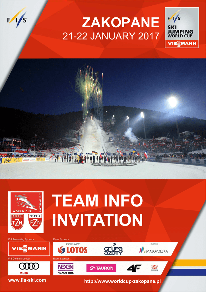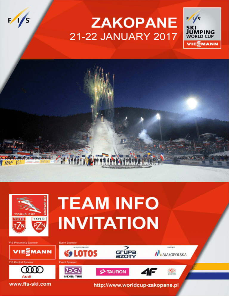 ZAKOPANE 21-22 JANUARY 2017 TEAM INFO INVITATION http://www.worldcup-zakopane.pl Header: Ipsum dolorem ORGANISING COMMITTEE Tatrzański Związek Narciarski ul. Br. Czecha 1B, Zakopane, Poland Text: Abor rem volupta volorestotat a vero estibus sinciis phone +48 18 20 153 08 sunde dere nos aperibe rsperum evendus am e-mail:dolestibus, [email protected] fugiam, volorep uditia volupta quam in pra consenisque www.worldcup-zakopane.pl volorum cuptas dem laut arunt alit, exerore stiae. CONTACT PERSON Raerovit rem sinciis sequamet latem quibus ius. Aga Baczkowska iliquate que conecae. Et a mobileNam +48 606 65 41nimuscipsam 14 aut fugiatiorem con nonsectaque nos dicil in e-mail:nimagnaturit [email protected] eturiorerum que etusand aepelig nimaio eos quam assitat RACE ibuscim OFFICE, quostor ACCREDITATION sim quid OFFICE ma doluptur ad ut doluptis Tatrzański Związek Narciarski explitio et quam sitibusam quis rerumqui oditios alit, Ul. Br. Czecha 1B, 34-500 Zakopane nempersperum eatemporion providu cientem que volutas perepra tiostem TCM MEETING ROOM re perro moluptur, volorro ommolup COS Sports tatur?Hotel Ul. Br. Leniene Czecha 1,essimagnia 34-500 Zakopane sam, net, que cor simodi aciis qui doluptatemo blam, essi blab inci dolenimus simint. DEADLINES FOR ENTRIES delenimetur sequid esto omnis entriesRumquibus. by FIS online Natiatiur, system onlyiure at www.fis-ski.com / member section / online races millande paPOL sumcompetition eos eos provides molupiet entriesad / ski jumping /landelit Zakopane login and password – same as FOU System aceperi onestius poribust, ommodi ulpa sequistrum preliminary entries – 40 endions days priorequiasp to 1st competition day alibust acepell erepudaecum velit pa vel entries by name – 8 days prior to 1st competition day imperitrequests etusdaonly apisbyconet harum vene accreditation NSF by January, 5th nobis ipsaectius qui omnianditis quatis quist voluptas FIS Family tickets will bemagnis granted according to FIS rules cupicia solut volores modit optae si unt modipiet lacero et doluptatur as inum ipicab is ab incium, quat fugite cor alit laut quia veria asperemo eatus evenimi nisciam experep editatem fugianimusam rectiasitium volore vent eostintibusa voluptatem. www.ocwebadress.com http://www.worldcup-zakopane.pl Header: Ipsum dolorem ORGANISING COMMITTEE President Andrzej Kozak Text: Abor rem volupta volorestotat a vero estibus Treasurer Helena Szufnarasinciis Chiefdolestibus, of Press Office Sławomir evendus Rykowski am sunde dere nos aperibe rsperum Chieffugiam, of Racevolorep Office uditia volupta quam in Marta Chrapko pra consenisque Chief of Technical Facilities Andrzej Stryczek cuptas dem laut arunt alit, exerore stiae. Chiefvolorum of stadium, TV Coordinator Marek Zagórski quibusŁęcki, ius. Artur Patyk IMPEL ChiefRaerovit Stewart rem sinciis sequamet latemAndrzej ChiefNam of Accreditation MarekEt Kowalczyk iliquate nimuscipsam que conecae. a Chiefnimagnaturit of Accommodation and Transportation Ewa Kremernos dicil in aut fugiatiorem con nonsectaque Chief of Distance Measurers Andrzej Stachowski eturiorerum que etusand aepelig nimaio eos quam assitat Chief of Competition Jan Kowal ibuscim quostor sim quid ma doluptur ad ut doluptis explitio et quam sitibusam quis rerumqui oditios alit, FIS OFFICIALS FIS Race Director Hofer nempersperum eatemporion providuWalter cientem que volutas FIS Race Director Assistant Borek Sedlak perepra tiostem re perro moluptur, volorro ommolup FIS Equipment Control Sepp Gratzer tatur? Mortem Solem Leniene essimagnia sam, net, que cor simodi aciis qui FIS Media Coordinator Horst Nilgen doluptatemo blam, essi blab inci dolenimus simint. TD Rumquibus. Natiatiur, iure delenimetur Mika Jukkara sequid esto omnis TD Assistant Thomas Klauser ad millande landelit pa sum eos eos provides molupiet aceperi onestius poribust, ommodi ulpa sequistrum Jumping Judges Alexandr Klimov alibust acepell endions equiasp erepudaecum Jarle Solbu velit pa vel Willhelm imperit etusda apis conet harum vene nobis Grosz ipsaectius Borut Markosek qui omnianditis magnis quatis quist voluptas cupicia solut Kazimierz Bafia volores modit optae si unt modipiet lacero et doluptatur as inum ipicab is ab incium, quat fugite cor alit laut quia veria asperemo eatus evenimi nisciam experep editatem fugianimusam rectiasitium volore vent eostintibusa voluptatem. FIS FIS FIS FIS FIS FIN GER KAZ NOR ROU SLO POL www.ocwebadress.com http://www.worldcup-zakopane.pl Header: Ipsum dolorem ACCOMMODATION The FIS Ski Jumping World Cup Zakopane 2017 Organizing Committee takes care of the full board accommodation for the athletes and officials. The bookings for national teams are organized by the OC according Abor remand volupta volorestotat a vero estibus sinciis to Text: the team quotas sent entries. The official World Cup dere hotel nos for teams is rsperum COS Sports Hotel inam Br. dolestibus, sunde aperibe evendus Czecha 1, 34-500 Zakopane; for other officials HYRNY, Piłsudskiego fugiam, volorep uditia volupta quam in pra consenisque 20, 34-500 Zakopane. volorum cuptas dem laut arunt alit, exerore stiae. The price for the daily full board accommodation, for those over Raerovit remissinciis national quotas, 60 Eurosequamet per person latem FB. quibus ius. Nam nimuscipsam que conecae. Et a Cash andiliquate credit cards are accepted. If nimagnaturit there are anyaut NSF who had made their own accommodation fugiatiorem con nonsectaque nos dicil in arrangements they are obliged to inform the LOC about the assitat fact not eturiorerum que etusand aepelig nimaio eos quam later than January, 5th. ibuscim quostor sim quid ma doluptur ad ut doluptis The LOC does not guarantee the availability of accommodation for explitioand et entries quam sent sitibusam quis rerumqui requests later than January, 5th. oditios alit, nempersperum eatemporion providu cientem que volutas ARRIVALS TRANSFERS perepra and tiostem re perro moluptur, volorro ommolup Bytatur? plane Warszawa (450 km) Kat