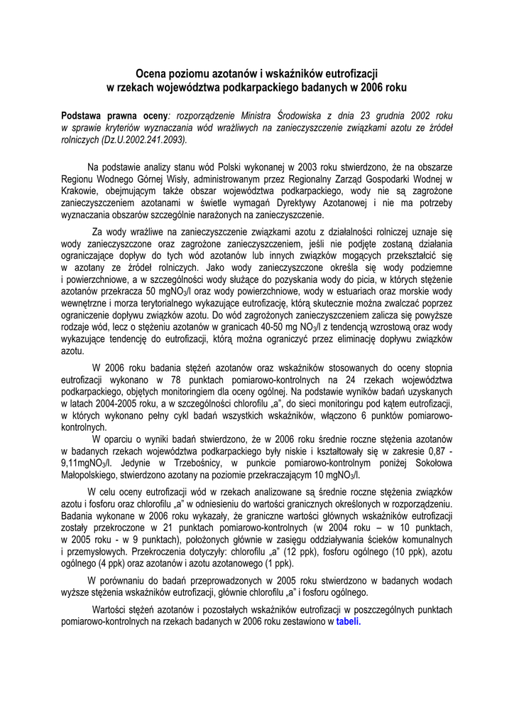 Ocena poziomu azotanów i wskaźników eutrofizacji w rzekach województwa podkarpackiego badanych w 2006 roku Podstawa prawna oceny: rozporządzenie Ministra Środowiska z dnia 23 grudnia 2002 roku w sprawie kryteriów wyznaczania wód wrażliwych na zanieczyszczenie związkami azotu ze źródeł rolniczych (Dz.U.2002.241.2093). Na podstawie analizy stanu wód Polski wykonanej w 2003 roku stwierdzono, że na obszarze Regionu Wodnego Górnej Wisły, administrowanym przez Regionalny Zarząd Gospodarki Wodnej w Krakowie, obejmującym także obszar województwa podkarpackiego, wody nie są zagrożone zanieczyszczeniem azotanami w świetle wymagań Dyrektywy Azotanowej i nie ma potrzeby wyznaczania obszarów szczególnie narażonych na zanieczyszczenie. Za wody wrażliwe na zanieczyszczenie związkami azotu z działalności rolniczej uznaje się wody zanieczyszczone oraz zagrożone zanieczyszczeniem, jeśli nie podjęte zostaną działania ograniczające dopływ do tych wód azotanów lub innych związków mogących przekształcić się w azotany ze źródeł rolniczych. Jako wody zanieczyszczone określa się wody podziemne i powierzchniowe, a w szczególności wody służące do pozyskania wody do picia, w których stężenie azotanów przekracza 50 mgNO3/l oraz wody powierzchniowe, wody w estuariach oraz morskie wody wewnętrzne i morza terytorialnego wykazujące eutrofizację, którą skutecznie można zwalczać poprzez ograniczenie dopływu związków azotu. Do wód zagrożonych zanieczyszczeniem zalicza się powyższe rodzaje wód, lecz o stężeniu azotanów w granicach 40-50 mg NO3/l z tendencją wzrostową oraz wody wykazujące tendencję do eutrofizacji, którą można ograniczyć przez eliminację dopływu związków azotu. W 2006 roku badania stężeń azotanów oraz wskaźników stosowanych do oceny stopnia eutrofizacji wykonano w 78 punktach pomiarowo-kontrolnych na 24 rzekach województwa podkarpackiego, objętych monitoringiem dla oceny ogólnej. Na podstawie wyników badań uzyskanych w latach 2004-2005 roku, a w szczególności chlorofilu „a”, do sieci monitoringu pod kątem eutrofizacji, w których wykonano pełny cykl badań wszystkich wskaźników, włączono 6 punktów pomiarowokontrolnych. W oparciu o wyniki badań stwierdzono, że w 2006 roku średnie roczne stężenia azotanów w badanych rzekach województwa podkarpackiego były niskie i kształtowały się w zakresie 0,87 9,11mgNO3/l. Jedynie w Trzebośnicy, w punkcie pomiarowo-kontrolnym poniżej Sokołowa Małopolskiego, stwierdzono azotany na poziomie przekraczającym 10 mgNO3/l. W celu oceny eutrofizacji wód w rzekach analizowane są średnie roczne stężenia związków azotu i fosforu oraz chlorofilu „a” w odniesieniu do wartości granicznych określonych w rozporządzeniu. Badania wykonane w 2006 roku wykazały, że graniczne wartości głównych wskaźników eutrofizacji zostały przekroczone w 21 punktach pomiarowo-kontrolnych (w 2004 roku – w 10 punktach, w 2005 roku - w 9 punktach), położonych głównie w zasięgu oddziaływania ścieków komunalnych i przemysłowych. Przekroczenia dotyczyły: chlorofilu „a” (12 ppk), fosforu ogólnego (10 ppk), azotu ogólnego (4 ppk) oraz azotanów i azotu azotanowego (1 ppk). W porównaniu do badań przeprowadzonych w 2005 roku stwierdzono w badanych wodach wyższe stężenia wskaźników eutrofizacji, głównie chlorofilu „a” i fosforu ogólnego. Wartości stężeń azotanów i pozostałych wskaźników eutrofizacji w poszczególnych punktach pomiarowo-kontrolnych na rzekach badanych w 2006 roku zestawiono w tabeli.