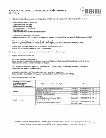 (JREHRU KRAJOWA DEKLARACJA Wt.ASCIWOSCI UZYTKOWYCH Nr. WP 04 Unlimited Polymer Solutions 1. Nazwa i nazwa handlowa wyrobu budowlanego: Elementy koncowe desek tarasowych, uszczelki i podkladki RELAZZO 2. Oznaczenie typu wyrobu budowlanego: - Zaslepki do deski puro 140 - Zaslepki do deski puro 194 - Listwa elastyczna do deski puro - Podkladki pod legary - Uszczelki do maskowania szczelin dylatacyjnych 3. Zamierzone zastosowanie lub zastosowania: - wykor'iczenie pod/6g, kt6re mog'l bye stosowane na zewn'ltrz pomieszczer'i (tarasy, werandy, balkony, pomosty, itp.) 4. Nazwa i adres siedziby producenta oraz miejsce produkcji wyrobu: REHAU Polymer Industrie GmbH Neulengbach, Edersberg 163, 3040 Neulengbach Tausendblum, Austria 5. Nazwa i adres siedziby upowainionego przedstawiciela, 0 ile zostal ustanowiony: REHAU Sp. z 0.0. ul. Poznar'iska 1a, 62-081 Przezmierowo 6. Krajowy system zastosowany do oceny i weryfikacji stalosci wlasciwosc: uiytkowych: 4 7. Krajowa Specyfikacja Techniczna: 7a. Polska Norma wyrobu: nie dotyczy Nazwa akredytowanej jednostki certyfikujqcej, numer akredytacji i numer krajowego certyfikatu lub nazwa akredytowanego laboralorumäaboraiorlowi numer akredytacji: nie dotyczy 7b. Krajowa ocena techniczna: Aprobata Techniczna ITB AT-15-8903/2013"Zestaw desek tarasowych i element6w uzupelnlajacych systemu REHAU-RELAZZO" Jednostka oceny technicznej / Krajowa jednostka oceny technicznej: nie dotyczy Nazwa akredytowanej jednostki certyfikujqcej, numer akredytacji i numer certyfikatu: nie dotyczy 8. Deklarowane wlasciwosci uiytkowe: Zasadnicze charakterystyki wyrobu budowlanego dia zamierzonego zastosowania lub zastosowar'i Material Ksztalt i wymiary Deklarowane w/asciwosci uZytkowe Zaslepki - kompozyt rnaczki drzewnej i PP Listwy elastyczne - PP Podkladki pod lecarv - EPDM Uszczelki - silikon lub EDPM Podkladki Grubosc: 3± 0,5mm, 5±0,5mm, 10±1mm szerokosc: 50 ± 1,5mm Zaslepki, listwy elastyczne i uszczelki Uwagi Zaodnie z ITB AT-15-8903/2013, Pkt. 3.4 Zgodnie z ITB AT-15-8903/2013, Pkt. 3.4 Zqodnie z ITB AT-15-8903/2013, Pkt. 3.4 Zgodnie z ITB AT-15-8903/2013, Pkt. 3.4 Zgodnie z ITB AT-15-8903/2013, Pkt. 3.4 Zgodnie z ITB AT-15-8903/2013, Pkt. 3.4, Rvsunki 5, 6, 13 i 14 REHAU Sp. Z 0.0. -Sprzedaz i Marketing· Baranowo, ul. Poznanska 1A . 62·081 Przezmierowo k. Poznania . Polska . tel.: (+48) 61 8498400· fax: (+48) 61 8498401 www.rehau.pl·Siedziba:Baranowo.uI.Poznanska1A·62·081Przeimierowok.Poznania·SqdRejonowyPoznan-NoweMiastoiWildawPoznaniu·VIII Wydzial Gospodarczy Krajowego Rejestru Sqdowego . Numer KRS: 0000049439· NIP: 781·00-16-806· Kapital zakladowy: 46 500 000 zl· Raiffeisen Bank Polska S.A. 531750 1019 0000 0000 00981017 9. W/asciwosci uiytkowe okresloneqo powyiej wyrobu sa zgodne z wszystkimi wymienionymi w pkt. 8 deklarowanymi w/asciwosciami uiytkowymi. Niniejsza krajowa deklaracja w/asciwosci uiytkowych wydana zostaje zgodnie z ustawa z dnia 16 kwietnia 2004r. 0 wyrobach budowlanych, na WY/qcznqodpowiedzialnosc producenta. W imieniu producenta podpisa/(-a): Michal Dymek, Dyrektor ds. handlowych (imi~inai~1 Poznan 02.01.2017 (miejsce i data wydania) f.~r~~ (podpis) . REHAU Sp. z 0.0. -Sprzedaz i Marketing. Baranowo, ul. Poznanska 1A· 62-081 Przeimierowo k. Poznania . Polska- tel.: (->48) 618498400· fax: (->48) 61 84 98 401 www.rehau.pISiedziba:Baranowo.uI.Poznanska1A·62-081Przeimierowok.Poznania·Sq_dRejonowyPoznan-NoweMiastoiWildawPoznaniu·VIIi Wydzial Gospodarczy Krajowego Rejestnu Sq_dowego . Numer KRS: 0000049439 . NIP: 781-00-16-806 . Kapital zakladowy: 46 500 000 zl- Raiffeisen Bank Polska SA 53 1750 1019000000000098 1017