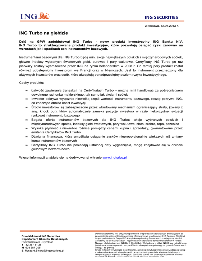 Warszawa, 12.06.2013 r. ING Turbo na giełdzie Dziś na GPW zadebiutował ING Turbo - nowy produkt inwestycyjny ING Banku N.V. ING Turbo to strukturyzowane produkt inwestycyjne, które pozwalają osiągać zyski zarówno na wzrostach jak i spadkach cen instrumentów bazowych. Instrumentami bazowymi dla ING Turbo będą min. akcje największych polskich i międzynarodowych spółek, główne indeksy wybranych światowych giełd, surowce i pary walutowe. Certyfikaty ING Turbo po raz pierwszy zostały wyemitowane przez ING na rynku holenderskim w 2008 r. Od tamtej pory produkt został również udostępniony inwestorom we Francji oraz w Niemczech. Jest to instrument przeznaczony dla aktywnych inwestorów oraz osób, które akceptują ponadprzeciętny poziom ryzyka inwestycyjnego. Cechy produktu: • • • • • • • Łatwość zawierania transakcji na Certyfikatach Turbo – można nimi handlować za pośrednictwem dowolnego rachunku maklerskiego, tak samo jak akcjami spółek Inwestor pokrywa wyłącznie niewielką część wartości instrumentu bazowego, resztę pokrywa ING, co znacząco obniża koszt inwestycji Środki inwestorów są zabezpieczone przez wbudowany mechanizm ograniczający straty, (zwany z ang. knock out), który automatycznie zamyka pozycje inwestora w razie niekorzystnej sytuacji rynkowej instrumentu bazowego Bogata oferta instrumentów bazowych dla ING Turbo: akcje wybranych polskich i międzynarodowych spółek, indeksy giełd światowych, pary walutowe, złoto, srebro, ropa, pszenica Wysoka płynność i niewielkie różnice pomiędzy cenami kupna i sprzedaży, gwarantowane przez emitenta Certyfikatów ING Turbo Dźwignia finansowa, która umożliwia osiąganie zysków nieproporcjonalnie większych niż zmiany kursu instrumentów bazowych Certyfikaty ING Turbo nie posiadają ustalonej daty wygaśnięcia, mogą znajdować się w obrocie giełdowym bezterminowo Więcej informacji znajduje się na dedykowanej witrynie www.ingturbo.pl Dom Maklerski ING Securities Departament Klientów Detalicznych Ryszard Sikora - Dyrektor T 32 357 81 28 M 603 387 205 E [email protected] Dom Maklerski ING jest aktywnym partnerem w operacjach kapitałowych zmierzającym do zaspokojenia potrzeb Klientów poprzez oferowanie we współpracy z ING Bankiem Śląskim i innymi podmiotami z Grupy ING kompleksowych usług finansowych o najwyższej jakości. Zaliczamy się do największych i najsilniejszych kapitałowo domów maklerskich w Polsce. Naszym właścicielem jest ING Bank Śląski S.A., Wchodzimy w skład ING Group - dzięki temu jesteśmy w stanie zapewnić naszym Klientom kompleksową obsługę na rynkach finansowych w kraju i za granicą. Grupa ING jest wywodzącą się z Holandii, globalną instytucją finansową świadczącą usługi z zakresu bankowości, ubezpieczeń i zarządzania aktywami dla klientów detalicznych i korporacyjnych w ponad 50 krajach. Zatrudnia ponad 114 tysięcy pracowników w wielu znakomitych firmach, które obsługują swoich klientów pod marka ING.