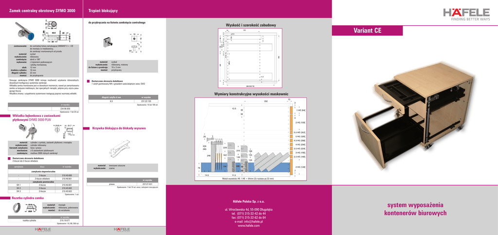 Zamek centralny obrotowy SYMO 3000 Trzpień blokujący do przykręcania na listwie zamknięcia centralnego Wyskość i szerokość zabudowy 352 zastosowanie: materiał: wykończenie: zamknięcie: wykonanie: skok: średnica cylindra: długość cylindra: montaż: do centralnej listwy zamykającej VARIANT C+ i CE do montażu w maskownicy, do zamknięć montowanych od przodu cynkal niklowany obrót o 180° z trzpieniem podnoszącym i płytką montażową 12 mm 18 mm 22 mm do przykręcenia materiał: wykończenie: do listew o przekroju: montaż: Stosując zamknięcia SYMO 3000 istnieje możliwość uzyskania różnorodnych, dowolnych konfiguracji systemów zamknięć. Wkładka zamka montowana jest w dowolnym momencie, nawet po zamontowaniu zamka w korpusie meblowym, bez specjalnych narzędzi, jedynie przy użyciu pasującego klucza. Wszelkie zmiany i uzupełnienia systemowe następują poprzez wymianę wkładki. Variant CE cynkal niklowany, matowy 16 x 3 mm przykręcany Dostarczane akcesoria dodatkowe 1 sztyft gwintowany M4 z gniazdem sześciokątnym wew. SW2 długość sztyftu d mm 6,5 nr wyrobu Wymiary konstrukcyjne wysokości maskownic 237.22.120 nr wyrobu Opakowanie: 10 lub 100 szt. 234.98.650 Opakowanie: 1 lub 20 szt. Wkładka bębenkowa z zastawkami płytkowymi SYMO 3000 PLW Krzywka blokująca do blokady wysuwu materiał: wykończenie: kierunek zamykania: mechanizm: zamknięcia: cylinder z cynkalu, zastawki płytkowe z mosiądzu cylinder niklowany lewy i prawy z 6 zastawkami płytkowymi możliwe 3000 różnych zamknięć Dostarczane akcesoria dodatkowe 2 klucze lub 2 klucze składane zamykanie klucz nr wyrobu materiał: wykończenie: tworzywo sztuczne czarna zamykanie niepowtarzalne SH 1 SH 2 SH 3 2 klucze 2 klucze składane zamykanie powtarzalne 2 klucze 2 klucze 2 klucze 210.40.600 210.46.601 210.40.601 210.40.602 210.40.603 nr wyrobu prawa Moduł wysokości HE: 1 HE = 64mm (2x rozstaw po 32 mm) 237.27.431 Opakowanie: 1 lub 10 szt. wraz z wkrętami mocującymi Opakowanie: 1 szt. Rozetka cylindra zamka rozetka cylindra materiał: wykończenie: montaż: Häfele Polska Sp. z o.o. mosiądz niklowana, polerowana do wciskania nr wyrobu 219.19.677 Opakowanie: 10,100, 500 szt. ul. Wrocławska 4d, 55-090 Długołęka tel. (071) 315-32-42 do 44 fax: (071) 315-32-62 do 64 e-mail: [email protected] www.hafele.com system wyposażenia kontenerów biurowych Piórnik Prowadnice piórnika Szuflada organizacyjna do szerokości zabudowy 392 mm prowadnica kulkowa z wysuwem częściowym do wkładów piórnikowych do szerokości zabudowy 392 mm zastosowanie: szerokość zabudowy: materiał: wykończenie: montaż: wykonanie: szerokość zabudowy: udźwig: wykończenie: długość wysuwu: system prowadzenia: montaż: montaż w kontenerach biurek 392 mm tworzywo sztuczne czarne RAL 9011 do zawieszenia na prowadnicy z osłoną prowadnicy zastosowanie: materiał: wykończenie: szerokość zabudowy: montaż: wykonanie: 392 mm 10 kg/parę ocynkowane 370 mm kulkowe do przykręcenia w systemie 32 Wspornik maskownicy montaż w kontenerach biurek stal powlekana tworzywem sztucznym, czarny RAL 9011 392 mm do zawieszenia na prowadnicy z szeregami otworów wewnętrznych z rozstawem10 mm, do przegródek wewnętrznych, bez osłon prowadnicy materiał: wykończenie: do wysokości maskownic: montaż: Listwa zamknięcia centralnego prowadnica rolkowa z wysuwem częściowym z samoczynnym domykaniem z jednolitym rozstawem otworów 32 mm do kontenerów biurowych o szerokości zabudowy 392 mm stal czarne RAL 9011 min. 187 mm do zamontowania na lewym/prawym boku szuflady organizacyjnej kolor czarny RAL 9011 nr wyrobu 429.23.348 zastosowanie: udźwig: materiał: wykończenie: akcesoria dodatkowe: szerokość zabudowy: długość wysuwu: montaż: montaż w kontenerach 25 kg/parę stal ocynkowane rolki ślizgowe Delrin, z cichym przesuwem 392 mm 405 mm do przykręcania do ścianki bocznej korpusu w systemie 32 Opakowanie: 1 lub 10 par wymiary wierceń w maskownicy szuflady organizacyjnej wymiary zabudowy Montaż Dla maskownicy o wysokości powyżej 187 mm trzeba dodatkowo zamontować wsporniki maskownicy. wymiary montażowe wymiary wierceń w maskownicy piórnika Prowadnice szuflad zastosowanie: materiał: wykończenie: montaż: Stelaż na teczki zawieszkowe do zaczepienia w prowadnicy piórnika listwa przesuwna z aluminium; płytka zamykająca – cynkal; zatrzaski blokujące z tworzywa sztucznego listwa przesuwna surowa; płytka zamykająca surowa; zatrzaski blokujące białe zmontowana, z jednolitym rozstawem przelotowych otworów ∅ 3 mm z ruchomą płytką zamykającą długość mm nr wyrobu 500 600 800 237.08.660 237.08.670 237.08.680 Opakowanie: 1 szt. wiercenie rzędowe wiercenie rzędowe Wskazówka montażowa Przy zastosowaniu wkrętów mocujących należy wywiercić otwory ∅ 5 mm w maskownicy szuflady. głębokość szuflady mm wymiary wew szuflady (szer. x gł. x wys.) mm opakowanie szt. Czarny RAL 9011 nr wyrobu szerokość zabudowy 392 mm 500 dla szerokości zabudowy mm wymiar wewnętrzny szuflady (szer. x gł. x wys.) mm czarny, RAL 9011 nr wyrobu 392 368 x 420 x 30 429.50.310 głębokość zabudowy Opakowanie: 1 szt. do głębokości zabudowy mm długość wysuwu mm nr wyrobu 530 370 429.58.990 Opakowanie: 1 para 330 x 483 x 74 1 lub 60 system zamykania z listwą zamknięcia centralnego VARIANT CE i blokadą jednoczesnego wysuwu szuflad 429.34.228 zastosowanie: do szer. zabudowy: materiał: wykończenie: montaż: do głęb. mont. mm do zawieszania poprzecznie teczek zawieszkowych formatu A4 zgodniez DIN 821, wymiar grzbietu 330 mm 392 mm tworzywo sztuczne czarna składane wym. (szer. X gł.) mm kolor nr wyrobu do szerokości zabudowy 392 mm 500 330 x 470 czarny, RAL 9011 głębokość zabudowy do głębokości szuflady mm 500 429.76.363 Opakowanie: 1 szt. do głębokości długość wysuwu zabudowy w świetle mm mm 530 405 nr wyrobu 429.06.312 Opakowanie: 1 para