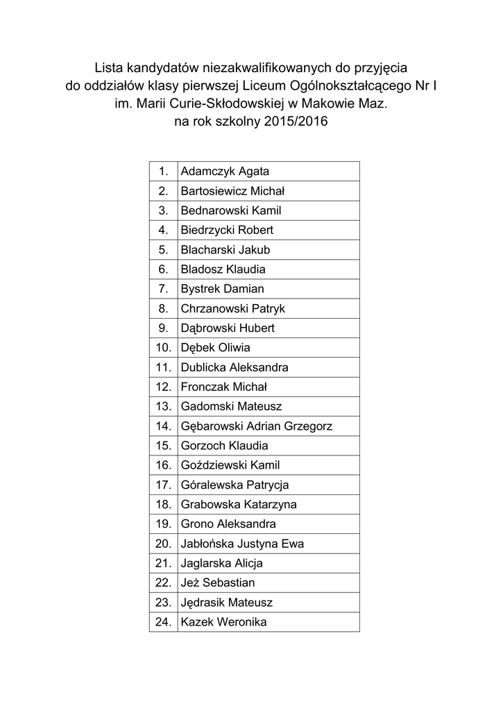 Lista kandydatów niezakwalifikowanych do przyjęcia do oddziałów klasy pierwszej Liceum Ogólnokształcącego Nr I im. Marii Curie-Skłodowskiej w Makowie Maz. na rok szkolny 2015/2016 1. Adamczyk Agata 2. Bartosiewicz Michał 3. Bednarowski Kamil 4. Biedrzycki Robert 5. Blacharski Jakub 6. Bladosz Klaudia 7. Bystrek Damian 8. Chrzanowski Patryk 9. Dąbrowski Hubert 10. Dębek Oliwia 11. Dublicka Aleksandra 12. Fronczak Michał 13. Gadomski Mateusz 14. Gębarowski Adrian Grzegorz 15. Gorzoch Klaudia 16. Goździewski Kamil 17. Góralewska Patrycja 18. Grabowska Katarzyna 19. Grono Aleksandra 20. Jabłońska Justyna Ewa 21. Jaglarska Alicja 22. Jeż Sebastian 23. Jędrasik Mateusz 24. Kazek Weronika 25. Kaźmierczak Sebastian 26. Kęszczyk Sylwester Dominik 27. Koczara Patryk 28. Kołodziejska Sylwia 29. Krukowska Aleksandra 30. Kruszewska Daria 31. Krzyżewski Mateusz 32. Krzyżewski Patryk 33. Kuc Artur 34. Kuciej Kinga Anna 35. Kuczyńska Natalia 36. Kujawka Bartosz s. Krzysztofa 37. Lewandowska Luiza 38. Maruszewski Piotr 39. Milewska Martyna Kamila 40. Milewski Paweł 41. Mroczkowska Beata 42. Napiórkowska Patrycja 43. Nieczyperowicz Jakub 44. Niesłuchowska Zuzanna 45. Olender Łukasz 46. Olender Michał 47. Piecuska Wiktoria 48. Popławska Adrianna 49. Prusik Joanna 50. Pyra Jakub 51. Pyra Monika 52. Rekosz Damian 53. Rogulski Łukasz 54. Rzewnicka Ewa 55. Sęk Mateusz 56. Skowroński Adrian 57. Skrzecz Patrycja 58. Słowikowska Kinga 59. Sternik Mateusz 60. Strzemieczna Monika 61. Szczepański Dawid 62. Szczęsna Joanna 63. Szczuciński Łukasz Ryszard 64. Tomczak Dominik 65. Traczewski Maciej 66. Woźniak Klaudia 67. Wójcik Monika 68. Wysocki Krystian 69. Zakrzewska Milena 70. Zakrzewska Sylwia 71. Załęski Dawid 72. Zielińska Martyna