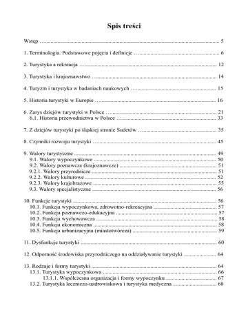 Spis treści Wstęp …............................................................................................................................ 5 1. Terminologia. Podstawowe pojęcia i definicje …......................................................... 6 2. Turystyka a rekreacja ….............................................................................................. 12 3. Turystyka i krajoznawstwo …..................................................................................... 14 4. Turyzm i turystyka w badaniach naukowych …......................................................... 15 5. Historia turystyki w Europie ….................................................................................. 16 6. Zarys dziejów turystyki w Polsce …........................................................................... 21 6.1. Historia przewodnictwa w Polsce …................................................................... 33 7. Z dziejów turystyki po śląskiej stronie Sudetów ….................................................... 35 8. Czynniki rozwoju turystyki ….................................................................................... 45 9. Walory turystyczne ..................................................................................................... 49 9.1. Walory wypoczynkowe ....................................................................................... 50 9.2. Walory poznawcze (krajoznawcze) ..................................................................... 51 9.2.1. Walory przyrodnicze ......................................................................................... 51 9.2.2. Walory kulturowe ............................................................................................. 52 9.2.3. Walory krajobrazowe ........................................................................................ 55 9.3. Walory specjalistyczne ........................................................................................ 56 10. Funkcje turystyki ...................................................................................................... 56 10.1. Funkcja wypoczynkowa, zdrowotno-rekreacyjna ............................................. 57 10.2. Funkcja poznawczo-edukacyjna ........................................................................ 57 10.3. Funkcja wychowawcza ...................................................................................... 58 10.4. Funkcja ekonomiczna ........................................................................................ 58 10.5. Funkcja urbanizacyjna (miastotwórcza) ............................................................ 59 11. Dysfunkcje turystyki ................................................................................................. 60 12. Odporność środowiska przyrodniczego na oddziaływanie turystyki ....................... 64 13. Rodzaje i formy turystyki ......................................................................................... 64 13.1. Turystyka wypoczynkowa ................................................................................. 66 13.1.1. Współczesna organizacja i formy wypoczynku .................................... 67 13.2. Turystyka leczniczo-uzdrowiskowa i turystyka medyczna ............................... 68 13.3.Agroturystyka .................................................................................................. 70 13.4. Turystyka morska .......................................................................................... 71 13.5. Tury styka poznawcza .................................................................................... 73 13.6. Turystyka kwalifikowana-turystyka aktywna ................................................. 74 13.6.1.Turystyka piesza ................................................................................... 74 13.6.2. Turystyka narciarska............................................................................. 75 13.6.3. Jeździectwo i turystyka konna............................................................... 73 13.6.4. Turystyka i rekreacja na wodach śródlądowych: wioślarstwo i kajakarstwo ...................................................................................... 79 13.6.5. Turystyka kolarska ................................................................................. 80 13.6.6. Turystyka motorowa .............................................................................. 83 13.6.7. Turystyka żeglarska ............................................................................... 84 13.6.8. Turystyka campingowa i caravaning ..................................................... 85 13.6.9. Turystyka przygodowa .......................................................................... 86 13.6.9.1.Tramping ................................................................................. 86 13.6.9.2. Treking .................................................................................... 87 13.6.9.3. Surwiwal(Survival) ................................................................. 87 13.6.9.4. Turystyka podwodna ............................................................... 87 13.7. Inne formy turystyki kwalifikowanej ................................................................ 88 14. Inne rodzaje turystyki ............................................................................................... 90 14.1. Turystyka pielgrzymkowa ............................................................................... 90 14.2. Turystyka etniczna............................................................................................ 93 14.3. Turystyka kongresowa i turystyka biznesowa ................................................. 94 14.4. City breaks- turystyka weekendowa w metropoliach ...................................... 95 15. Wiązane z turystyką formy rekreacji w otwartej przestrzeni (outdo