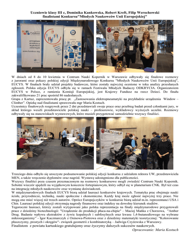 Uczniowie klasy III c, Dominika Kankowska, Robert Kreft, Filip Werochowski finalistami Konkursu"Młodych Naukowców Unii Europejskiej" W dniach od 8 do 10 kwietnia w Centrum Nauki Kopernik w Warszawie odbywały się finałowe rozmowy z jurorami oraz pokazy polskiej edycji Międzynarodowego Konkursu "Młodych Naukowców Unii Europejskiej", EUCYS. W finałach brały udział projekty badawcze, które zostały najwyżej ocenione w toku analizy przesłanych zgłoszeń. Polska edycja EUCYS odbyła się w ramach Festiwalu Młodych Badaczy ODKRYCIA. Organizatorem EUCYS w Polsce, z ramienia Komisji Europejskiej, jest Krajowy Fundusz na rzecz Dzieci. Do finału zakwalifikowano 21 prac spośród 86 nadesłanych. Grupa z Kartuz, zaprezentowała pracę pt. „Zastosowania elektropneumatyki na przykładzie urządzenia Window – Climber”. Opiekę nad finalistami sprawowała mgr Maria Kostuch. Uczestnicy finałowych rozgrywek przez 2 dni przedstawiali swoje prace oraz przebieg badań przed członkami jury, w skład którego weszli przedstawiciele polskiej nauki – profesorowie, wykładowcy wyższych uczelni. Rozmowy odbywały się na stanowiskach wystawowych, które musieli przygotować samodzielnie wszyscy finaliści. Trzeciego dnia odbyło się uroczyste podsumowanie polskiej edycji konkursu z udziałem rektora UW, przedstawiciela MEN, a także wręczenie dyplomów oraz nagród. Wystawę udostępniono dla publiczności. Wszyscy finaliści poza czasem przeznaczonym na rozmowy konkursowe mogli zwiedzić Centrum Nauki Kopernik. Sobotni wieczór spędzili na wyjątkowym koncercie fortepianowym, który odbył się w planetarium CNK. Był też czas na integrację młodych naukowców oraz wymianę doświadczeń. W międzynarodowych finałach EUCYS biorą udział laureaci konkursów krajowych. Tematyka prac obejmuje nauki ścisłe, przyrodnicze, technikę, nauki społeczne i ekonomiczne. Każdy kraj może zgłosić najwyżej trzy prace. Nie mogą one mieć więcej niż trzech autorów. Oprócz Europejczyków w konkursie biorą udział m.in. reprezentanci USA i Chin. Laureaci polskiej edycji otrzymują nagrody finansowe oraz indeksy na dowolny kierunek studiów. Tegoroczni laureaci, którzy zostali wytypowani jako polska reprezentacja na finały międzynarodowe przygotowali prace z dziedziny biotechnologii: "Urządzenie do produkcji płuca-na-chipie" – Maciej Mańka z Chorzowa, "Amber Drug. Badanie wpływu ekstraktów z żywic kopalnych i subfosylnych oraz kwasu 1,4-butanodiowego na wybrane mikroorganizmy” - Igor Kaczmarczyk z Osinowa-Piotrowa oraz z dziedziny matematyki teoretycznej: "Kolorowanie płaszczyzny, prostych i okręgów"- związek geometrii z kombinatoryką – Jadwiga Czyżewska z Warszawy. Finalistom z powiatu kartuskiego gratulujemy oraz życzymy dalszych sukcesów naukowych. Opracowanie: Maria Kostuch