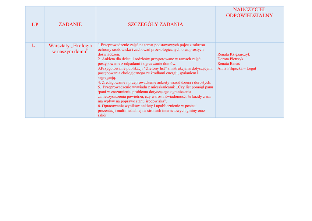 NAUCZYCIEL ODPOWIEDZIALNY LP 1. ZADANIE SZCZEGÓŁY ZADANIA Warsztaty „Ekologia w naszym domu” 1.Przeprowadzenie zajęć na temat podstawowych pojęć z zakresu ochrony środowiska i zachowań proekologicznych oraz prostych doświadczeń. 2. Ankieta dla dzieci i rodziców przygotowane w ramach zajęć: postępowanie z odpadami i ogrzewanie domów. 3.Przygotowanie publikacji ‘ Zielony list” z instrukcjami dotyczącymi postępowania ekologicznego ze źródłami energii, spalaniem i segregacją. 4. Zredagowanie i przeprowadzenie ankiety wśród dzieci i dorosłych. 5. Przeprowadzenie wywiadu z mieszkańcami: „Czy list pomógł panu /pani w zrozumieniu problemu dotyczącego ograniczenia zanieczyszczenia powietrza, czy wzrosła świadomość, że każdy z nas ma wpływ na poprawę stanu środowiska”. 6. Opracowanie wyników ankiety i upublicznienie w postaci prezentacji multimedialnej na stronach internetowych gminy oraz szkół. Renata Księżarczyk Dorota Pietrzyk Renata Banaś Anna Filipecka – Legut 2. Ekologiczne kino – prezentacja filmów ekologicznych. Quiz dla gimnazjalistów po obejrzeniu filmów. Publikacja wywiadów z rodzicami po projekcji filmów Publikacja wyników quizu oraz wybranych fragmentów wywiadu z rodzicami na stornach internetowych gminy. 1. 2. 3. 4. 1. Zbieranie informacji o stanie środowiska (powietrze, stężenie dwutlenku węgla i siarki oraz metali ciężkich). 2. Test z zakresu sozologii i ekologii. 3. Prezentacja wyników pomiarów na terenie szkoły. 4. Publikacja wyników na stronach internetowych gminy oraz szkół. Dorota Pietrzyk Renata Księżarczyk Renata Banaś Anna FIlipecka - Legut Sprawozdanie i zdjęcia z wizyty w zakładzie. Wykonanie pomiarów zanieczyszczeń atmosfery w okolicach zakładu z wykorzystaniem przyrządów pomiarowych zakupionych w ramach projektu (przenośny analizator zanieczyszczeń powietrza). Urszula Kowalska Marek Idzik 3. Warsztaty „Meteo” – zbieranie inf. o stania środowiska. 4. Wycieczka do Przedsiębiorstw Metali Nieżelaznych Bobrek Rowerowy rajd ekologiczny gminny 1. 2. Instalacja ekologiczna – gminny konkurs artystyczny Gminny konkurs na dowolną instalację artystyczną z materiałów naturalnych i do recyklingu. - ocena instalacji; - zdjęcia; - nagrody rzeczowe; - dyplomy. 5. 6. Anna Grochal Urszula Kowalska Obserwacja naturalnych wskaźników zanieczyszczenia środowiska (rodzaje porostów, wygląd drzew szpilkowych…) 2. Quizy z rozpoznawania gatunków drzew, nagrody w quizach (część gimnazjalna i SP) 3. Prelekcje leśniczych na temat stanu zasobów leśnych i ochrony powietrza w ekosystemach leśnych. 4. Zdjęcia i film z imprezy. 1. Anna Grochal Elżbieta Żołna – Smołkiewicz Renata Księżarczyk Aldona Krawczyk Izabela Tołwińska Anna Remsak Joanna Czarnota Aneta Gumułka Anna Filipecka – Legut Renata Banaś 1. Celina Rudyk Ewa Gajda 7. Edukacja ekolog. w klasach młodszych szkół podstawowych. Warsztaty „Odpady i zanieczyszczenia z domu. Rozpoznawanie oznaczeń ekologicznych. „ 2. Gminny konkurs plastyczny „Dobre rady na odpady”. 3. Mapka ekologiczna „Nielegalne wysypiska śmieci i punkty zbiórek surowców wtórnych” - prace konkursowe; - sporządzenie mapy „dzikich wysypisk”; - nagrody rzeczowe, dyplomy, zdjęcia. 1. „ Mamo, tato chcę oddychać czystym powietrzem” – warsztaty dla dzieci młodszych. 2. „Czysty świat wokół nas” – konkurs plastyczny dla dzieci przedszkolnych. 3. Organizacja wystawy pokonkursowej w galerii EPICENTRUM w Chełmku - dyplomy dla laureatów; - publikacja na stronach internetowych szkół. 8. Cykl konkursów ekologicznych dla dzieci przedszkolnych. 1. 9. Turniej ekologiczny i pokaz mody ekol. 10. Zarządzanie projektem 1. Gminny Turniej Ekologiczny „Zdrowa płuca” - test obrazkowy - test wiedzy ekologicznej - udział w sprawnościowym torze przeszkód - wywiad przeprowadzony z uczestnikami pokazu - ankiety 1. Koordynator szkolny forma zatrudnienia – umowa zlecenie Joanna Czarnota Izabela Tołwińska Urszula Kowalska Wioletta Łopuszyńska Dorota Szklarczyk Pędziałek – Krysta Eliza Karolina Zamarlik Joanna Czarnota Urszula Kowalska Celina Rudyk Anna Grochal RAZEM