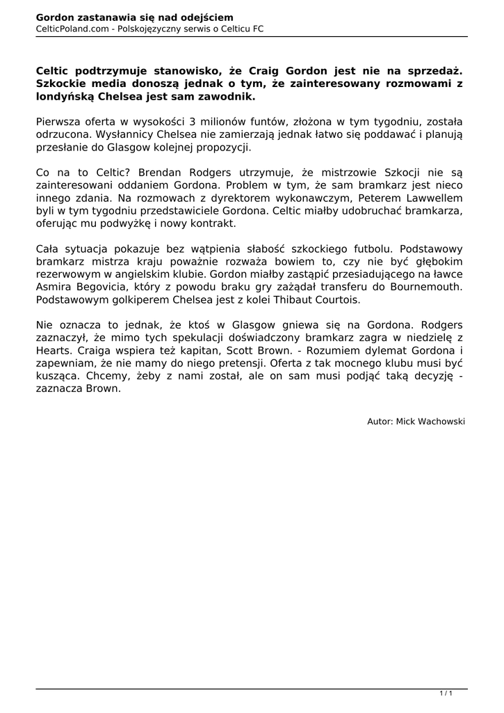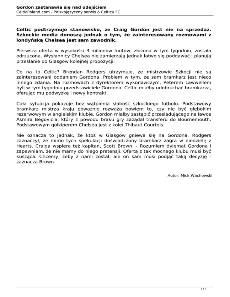 Gordon zastanawia się nad odejściem CelticPoland.com - Polskojęzyczny serwis o Celticu FC Celtic podtrzymuje stanowisko, że Craig Gordon jest nie na sprzedaż. Szkockie media donoszą jednak o tym, że zainteresowany rozmowami z londyńską Chelsea jest sam zawodnik. Pierwsza oferta w wysokości 3 milionów funtów, złożona w tym tygodniu, została odrzucona. Wysłannicy Chelsea nie zamierzają jednak łatwo się poddawać i planują przesłanie do Glasgow kolejnej propozycji. Co na to Celtic? Brendan Rodgers utrzymuje, że mistrzowie Szkocji nie są zainteresowani oddaniem Gordona. Problem w tym, że sam bramkarz jest nieco innego zdania. Na rozmowach z dyrektorem wykonawczym, Peterem Lawwellem byli w tym tygodniu przedstawiciele Gordona. Celtic miałby udobruchać bramkarza, oferując mu podwyżkę i nowy kontrakt. Cała sytuacja pokazuje bez wątpienia słabość szkockiego futbolu. Podstawowy bramkarz mistrza kraju poważnie rozważa bowiem to, czy nie być głębokim rezerwowym w angielskim klubie. Gordon miałby zastąpić przesiadującego na ławce Asmira Begovicia, który z powodu braku gry zażądał transferu do Bournemouth. Podstawowym golkiperem Chelsea jest z kolei Thibaut Courtois. Nie oznacza to jednak, że ktoś w Glasgow gniewa się na Gordona. Rodgers zaznaczył, że mimo tych spekulacji doświadczony bramkarz zagra w niedzielę z Hearts. Craiga wspiera też kapitan, Scott Brown. - Rozumiem dylemat Gordona i zapewniam, że nie mamy do niego pretensji. Oferta z tak mocnego klubu musi być kusząca. Chcemy, żeby z nami został, ale on sam musi podjąć taką decyzję zaznacza Brown. Autor: Mick Wachowski 1/1 Powered by TCPDF (www.tcpdf.org)