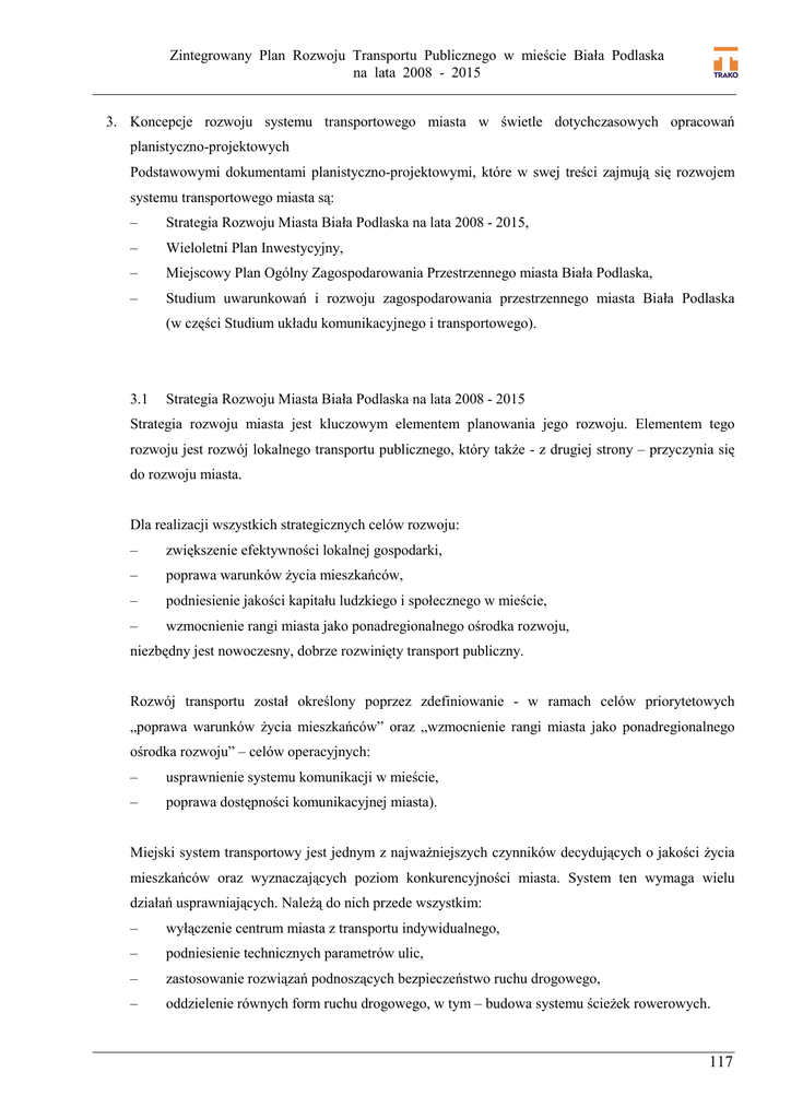 Zintegrowany Plan Rozwoju Transportu Publicznego w mieście Biała Podlaska na lata 2008 - 2015 3. Koncepcje rozwoju systemu transportowego miasta w świetle dotychczasowych opracowań planistyczno-projektowych Podstawowymi dokumentami planistyczno-projektowymi, które w swej treści zajmują się rozwojem systemu transportowego miasta są: – Strategia Rozwoju Miasta Biała Podlaska na lata 2008 - 2015, – Wieloletni Plan Inwestycyjny, – Miejscowy Plan Ogólny Zagospodarowania Przestrzennego miasta Biała Podlaska, – Studium uwarunkowań i rozwoju zagospodarowania przestrzennego miasta Biała Podlaska (w części Studium układu komunikacyjnego i transportowego). 3.1 Strategia Rozwoju Miasta Biała Podlaska na lata 2008 - 2015 Strategia rozwoju miasta jest kluczowym elementem planowania jego rozwoju. Elementem tego rozwoju jest rozwój lokalnego transportu publicznego, który takŜe - z drugiej strony – przyczynia się do rozwoju miasta. Dla realizacji wszystkich strategicznych celów rozwoju: – zwiększenie efektywności lokalnej gospodarki, – poprawa warunków Ŝycia mieszkańców, – podniesienie jakości kapitału ludzkiego i społecznego w mieście, – wzmocnienie rangi miasta jako ponadregionalnego ośrodka rozwoju, niezbędny jest nowoczesny, dobrze rozwinięty transport publiczny. Rozwój transportu został określony poprzez zdefiniowanie - w ramach celów priorytetowych „poprawa warunków Ŝycia mieszkańców” oraz „wzmocnienie rangi miasta jako ponadregionalnego ośrodka rozwoju” – celów operacyjnych: – usprawnienie systemu komunikacji w mieście, – poprawa dostępności komunikacyjnej miasta). Miejski system transportowy jest jednym z najwaŜniejszych czynników decydujących o jakości Ŝycia mieszkańców oraz wyznaczających poziom konkurencyjności miasta. System ten wymaga wielu działań usprawniających. NaleŜą do nich przede wszystkim: – wyłączenie centrum miasta z transportu indywidualnego, – podniesienie technicznych parametrów ulic, – zastosowanie rozwiązań podnoszących bezpieczeństwo ruchu drogowego, – oddzielenie równych form ruchu drogowego, w tym – budowa systemu ścieŜek rowerowych. 117 Zintegrowany Plan Rozwoju Transportu Publicznego w mieście Biała Podlaska na lata 2008 - 2015 Działania te wymagają zrealizowania wielu zadań inwestycyjnych, które podnosi Wieloletni Plan Inwestycyjny. Są one związane z rozbudową bądź przebudową układu drogowego w celu poprawy jego przepustowości (w kaŜdym kierunku, ale szczególnie w układzie północ – południe), z poprawą organizacji ruchu w mieście oraz z usprawnieniem funkcjonowania komunikacji miejskiej. 3.2 Wieloletni Plan Inwestycyjny Wieloletni Plan Inwestycyjny dla miasta Biała Podlaska (WPI) stanowi integralną część systemu wdraŜania strategii miasta. Zawiera wykaz najwaŜniejszych zadań inwestycyjnych miasta, równieŜ zadań dotyczących transportu publicznego, które będą realizowane w latach 2008-2013. Zadania te dotyczą: – poprawy dostępności do stref gospodarczych, – poprawy połączeń z drogą krajową nr 2 oraz budowy obwodnicy zachodniej centrum miasta (nowy przebieg drogi wojewódzkiej 812) – budowy nowego dworca PKS przy dworcu PKP i utworzenia tam Zintegrowanego Centrum Komunikacyjnego, – budowy ulic osiedlowych, – poprawy jakości funkcjonowania systemu transportu publicznego. 3.3 Miejscowy Plan Ogólny Zagospodarowania Przestrzennego miasta Biała Podlaska Miejscowy Plan Ogólny Zagospodarowania Przestrzennego miasta Biała Podlaska wskazuje następujące zadania dotyczące systemu transportowego miasta: – budowa autostrady na północ od miasta i realizacja połączeń drogowych między nią a miastem, – rozwój drogowo - ulicznej sieci wewnętrznej, przede wszystkim w północnej części miasta, – budowa dwóch nowych mostów na przedłuŜeniu ul. Lubelskiej oraz na przedłuŜeniu ul. Kąpielowej z włączeniem w ul. Brzeską, – budowa 3 wiaduktów nad linią kolejową – połączenie z planowaną strefą aktywizacji gospodarczej na terenie lotniska, – budowa 5 dwupoziomowych węzłów drogowych na skrzyŜowaniu istniejącej obwodnicy i ul. Brzeskiej w kierunku Terespola z drogami poprzecznymi. 118 Zintegrowany Plan Rozwoju Transportu Publicznego w mieście Biała Podlaska na lata 2008 - 2015 3.4 Studium uwarunkowań i kierunków zagospodarowania przestrzennego miasta Biała Podlaska Studium uwarunkowań i kierunków zagospodarowania przestrzennego miasta Biała Podlaska jest obowiązującym dokumentem określającym politykę przestrzenną miasta, której realizacja wiązana jest m. in. z doskonaleniem jego systemu transportowego. Ustalenia w zakresie transportu publicznego są zgodne ze Strategią rozwoju miasta i dotyczą: – eliminowania ruchu transportowego, cięŜarowego i indywidualnego, z centrum miasta, – usprawnienia istniejących drogowych układów komunikacyjnych, – realizacji inwestycji związanych z potrzebami transportu. Aneksem do studium uwarunkowań i kierunków zagospodarowania przestrzennego w zakresie komunikacji jest „Koncepcja rozwoju systemu transportowego miasta Biała Podlaska”1, w której w zakresie rozwoju systemu komunikacji publicznej w mieście zakłada się: – konieczność utrzymania wielkości przewozów na niezmienionym poziomie w stosunku do liczby obsługiwanej ludności, – konieczność dostosowania przebiegu linii komunikacji publicznej do nowoinwestowanych obszarów zabudowy mieszkaniowej, – konieczność systematycznej wymiany taboru Miejskiego Zakładu Komunikacyjnego Sp. z o.o. na nowy niskopodłogowy i ekologiczny, – konieczność modernizacji przystanków komunikacji miejskiej. W zakresie rozwoju układu autobusowej komunikacji lokalnej i regionalnej najwaŜniejszym zadaniem będzie budowa nowego dworca autobusowego w sąsiedztwie istniejącego dworca kolejowego. 1 autor A. Zalewski z zespołem, DHV POLSKA Sp. z o.o., Warszawa 1999 11