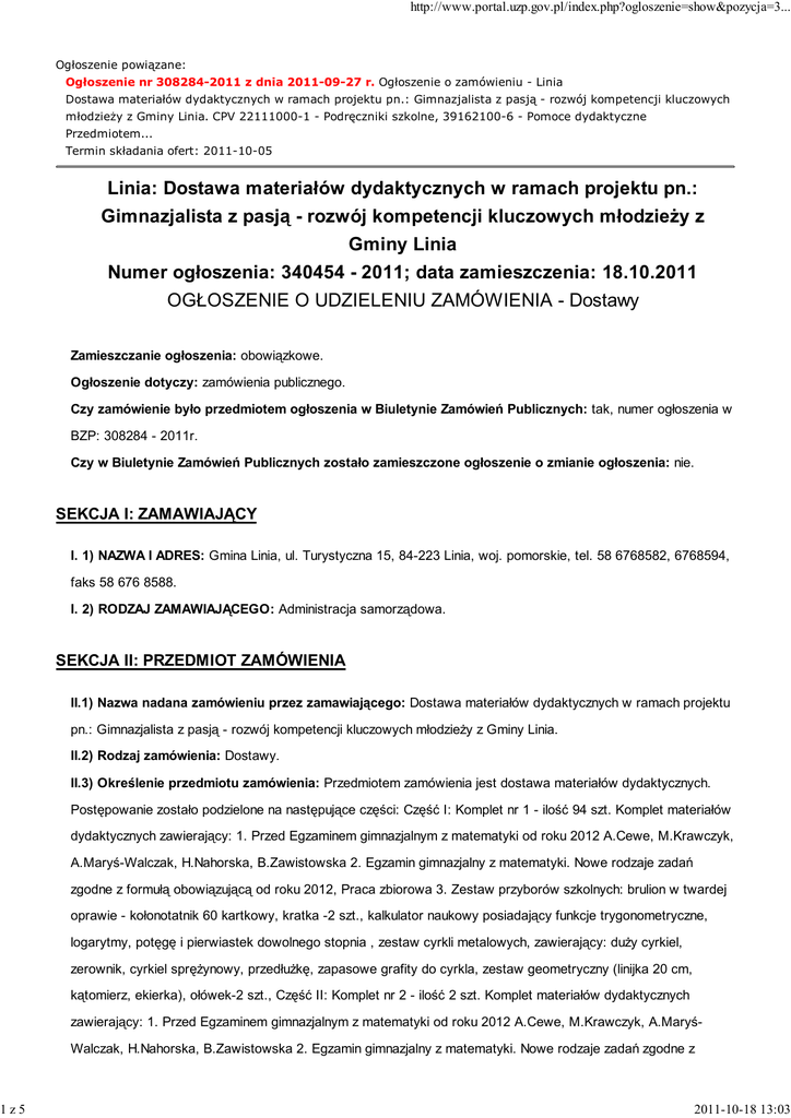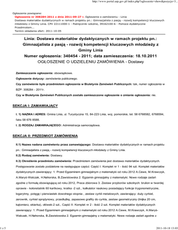 1z5 http://www.portal.uzp.gov.pl/index.php?ogloszenie=show&pozycja=3... Ogłoszenie powiązane: Ogłoszenie nr 308284-2011 z dnia 2011-09-27 r. Ogłoszenie o zamówieniu - Linia Dostawa materiałów dydaktycznych w ramach projektu pn.: Gimnazjalista z pasją - rozwój kompetencji kluczowych młodzieży z Gminy Linia. CPV 22111000-1 - Podręczniki szkolne, 39162100-6 - Pomoce dydaktyczne Przedmiotem... Termin składania ofert: 2011-10-05 Linia: Dostawa materiałów dydaktycznych w ramach projektu pn.: Gimnazjalista z pasją - rozwój kompetencji kluczowych młodzieży z Gminy Linia Numer ogłoszenia: 340454 - 2011; data zamieszczenia: 18.10.2011 OGŁOSZENIE O UDZIELENIU ZAMÓWIENIA - Dostawy Zamieszczanie ogłoszenia: obowiązkowe. Ogłoszenie dotyczy: zamówienia publicznego. Czy zamówienie było przedmiotem ogłoszenia w Biuletynie Zamówień Publicznych: tak, numer ogłoszenia w BZP: 308284 - 2011r. Czy w Biuletynie Zamówień Publicznych zostało zamieszczone ogłoszenie o zmianie ogłoszenia: nie. SEKCJA I: ZAMAWIAJĄCY I. 1) NAZWA I ADRES: Gmina Linia, ul. Turystyczna 15, 84-223 Linia, woj. pomorskie, tel. 58 6768582, 6768594, faks 58 676 8588. I. 2) RODZAJ ZAMAWIAJĄCEGO: Administracja samorządowa. SEKCJA II: PRZEDMIOT ZAMÓWIENIA II.1) Nazwa nadana zamówieniu przez zamawiającego: Dostawa materiałów dydaktycznych w ramach projektu pn.: Gimnazjalista z pasją - rozwój kompetencji kluczowych młodzieży z Gminy Linia. II.2) Rodzaj zamówienia: Dostawy. II.3) Określenie przedmiotu zamówienia: Przedmiotem zamówienia jest dostawa materiałów dydaktycznych. Postępowanie zostało podzielone na następujące części: Część I: Komplet nr 1 - ilość 94 szt. Komplet materiałów dydaktycznych zawierający: 1. Przed Egzaminem gimnazjalnym z matematyki od roku 2012 A.Cewe, M.Krawczyk, A.Maryś-Walczak, H.Nahorska, B.Zawistowska 2. Egzamin gimnazjalny z matematyki. Nowe rodzaje zadań zgodne z formułą obowiązującą od roku 2012, Praca zbiorowa 3. Zestaw przyborów szkolnych: brulion w twardej oprawie - kołonotatnik 60 kartkowy, kratka -2 szt., kalkulator naukowy posiadający funkcje trygonometryczne, logarytmy, potęgę i pierwiastek dowolnego stopnia , zestaw cyrkli metalowych, zawierający: duży cyrkiel, zerownik, cyrkiel sprężynowy, przedłużkę, zapasowe grafity do cyrkla, zestaw geometryczny (linijka 20 cm, kątomierz, ekierka), ołówek-2 szt., Część II: Komplet nr 2 - ilość 2 szt. Komplet materiałów dydaktycznych zawierający: 1. Przed Egzaminem gimnazjalnym z matematyki od roku 2012 A.Cewe, M.Krawczyk, A.MaryśWalczak, H.Nahorska, B.Zawistowska 2. Egzamin gimnazjalny z matematyki. Nowe rodzaje zadań zgodne z 2011-10-18 13:03 2z5 http://www.portal.uzp.gov.pl/index.php?ogloszenie=show&pozycja=3... formułą obowiązującą od roku 2012, Praca zbiorowa Część III: Komplet nr 3 - ilość 60 szt. Komplet materiałów dydaktycznych zawierający: 1. Voices 1- książka ucznia z płytą, Catherine McBeth, rok wydania 2011, oprawa miękka 2. Voices 1- zeszyt ćwiczeń, Katherine Bilsborough, Steve Bilsborough, rok wydania 2011, oprawa miękka 3. Słownik angielsko-polski, polsko-angielski + CD Oxford Wordpower lub równoważny Część IV: Komplet nr 4 ilość 60 szt. Komplet materiałów dydaktycznych zawierający: 1. Voices 2- książka ucznia z płytą, Katherine Bilsborough, Steve Bilsborough rok wydania 2011, oprawa miękka 2. Voices 2- zeszyt ćwiczeń, Katherine Bilsborough, Steve Bilsborough rok wydania 2011, oprawa miękka 3. Repetytorium Gimnazjalne 2012. Poziom podstawowy i rozszerzony plus mp3 CD Rod Fricker, Jerzy Gaszewski, Tomasz Siuta, Marta Umińska Część V: Komplet nr 5 - ilość 60 szt. Komplet materiałów dydaktycznych zawierający: 1. Egzamin gimnazjalny 2012. Repetytorium z testami (książka z płytą),oprawa miękka, rok wydania 2011, Marta Rosińska, Grzegorz Śpiewak 2. readersy; TYTUŁ:Michael Jackson autor:Carl W Hart, 3. Repetytorium Gimnazjalne 2012. Poziom podstawowy i rozszerzony plus mp 3 CD Rod Fricker, Jerzy Gaszewski, Tomasz Siuta, Marta Umińska Część VI: Komplet nr 6 - ilość 2 szt. Komplet materiałów dydaktycznych zawierający: 1. Voices 1- książka nauczyciela , Małgorzata Krzemińska-Adamek 2. Voices 1 - materiały do kopiowania, Madeleine Williamson, Fiona Mauchline Część VII: Komplet nr 7 - ilość 2 szt. Komplet materiałów dydaktycznych zawierający: 1. Voices 2- książka nauczyciela , Małgorzata Krzemińska-Adamek 2. Voices 2 - materiały do kopiowania, Tim Bowen, Fiona Mauchline 3. Książka nauczyciela - Repetytorium Gimnazjalne 2012. Poziom podstawowy i rozszerzony plus CD, Rod Fricker, Jerzy Gaszewski, Tomasz Siuta, Marta Umińska Część VIII: Komplet nr 8 - ilość 2 szt. Komplet materiałów dydaktycznych zawierający: 1. Egzamin gimnazjalny 2012. Repetytorium z testami (książka z płytą),oprawa miękka, rok wydania 2011, Marta Rosińska, Grzegorz Śpiewak 2. readersy; TYTUŁ:Michael Jackson autor:Carl W Hart, 3. Książka nauczyciela - Repetytorium Gimnazjalne 2012. Poziom podstawowy i rozszerzony plus CD Rod Fricker, Jerzy Gaszewski, Tomasz Siuta, Marta Umińska. II.4) Wspólny Słownik Zamówień (CPV): 22.11.10.00-1. SEKCJA III: PROCEDURA III.1) TRYB UDZIELENIA ZAMÓWIENIA: Przetarg nieograniczony III.2) INFORMACJE ADMINISTRACYJNE Zamówienie dotyczy projektu/programu finansowanego ze środków Unii Europejskiej: tak, projekt/program: Projekt pn.: Gimnazjalista z pasją - rozwój kompetencji kluczowych młodzieży z Gminy Linia jest współfinansowany ze środków Unii Europejskiej w ramach Europejskiego Funduszu Społecznego, w ramach Programu Operacyjnego Kapitał Ludzki, Priorytet IX - Rozwój wykształcenia i kompetencji w regionach, Poddziałanie 9.1.2. - Wyrównywanie szans edukacyjnych uczniów z grup o utrudnionym dostępie do edukacji oraz zmniejszanie różnic w jakości usług edukacyjnych.. SEKCJA IV: UDZIELENIE ZAMÓWIENIA Część NR: 1 Nazwa: Część I: Komplet nr 1 -