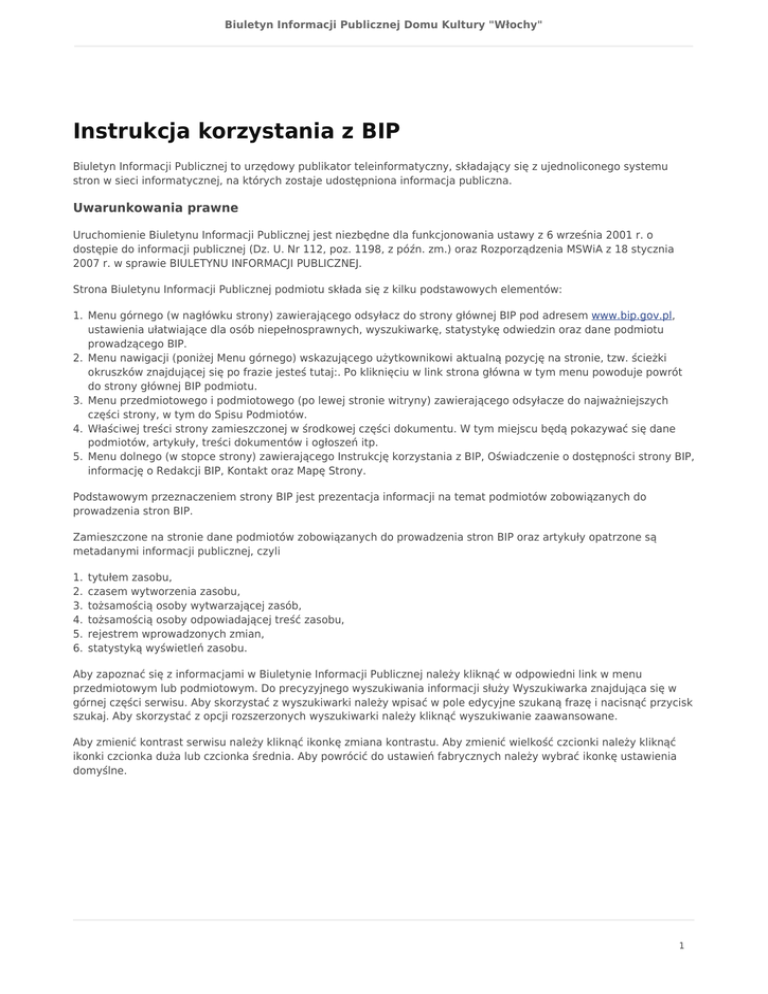 Biuletyn Informacji Publicznej Domu Kultury "Włochy" Instrukcja korzystania z BIP Biuletyn Informacji Publicznej to urzędowy publikator teleinformatyczny, składający się z ujednoliconego systemu stron w sieci informatycznej, na których zostaje udostępniona informacja publiczna. Uwarunkowania prawne Uruchomienie Biuletynu Informacji Publicznej jest niezbędne dla funkcjonowania ustawy z 6 września 2001 r. o dostępie do informacji publicznej (Dz. U. Nr 112, poz. 1198, z późn. zm.) oraz Rozporządzenia MSWiA z 18 stycznia 2007 r. w sprawie BIULETYNU INFORMACJI PUBLICZNEJ. Strona Biuletynu Informacji Publicznej podmiotu składa się z kilku podstawowych elementów: 1. Menu górnego (w nagłówku strony) zawierającego odsyłacz do strony głównej BIP pod adresem www.bip.gov.pl, ustawienia ułatwiające dla osób niepełnosprawnych, wyszukiwarkę, statystykę odwiedzin oraz dane podmiotu prowadzącego BIP. 2. Menu nawigacji (poniżej Menu górnego) wskazującego użytkownikowi aktualną pozycję na stronie, tzw. ścieżki okruszków znajdującej się po frazie jesteś tutaj:. Po kliknięciu w link strona główna w tym menu powoduje powrót do strony głównej BIP podmiotu. 3. Menu przedmiotowego i podmiotowego (po lewej stronie witryny) zawierającego odsyłacze do najważniejszych części strony, w tym do Spisu Podmiotów. 4. Właściwej treści strony zamieszczonej w środkowej części dokumentu. W tym miejscu będą pokazywać się dane podmiotów, artykuły, treści dokumentów i ogłoszeń itp. 5. Menu dolnego (w stopce strony) zawierającego Instrukcję korzystania z BIP, Oświadczenie o dostępności strony BIP, informację o Redakcji BIP, Kontakt oraz Mapę Strony. Podstawowym przeznaczeniem strony BIP jest prezentacja informacji na temat podmiotów zobowiązanych do prowadzenia stron BIP. Zamieszczone na stronie dane podmiotów zobowiązanych do prowadzenia stron BIP oraz artykuły opatrzone są metadanymi informacji publicznej, czyli 1. 2. 3. 4. 5. 6. tytułem zasobu, czasem wytworzenia zasobu, tożsamością osoby wytwarzającej zasób, tożsamością osoby odpowiadającej treść zasobu, rejestrem wprowadzonych zmian, statystyką wyświetleń zasobu. Aby zapoznać się z informacjami w Biuletynie Informacji Publicznej należy kliknąć w odpowiedni link w menu przedmiotowym lub podmiotowym. Do precyzyjnego wyszukiwania informacji służy Wyszukiwarka znajdująca się w górnej części serwisu. Aby skorzystać z wyszukiwarki należy wpisać w pole edycyjne szukaną frazę i nacisnąć przycisk szukaj. Aby skorzystać z opcji rozszerzonych wyszukiwarki należy kliknąć wyszukiwanie zaawansowane. Aby zmienić kontrast serwisu należy kliknąć ikonkę zmiana kontrastu. Aby zmienić wielkość czcionki należy kliknąć ikonki czcionka duża lub czcionka średnia. Aby powrócić do ustawień fabrycznych należy wybrać ikonkę ustawienia domyślne. 1