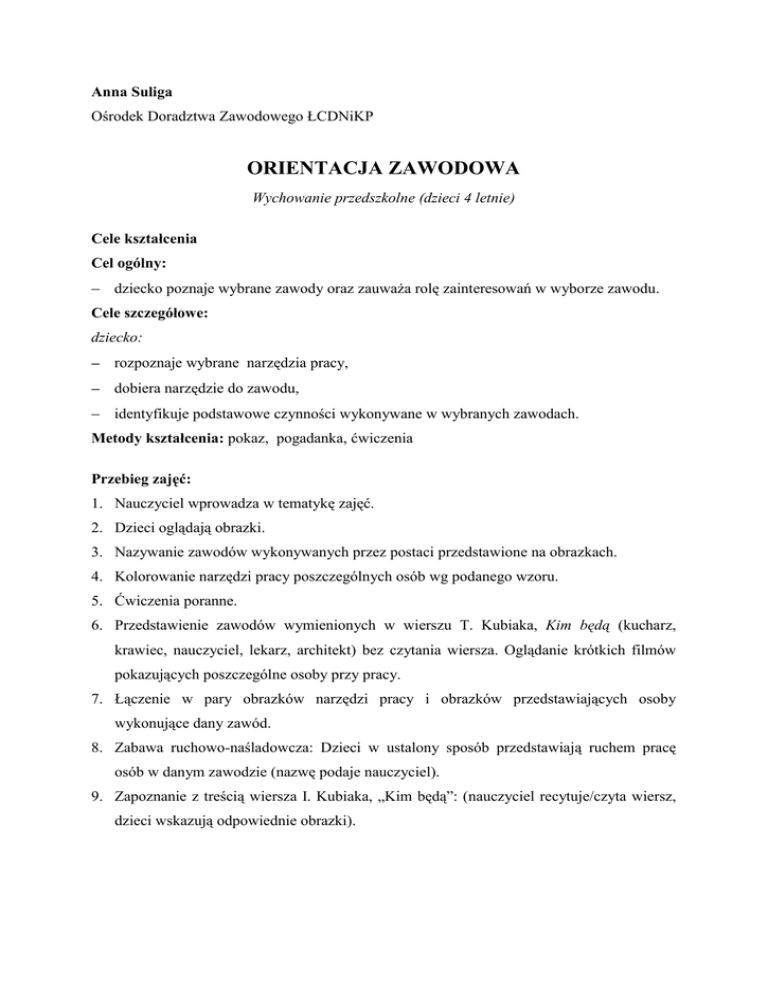 Anna Suliga Ośrodek Doradztwa Zawodowego ŁCDNiKP ORIENTACJA ZAWODOWA Wychowanie przedszkolne (dzieci 4 letnie) Cele kształcenia Cel ogólny: dziecko poznaje wybrane zawody oraz zauważa rolę zainteresowań w wyborze zawodu. Cele szczegółowe: dziecko: rozpoznaje wybrane narzędzia pracy, dobiera narzędzie do zawodu, identyfikuje podstawowe czynności wykonywane w wybranych zawodach. Metody kształcenia: pokaz, pogadanka, ćwiczenia Przebieg zajęć: 1. Nauczyciel wprowadza w tematykę zajęć. 2. Dzieci oglądają obrazki. 3. Nazywanie zawodów wykonywanych przez postaci przedstawione na obrazkach. 4. Kolorowanie narzędzi pracy poszczególnych osób wg podanego wzoru. 5. Ćwiczenia poranne. 6. Przedstawienie zawodów wymienionych w wierszu T. Kubiaka, Kim będą (kucharz, krawiec, nauczyciel, lekarz, architekt) bez czytania wiersza. Oglądanie krótkich filmów pokazujących poszczególne osoby przy pracy. 7. Łączenie w pary obrazków narzędzi pracy i obrazków przedstawiających osoby wykonujące dany zawód. 8. Zabawa ruchowo-naśladowcza: Dzieci w ustalony sposób przedstawiają ruchem pracę osób w danym zawodzie (nazwę podaje nauczyciel). 9. Zapoznanie z treścią wiersza I. Kubiaka, „Kim będą”: (nauczyciel recytuje/czyta wiersz, dzieci wskazują odpowiednie obrazki). Kiedy Zuzia będzie duża, Już nie będzie leczyć lalek, A prawdziwa pani doktor Wielkim zajmie się szpitalem. - A kim będzie Kasia? Wiemy!-woła Bolek, woła Lolek. Dzisiaj uczy kotka Mruczka, Duża – będzie uczyć w szkole. A Irenka szmatkę bierze, Tu przyszyje a tam utnie. Gdy urośnie... Już zgadliśmy! Będzie szyła piękne suknie.. Zaś Martusia, ta malutka, Bierze kredki – mądra główka! Dom rysuje. –też już wiemy! Będzie domy projektować. 10. Ćwiczenia słuchowe: wysłuchiwanie dźwięków wydawanych przez narzędzia i podnoszenie odpowiednich obrazków przedstawiających narzędzia. 11. Omówienie treści wiersza: Kim chcą być dziewczynki z wiersza? Co lubią robić? 12. Praca indywidualna – rysowanie na temat „Jaki zawód chciałbym/chciałabym wykonywać?”.