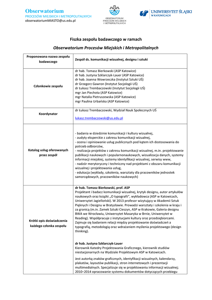 Obserwatorium PROCESÓW MIEJSKICH I METROPOLITALNYCH [email protected] Fiszka zespołu badawczego w ramach Obserwatorium Procesów Miejskich i Metropolitalnych Proponowana nazwa zespołu badawczego Członkowie zespołu Zespół ds. komunikacji wizualnej, designu i sztuki dr hab. Tomasz Bierkowski (ASP Katowice) dr hab. Justyna Szklarczyk-Lauer (ASP Katowice) dr hab. Joanna Wowrzeczka (Instytut Sztuki UŚ) dr Grzegorz Gawron (Instytut Socjologii UŚ) dr Łukasz Trembaczowski (Instytut Socjologii UŚ) mgr Jan Piechota (ASP Katowice) mgr Natalia Pietruszewska (ASP Katowice) mgr Paulina Urbańska (ASP Katowice) dr Łukasz Trembaczowski, Wydział Nauk Społecznych UŚ Koordynator [email protected] Katalog usług oferowanych przez zespół Krótki opis doświadczenia każdego członka zespołu - badania w dziedzinie komunikacji i kultury wizualnej, - audyty eksperckie z zakresu komunikacji wizualnej, - ocena i opiniowanie usług publicznych pod kątem ich dostosowania do potrzeb odbiorców, - realizacja projektów z zakresu komunikacji wizualnej, m.in. projektowanie publikacji naukowych i popularnonaukowych, wizualizacja danych, systemy informacji miejskiej, systemy identyfikacji wizualnej, serwisy www, - nadzór merytoryczny i techniczny nad projektami z obszaru komunikacji wizualnej i projektowania usług, - edukacja (wykłady, szkolenia, warsztaty dla pracowników jednostek samorządowych, pracowników naukowych) dr hab. Tomasz Bierkowski, prof. ASP Projektant i badacz komunikacji wizualnej, krytyk designu, autor artykułów naukowych oraz książki „O typografii", wykładowca (ASP w Katowicach, Uniwersytet Jagielloński). W 2013 profesor wizytujący w Akademii Sztuk Pięknych i Designu w Bratysławie. Prowadzi warsztaty i szkolenia w kraju i za granicą (m.in. Zamek Sztuki Cieszyn, ASP w Krakowie, Galeria designu BWA we Wrocławiu, Uniwersytet Masaryka w Brnie, Uniwersytet w Reading). Współpracuje z instytucjami kultury oraz przedsiębiorcami. Zajmuje się badaniem relacji między projektowanie doświadczeń a typografią, metodologią oraz wdrażaniem myślenia projektowego (design thinking). dr hab. Justyna Szklarczyk-Lauer Kierownik Katedry Projektowania Graficznego, kierownik studiów niestacjonarnych na Wydziale Projektowym ASP w Katowicach. Jest autorką znaków graficznych, identyfikacji wizualnych, kalendarzy, plakatów, layoutów publikacji, stron internetowych i prezentacji multimedialnych. Specjalizuje się w projektowaniu informacji wizualnej; 2010–2014 opracowanie systemu dokumentów dotyczących przebiegu Obserwatorium PROCESÓW MIEJSKICH I METROPOLITALNYCH [email protected] studiów w Akademii Sztuk Pięknych w Katowicach, 2016 – Nowe Formularze Sądowe – zestaw interaktywnych infografik i wzorów dokumentów prawniczych, we współpracy z instytutem INPRIS i Stowarzyszeniem Przyjaciół Integracji, wizualizacja budżetu Katowic na 2016 i 2017 rok. dr hab. Joanna Wowrzeczka Artystka (habilitacja w zakresie sztuk pięknych) i socjolożka (doktor nauk humanistycznych). Jako socjolożka zajmuje się badaniem pola sztuki w Polsce, jako artystka problemem zdominowanych i przestrzenią publiczną. Od 1999 roku pracuje w Instytucie Sztuki Uniwersytetu Śląskiego. Od 2010 koordynuje Świetlicę Krytyki Politycznej "Na Granicy" w Cieszynie. Współzałożycielka Galerii "Szara", jej kuratorka w latach 2001–2005. dr Grzegorz Gawron Doktor nauk humanistycznych w zakresie socjologii. Adiunkt w Zakładzie Socjologii Rozwoju Instytutu Socjologii na Wydziale Nauk Społecznych Uniwersytetu Śląskiego w Katowicach. Wykładowca w Akademii Sztuk Pięknych w Katowicach oraz gościnny wykładowca w Uniwersytecie Mateja Bela w Bańskiej Bystrzycy (Słowacja); University of Kirikkale (Turcja); Comenius University In Bratislava (Słowacja). Zainteresowania badawcze: proces starzenia się, społeczna odpowiedzialność biznesu (CSR), społeczne zastosowanie designu. dr Łukasz Trembaczowski Socjolog, adiunkt w Zakładzie Socjologii Organizacji, Gospodarki i Metodologii Badań na Wydziale Nauk Społecznych Uniwersytetu Śląskiego, a także wykładowca w Zakładzie Teorii i Historii Sztuki ASP w Katowicach. Koordynator kilkunastu projektów badawczych, autor i współautor badań ewaluacyjnych i diagnostycznych. Jego zainteresowania obejmują socjologię gospodarki i rozwoju, socjologię ryzyka i socjologię sztuki. mgr Natalia Pietruszewska Absolwentka Akademii Sztuk Pięknych w Katowicach. Projektantka i badacz komunikacji wizualnej. Zawodowo zajmuje się projektowaniem komunikacji wizualnej oraz interfejsów (identyfikacja wizualna, publikacja, serwisy www) oraz projektowaniem doświadczeń i usług. Współpracowała zawodowo z Instytucjami kultury (m.in. NOSPR w Katowicach, Teatr Zagłębia, Miasto Ogrodów Instytucja Kultury Katowice), przedsiębiorcami (m.in. code. Design, M-Studio, Musk, KoniorStudio). Zainteresowania badawcze: projektowanie zorientowane na użytkownika, metodologia design thinking. mgr Paulina Urbańska Projektantka i badacz komunikacji wizualnej, pracownik naukowodydaktyczny na Wydziale Projektowym ASP w Katowicach oraz Wydziale Polonistyki UJ w Krakowie. Zajmuje się projektowaniem komunikacji wizualnej, a przede wszystkim informacji, publikacji i identyfikacji. Współpracuje z instytucjami kultury (m.in. Medialab Katowice, Narodowa Orkiestra Symfoniczna Polskiego Radia i Narodowe Centrum Kultury). Angażuje się w organizację wydarzeń projektowych i działania organizacji non-profit wykorzystujących narzędzia projektowe w celach edukacyjnych i badawczych. 2 Obserwatorium PROCESÓW MIEJSKICH I METROPOLITALNYCH [email protected] 3
