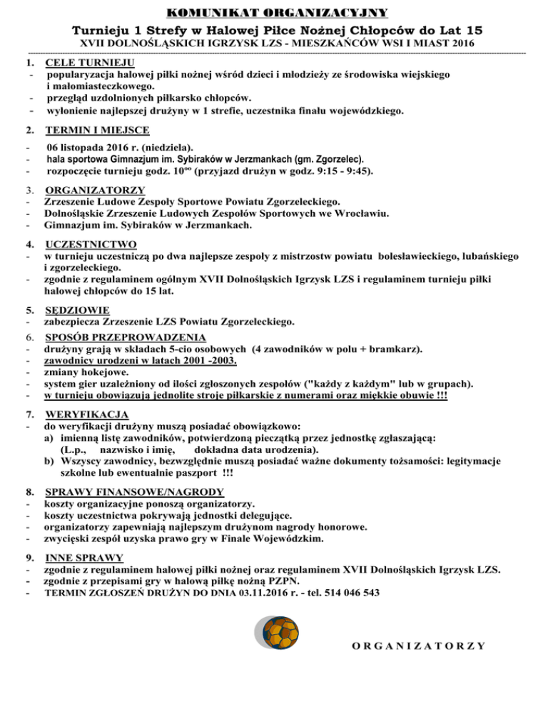 - zgodnie z regulaminem ogólnym XVII Dolnośląskich Igrzysk LZS i regulaminem turnieju piłki