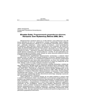 Nr 7 DOCTRINA Studia Spo eczno-Polityczne 2010 JERZY STA CZYK Uniwersytet Przyrodniczo-Humanistyczny Siedlce Miros aw Su ek, Programowanie gospodarczo-obronne, Warszawa: Dom Wydawniczy Bellona 2008, 294 s. Bezpiecze stwo narodowe opiera si na kilku filarach i poza politycznym oraz militarnym zaliczamy do nich m.in.: gospodarczy i moralny. Upraszczaj c, mo na zak ada , e tym filarem gospodarczym zajmuje si w szczególno ci ekonomika obrony, politycznym politologia, wojskowym sztuka wojenna, a moralnym nauki humanistyczne. W dzisiejszym, jak e z o onym wiecie uproszczenia (cho atrakcyjne dla naszej percepcji) nie odzwierciedlaj jednak z o ono ci zjawisk czy procesów, a inaczej to ujmuj c wielowymiarowo ci badanych dziedzin. Tak te jest z ekonomik obrony, która jest jak wskazuje jej nazwa specyficzn dyscyplin ekonomiczn , zawieraj c nie tylko pierwiastki obronne (wojskowe), ale równie polityczne i moralne. W celu podkre lenia wielodyscyplinarnego jej charakteru cz sto stosuje si nazw ekonomia polityczna obrony, a ostatnio te ekonomika bezpiecze stwa. Zainteresowanie zagadnieniami bezpiecze stwa narodowego w ostatnich latach wyra nie ro nie. Ju kilka uczelni kszta ci studentów na kierunku bezpiecze stwo narodowe. Zauwa amy jednak, e w standardach kszta cenia na tym kierunku problematyka ekonomiczno-obronna jest raczej s abo reprezentowana, co mo e mie zwi zek z tym, e zwarte badawcze rodowisko ekonomiczno-obronne w Polsce ju praktycznie nie istnieje. Dlatego w pe ni na uwag zas uguje omawiana monografia. Autor omawianej ksi ki, to znany ekonomista, politolog, prakseolog i analityk studiów strategicznych. Miros aw Su ek by profesorem Akademii Obrony Narodowej (1995 1998), Akademii Podlaskiej (19972002) oraz Wy szej Szko y Ekonomii i Prawa w Kielcach (20002007). Pracowa te w Rz dowym Centrum Studiów Strategicznych na stanowisku wicedyrektora Departamentu Spraw Obronnych (19981999). Od 2002 roku jest profesorem w Instytucie Stosunków Mi dzynarodowych Uniwersytetu Warszawskiego. Opublikowa kilka ksi ek, w tym podr czniki akademickie. Omawiana praca stanowi zwie czenie jego wieloletniego dorobku ekonomiczno-obronnego, b d cego cz ci bada nad bezpiecze stwem narodowym. Warto podkre li , e omawiana ksi ka nie ma siebie podobnej w naszym kraju w ostatnich kilkudziesi ciu latach. Jej przedmiotem s koncepcyjne przygotowania w gospodarce oraz badania ekonomiczno-obronne ukierunkowane na podejmowanie decyzji. Autor przedstawi w niej teoretyczno-metodologiczne podstawy programowania gospodarczo-obronnego z uwzgl dnieniem w zasad sztuki wojennej. Zbli onych zagadnie , aczkolwiek nie tak szczegó owo, dotyczy praca Wac awa Stankiewicza Planowanie obronne: studium podstaw teoretycznych (Wydawnictwo MON, Warszawa 1977) oraz bardziej wyspecjalizowana w tematyce analitycznej Analiza systemów w planowaniu obrony: aspekty ekonomiczno-polityczne Antoniego Roguckiego (Wydawnictwo MON, Warszawa 1975). Nie by o natomiast ksi ki po wi conej wy cznie programowaniu czy planowaniu gospodarczo-obronnemu. 222 J. STA CZYK Recenzowana praca sk ada si ze: wst pu (Od autora), sze ciu rozdzia ów, zako czenia, spisów tabel, tablic i rysunków oraz obszernej bibliografii. Niezale nie od powy szych elementów struktury, w ksi ce da si wyró ni dwie wyra ne cz ci. Pierwsza obejmuje rozdzia y od pierwszego do pi tego, w sposób logiczny i przejrzysty przedstawia programowanie gospodarczo-obronne od spraw podstawowych do zaawansowanych. Druga (ostatni rozdzia ) jest po wi cona teoretycznym i praktycznym aspektom programowania gospodarczo-obronnego w Polsce. Rozdzia pierwszy (Ekonomika bezpiecze stwa teoretyczna podstawa programowania gospodarczo-obronnego) przygotowuje teoretyczny grunt do dalszych rozwaa podj tych w ksi ce. Mamy tu krótki rys historyczny rozwoju bada ekonomiczno-obronnych w okresie zimnej wojny i po jej zako czeniu (wraz ze szczegó owym odniesieniem do pogl dów Andrew L. Rossa na temat zakresu i przedmiotu badawczego ekonomii politycznej obrony oraz okre lania jej przedmiotu w koncepcjach Keitha Hartleya i Todda Sandlera). Osobny punkt jest po wi cony omówieniu rozwoju bada ekonomiczno-obronnych w Polsce po zimnej wojnie. Autor skupi uwag na zasadno ci wyodr bnienia ekonomiki bezpiecze stwa jako nauki o powi zaniach mi dzy gospodark a bezpiecze stwem, relacjach mi dzy nimi oraz perspektywach badawczych. W rozdziale drugi (Gospodarcze podstawy bezpiecze stwa obiekt programowania gospodarczo-obronnego) Autor przedstawia na wst pie poj cie gospodarczych podstaw bezpiecze stwa (wyszczególniaj c m.in. odmienno uwarunkowa gospodarki obronnej w systemach scentralizowanym i zdecentralizowanym). Analizuje ogólnoekonomiczne i sektorowe podstawy bezpiecze stwa. Te drugie s ci le zwi zane z finansowaniem obrony (bezpiecze stwa), baz produkcyjno-us ugow , a tak e ze sfer mi dzynarodowych stosunków gospodarczych (bezpiecze stwo ekonomiczne). W obu podej ciach gospodarka jawi si w rozwa aniach Autora jako podstawa pot gi (si y) pa stw. W zwi zku z tym niebezzasadne jest przedstawienie w tym rozdziale zagadnienia dotycz cego relacji mi dzy gospodark a potencja em bojowym si zbrojnych. Autor poruszy równie problemy zagro e gospodarczo-obronnych i strategii przeciwdzia ania im: strategie niezale no ci absolutnej (autarkiczne) oraz strategie niezale no ci wzgl dnej (wspó zale no ci i wspó pracy). Istotne s tu rozwa ania po wi cone gospodarczym ograniczeniom strategii przeciwdzia ania, strategicznym ograniczeniom gospodarki obronnej, a tak e politycznym funkcjom przedsi biorstw mi dzynarodowych. Rozdzia trzeci (Programowanie gospodarczo-obronne jako proces podejmowania decyzji) traktuje programowanie gospodarczo-obronne jako kategori prakseologiczn . Prakseologia jest jak wiadomo nauk o ludzkim dzia aniu, a ka de wiadome dzia anie ma dwie fazy: podj cie decyzji i jej realizacja. Na wst pie rozdzia u zosta y przedstawione syntetycznie sposoby podejmowania decyzji obronnych, które obejmuje ró ne formy: planowanie, 