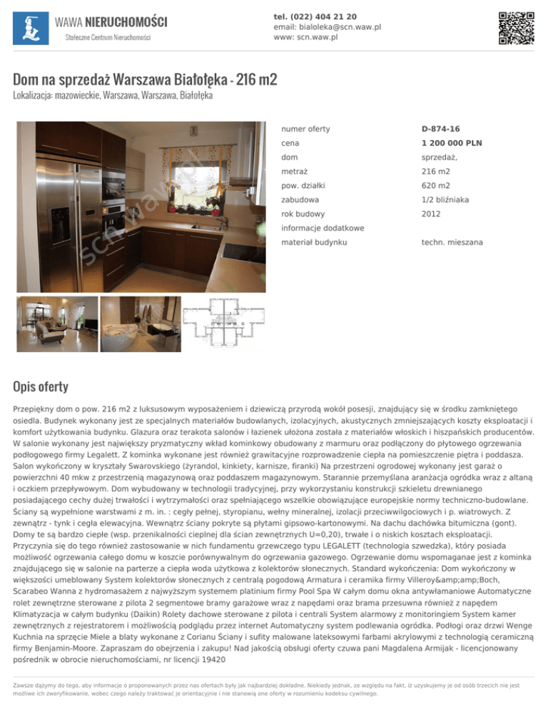tel. (022) 404 21 20 email: [email protected] www: scn.waw.pl Dom na sprzedaż Warszawa Białołęka - 216 m2 Lokalizacja: mazowieckie, Warszawa, Warszawa, Białołęka numer oferty D-874-16 cena 1 200 000 PLN dom sprzedaż, metraż 216 m2 pow. działki 620 m2 zabudowa 1/2 bliźniaka rok budowy 2012 informacje dodatkowe materiał budynku techn. mieszana Opis oferty Przepiękny dom o pow. 216 m2 z luksusowym wyposażeniem i dziewiczą przyrodą wokół posesji, znajdujący się w środku zamkniętego osiedla. Budynek wykonany jest ze specjalnych materiałów budowlanych, izolacyjnych, akustycznych zmniejszających koszty eksploatacji i komfort użytkowania budynku. Glazura oraz terakota salonów i łazienek ułożona została z materiałów włoskich i hiszpańskich producentów. W salonie wykonany jest największy pryzmatyczny wkład kominkowy obudowany z marmuru oraz podłączony do płytowego ogrzewania podłogowego firmy Legalett. Z kominka wykonane jest również grawitacyjne rozprowadzenie ciepła na pomieszczenie piętra i poddasza. Salon wykończony w kryształy Swarovskiego (żyrandol, kinkiety, karnisze, firanki) Na przestrzeni ogrodowej wykonany jest garaż o powierzchni 40 mkw z przestrzenią magazynową oraz poddaszem magazynowym. Starannie przemyślana aranżacja ogródka wraz z altaną i oczkiem przepływowym. Dom wybudowany w technologii tradycyjnej, przy wykorzystaniu konstrukcji szkieletu drewnianego posiadającego cechy dużej trwałości i wytrzymałości oraz spełniającego wszelkie obowiązujące europejskie normy techniczno-budowlane. Ściany są wypełnione warstwami z m. in. : cegły pełnej, styropianu, wełny mineralnej, izolacji przeciwwilgociowych i p. wiatrowych. Z zewnątrz - tynk i cegła elewacyjna. Wewnątrz ściany pokryte są płytami gipsowo-kartonowymi. Na dachu dachówka bitumiczna (gont). Domy te są bardzo ciepłe (wsp. przenikalności cieplnej dla ścian zewnętrznych U=0,20), trwałe i o niskich kosztach eksploatacji. Przyczynia się do tego również zastosowanie w nich fundamentu grzewczego typu LEGALETT (technologia szwedzka), który posiada możliwość ogrzewania całego domu w koszcie porównywalnym do ogrzewania gazowego. Ogrzewanie domu wspomaganae jest z kominka znajdującego się w salonie na parterze a ciepła woda użytkowa z kolektorów słonecznych. Standard wykończenia: Dom wykończony w większości umeblowany System kolektorów słonecznych z centralą pogodową Armatura i ceramika firmy Villeroy&Boch, Scarabeo Wanna z hydromasażem z najwyższym systemem platinium firmy Pool Spa W całym domu okna antywłamaniowe Automatyczne rolet zewnętrzne sterowane z pilota 2 segmentowe bramy garażowe wraz z napędami oraz brama przesuwna również z napędem Klimatyzacja w całym budynku (Daikin) Rolety dachowe sterowane z pilota i centrali System alarmowy z monitoringiem System kamer zewnętrznych z rejestratorem i możliwością podglądu przez internet Automatyczny system podlewania ogródka. Podłogi oraz drzwi Wenge Kuchnia na sprzęcie Miele a blaty wykonane z Corianu Ściany i sufity malowane lateksowymi farbami akrylowymi z technologią ceramiczną firmy Benjamin-Moore. Zapraszam do obejrzenia i zakupu! Nad jakością obsługi oferty czuwa pani Magdalena Armijak - licencjonowany pośrednik w obrocie nieruchomościami, nr licencji 19420 Zawsze dążymy do tego, aby informacje o proponowanych przez nas ofertach były jak najbardziej dokładne. Niekiedy jednak, ze względu na fakt, iż uzyskujemy je od osób trzecich nie jest możliwe ich zweryfikowanie, wobec czego należy traktować je orientacyjnie i nie stanowią one oferty w rozumieniu kodeksu cywilnego. tel. (022) 404 21 20 email: [email protected] www: scn.waw.pl Lokalizacja Osoba kontaktowa Anna Kwiatkowska województwo mazowieckie powiat Warszawa [email protected] miasto Warszawa dzielnica Białołęka Chętnie udzielę dodatkowych informacji związanych z tą ofertą. Zapraszam do kontaktu! tel. 508561858 Zawsze dążymy do tego, aby informacje o proponowanych przez nas ofertach były jak najbardziej dokładne. Niekiedy jednak, ze względu na fakt, iż uzyskujemy je od osób trzecich nie jest możliwe ich zweryfikowanie, wobec czego należy traktować je orientacyjnie i nie stanowią one oferty w rozumieniu kodeksu cywilnego.