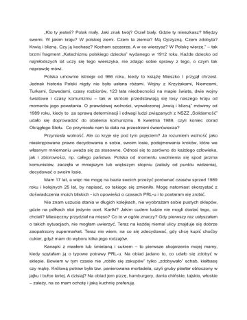 „Kto ty jesteś? Polak mały. Jaki znak twój? Orzeł biały. Gdzie ty mieszkasz? Między swemi. W jakim kraju? W polskiej ziemi. Czem ta ziemia? Mą Ojczyzną. Czem zdobyta? Krwią i blizną. Czy ją kochasz? Kocham szczerze. A w co wierzysz? W Polskę wierzę.” – tak brzmi fragment „Katechizmu polskiego dziecka” wydanego w 1912 roku. Każde dziecko od najmłodszych lat uczy się tego wierszyka, nie zdając sobie sprawy z tego, o czym tak naprawdę mówi. Polska umownie istnieje od 966 roku, kiedy to książę Mieszko I przyjął chrzest. Jednak historia Polski nigdy nie była usłana różami. Wojny z Krzyżakami, Niemcami, Turkami, Szwedami, czasy rozbiorów, 123 lata nieobecności na mapie świata, dwie wojny światowe i czasy komunizmu – tak w skrócie przedstawiają się losy naszego kraju od momentu jego powstania. O prawdziwej wolności, wywalczonej „krwią i blizną” mówimy od 1989 roku, kiedy to za sprawą determinacji i odwagi ludzi zwi ązanych z NSZZ „Solidarno ść” udało się doprowadzić do obalenia komunizmu. 6 kwietnia 1989, czyli koniec obrad Okrągłego Stołu. Co przyniosła nam ta data na przestrzeni ćwierćwiecza? Przyniosła wolność. Ale co kryje się pod tym pojęciem? Ja rozumiem wolno ść jako nieskrępowane prawo decydowania o sobie, swoim losie, podejmowania kroków, które we własnym mniemaniu uważa się za stosowne. Odnosi się to zarówno do każdego człowieka, jak i zbiorowości, np. całego państwa. Polska od momentu uwolnienia się spod jarzma komunistów, zaczęła w mniejszym lub większym stopniu (zależy od punktu widzenia), decydować o swoim losie. Mam 17 lat, a więc nie mogę na bazie swoich przeżyć porównać czasów sprzed 1989 roku i kolejnych 25 lat, by napisać, co takiego się zmieniło. Mogę natomiast skorzystać z doświadczenia moich bliskich - ich opowieści o czasach PRL-u i to postaram się zrobić. Nie znam uczucia stania w długich kolejkach, nie wyobrażam sobie pustych sklepów, gdzie na półkach stoi jedynie ocet. Kartki? Jakim cudem ludzie nie mogli dostać tego, co chcieli? Miesięczny przydział na mięso? Co to w ogóle znaczy? Gdy pierwszy raz usłyszałam o takich sytuacjach, nie mogłam uwierzyć. Teraz na każdej niemal ulicy znajduje się dobrze zaopatrzony supermarket. Teraz nie wiem, na co się zdecydować, gdy chcę kupić choćby cukier, gdyż mam do wyboru kilka jego rodzajów. Kanapki z masłem lub śmietaną i cukrem – to pierwsze skojarzenie mojej mamy, kiedy spytałam ją o typowe potrawy PRL-u. Na obiad jadano to, co udało się zdobyć w sklepie. Bowiem w tym czasie nie „robiło się zakupów” tylko „zdobywało” schab, kiełbasę czy mąkę. Królową potraw była tzw. panierowana mortadela, czyli gruby plaster obtoczony w jajku i bułce tartej. A dzisiaj? Na obiad jem pizzę, hamburgery, dania chińskie, tajskie, włoskie – zależy, na co mam ochotę i jaką kuchnię preferuję. Nie znam też uczucia, o którym wielokrotnie opowiadała mi mama, kiedy to największą frajdą na Wigilię była pomarańcza. Ja pomarańcze mogę jeść praktycznie codziennie. Pomarańcze, banany, mandarynki, mango, awokado lub owoce kaki czy liczi, o których istnieniu sama jeszcze jakiś czas temu nie miałam poj ęcia. Coraz cz ęściej poznaję nowe smaki owoców. Mam do nich dostęp praktycznie 365 dni w roku. Brak telewizji, Internetu – dla mnie, współczesnej nastolatki, jest to niepojęte. Dwa kanały w czarno-białej telewizji, kiedy ja mam do dyspozycji około 200 w jakości HD? Czasami nie wiem, co wybrać, gdy siedzę wieczorem przed ekranem telewizora. Internet służy mi jako źródło informacji potrzebnych do pracy domowej, jako rozrywka, gdy nie mam co robić oraz jako sposób na kontaktowanie się z moimi znajomymi. Jak można było bez tego funkcjonować? To jest właśnie wolność. To, że mam do wszystkiego dostęp – od żywności, przez pomoce naukowe, do najwyższej jakości sprzętu elektronicznego. To, że mogę iść spokojnie na spotkanie do znajomych, bez obaw, że po 22 mogę być bez powodu skontrolowana i zatrzymana przez policję. Taki los spotkał niemalże mojego rówieśnika maturzystę Grzegorza Przemyka. Pobity zupełnie bez powodu przez milicję 12 maja 1983, zmarł po dwóch dniach od zatrzymania. Dziś mogę głośno wyrażać swoje poglądy. Sama je kształtuję, bo uczę się w szkole z wolnych od cenzury i indoktrynacji podręczników, bo moi nauczyciele, choć narzekają na zarobki, są ludźmi otwartymi i nie zmuszają mnie do powtarzania frazesów na cześć „jedynie słusznego systemu”. (O innej szkole opowiadał mi mój tata.) Przy takiej wolności słowa niemożliwe do osiągnięcia są wyniki głosowań, o jakich słyszymy chociażby z Rosji – 100% poparcie, 90% poparcie. Wolność to także możliwość otrzymania w każdej chwili paszportu. Dziś, o ile pozwalają mi na to fundusze, mogę zwiedzać dowolny zakątek świata. Gdy oglądam film biograficzny na temat Marka Hłasko, trudno mi zrozumieć jego problemy paszportowe i fakt, że nie mógł powrócić do ojczyzny z powodów politycznych. Tata zwrócił mi również uwagę na to, że wszyscy koledzy z jego klasy, którym nie udało się dostać na studia po maturze, musieli odbywać obowiązkową służbę wojskową. Moi starsi koledzy nie mają takich problemów, nie muszą obowiązkowo iść do wojska, dziś mamy armię zawodową. Wyliczając tak wszystkie przemiany może się wydawać, że jestem w raju, tak jak w raju byli też nasi pierwsi rodzice. Co prawda Polsce daleko do Eldorado, czy do „Zielonej Wyspy”. Dużym problemem jest bezrobocie. Kiedyś każdy chętny do pracy miał zapewnioną posadę, jednak wiązało się to z nieefektywnością, kiedy to bez względu na wszystko: „czy się stoi czy się leży, dwa tysiące się należy”. Obecnie ludzie drżą o swoje posady, coraz częściej wyjeżdżają za granicę i tu pojawia się temat przystąpien