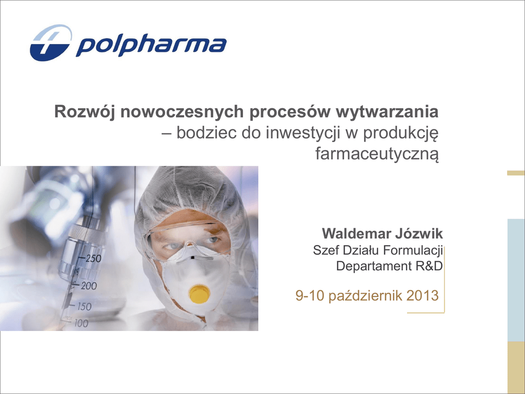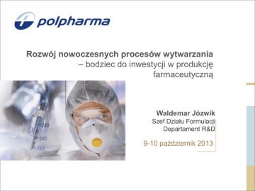 Rozwój nowoczesnych procesów wytwarzania – bodziec do inwestycji w produkcję farmaceutyczną Waldemar Józwik Szef Działu Formulacji Departament R&D 9-10 październik 2013 Agenda 1. Charakterystyka nowoczesnego procesu wytarzania 2. Własność intelektualna 3. Krytyczne atrybuty jakości (Critical Quality Attributes) 4. Prognoza rynku produktów generycznych 5. W przyjaźni z naturą (Environmental Sustainability) 6. Złożoność procesu wytwarzania 7. Elastyczność 8. Powtarzalność 9. Koszt 10. Podsumowanie Charakterystyka nowoczesnego procesu wytwarzania Nowoczesny proces wytwarzania Nie narusza praw własności intelektualnej Pozwala na realizację wymagań Krytycznych Atrybutów Jakości Jest przyjazny środowisku Nie jest szczególnie skomplikowany Jest elastyczny ze względu na wielkość serii Jest powtarzalny Jest tani Własność intelektualna Zakres ochrony patentowej Rozkład wielkości cząstek Obecność formy polimorficznej Zawartość substancji leczniczej w produkcie Proces wytwarzania Specyficzne substancje pomocnicze Krytyczne Atrybuty Jakości (Critical Quality Attributes) Wpływ procesu wytwarzania na Krytyczne Atrybuty Jakości Brak stabilność fizycznej (konwersja polimorficzna) o W wyniku rekrystalizacji z rozpuszczalnika wodnego lub organicznego o Pod wpływem długotrwale podwyższonej temperatury o Jako skutek stresu mechanicznego Brak stabilność chemicznej (degradacja chemiczna) o W wyniku hydrolizy w środowisku wodnym o Na skutek interakcji występujących w środowisku wodnym pod wpływem podwyższonej temperatury Krytyczne Atrybuty Jakości (Critical Quality Attributes) – ciąg dalszy Wpływ procesu wytwarzania na Krytyczne Atrybuty Jakości Brak deklarowanej zawartości i jednolitości zawartości substancji leczniczej o Z powodu niewłaściwej konfiguracji urządzenia (systemy podawania i mieszania) o Z powodu niewłaściwego (niereprezentatywnego) próbkowania Brak dostępności farmaceutycznej o Z powodu niewłaściwej rozpuszczalność kinetycznej substancji leczniczej o W wyniku zmiany rozmiaru cząstek na skutek rekrystalizacji o Jako efekt rekrystalizacji lub transformacji polimorficznej do formy o innej rozpuszczalności Prognoza rynku produktów generycznych 90% NCE to substancje z II i IV klasy BCS W przypadku słabej rozpuszczalność substancji leczniczej (tym samym słabą lub obarczona dużą zmiennością biodostępnością), procesy wytwarzania muszą pozwalać na solubilizację substancji leczniczej. The Innovator Pipeline: Bioavailability Challenges and Advanced Oral Drug Delivery Opportunities, R. Lipp, American Pharmaceutical Review, 2013 Proces przyjazny środowisku naturalnemu Minimalizacja wpływu procesu wytwarzania na środowisko o Projektowanie procesów wytwarzania o mniejszym zapotrzebowaniu na energię cieplną i elektryczną o Ograniczenie emisji odpadów chemicznych i opakowań o Eliminacja z procesów wytwarzania rozpuszczalników organicznych o Ograniczenie powstawania i emisji pyłów Złożoność procesu wytwarzania Powder mixing Powder mixing Powder mixing Powder mixing Powder mixing HIGH-SHEAR GRANULATION FLUID-BED GRANULATION ROLLERCOMPACTION HOT-MELT EXTRUSION Tabletting or capsule filling Wet screening Dry screening Powder mixing Spheronisation FLUID-BED DRYING Powder mixing Tabletting or capsule filling Tabletting or capsule filling Dry screening Tabletting or capsule filling Powder mixing Tabletting or capsule filling Zalety procesów w stosunku do granulacji opartej o rozpuszczalniki: o Nie ma potrzeby stosowania rozpuszczalników wodnych i organicznych o Brak zanieczyszczeń resztkowych o Możliwość prowadzenie procesu ciągłego o Mniej etapów wytwarzania o Łatwość powiększenia skali (ograniczona ilość zmiennych) o Brak zależności od posiadanych objętości sprzętu o Mniejsze zużycie energii. Elastyczność Procesy granulacji szybkoobrotowej i fluidalnej o Wielkość serii dla procesów granulacji szybkoobrotowej i fluidalnej determinuje posiadany sprzęt o Powiększanie skali procesów jest skomplikowane i wymaga więcej niż jednego urządzenia o Procesy charakteryzują się dużą ilością zmiennych (parametrów procesu) o Nie pozwalają na prowadzenie procesu ciągłego Elastyczność – ciąg dalszy Procesy kompaktorowania i ekstruzji Kompaktorowanie Ekstruzja o Wielkość serii dla procesów kompaktorowania i ekstruzji jest niezależna od skali posiadanego sprzętu, ilość produktu determinowana jest przez czas trwania procesu wytwarzania o Powiększanie skali procesów nie jest skomplikowane ze względu na małą ilość zmiennych opisywanych o Procesy nie wymagają dostarczania dodatkowej energii i są prowadzone bez udziału rozpuszczalników Powtarzalność Ilość zmiennych niezależnych w procesach wytwarzania Granulacja szybkoobrotowa Granulacja fluidalna Kompaktorowanie Ekstruzja Czas mieszania Temperatura wlotowa Obroty podajnika Obroty podajnika Obroty pompy Temperatura produktu Obroty rolek Obroty śruby Średnica dyszy Wilgotność względna Ciśnienie Temperatura Sposób dodawania Temperatura roztworu Szerokość szczeliny Prędkość impelera Obroty pompy Prędkość choppera Średnica dyszy Czas granulacji Ciśnienie atomizujące Temperatura roztworu Sposób podawania Temperatura zbiornika Przepływ powietrza % wypełnienia % wypełnienia y = f(x1, x2, …, xn) + ε Powtarzalność – ciąg dalszy Ilość zmiennych niezależnych w procesach wytwarzania Ilość potencjalnie krytycznych parametrów procesu (pCPP) Granulacja szybkoobrotowa Granulacja fluidalna Kompaktorowanie Ekstruzja 10 10 4 3 Ilość eksperymentów (plan kompletny) w celu weryfikacji krytyczności parametrów procesu Granulacja szybkoobrotowa Granulacja fluidalna Kompaktorowanie Ekstruzja 2^10=1024 2^10=1024 2^4=16 2^3=8 Ilość eksperymentów (frakcyjny) w celu weryfikacji krytyczności parametrów procesu Granulacja szybkoobrotowa Granulacja fluidalna Kompaktorowanie Ekstruzja 32 32 8 4 Po