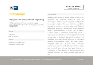 W ENDLER T REMML RECHTSANWÄLTE Szkolenie Delegowanie pracowników za granicę Obligatoryjne warunki pracy i przepisy prawa niemieckiego, których należy przestrzegać w przypadku delegowania Termin 11.05.2017 godz. 10.30-16.00 Miejsce Sala Konferencyjna AHK Polska ul. Miodowa 14 / Warszawa Cel szkolenia Delegowanie pracowników do Niemiec wymaga od pracodawcy wypełnienia kilku formalności zarówno w Polsce, jak i w Niemczech. Kluczowa jest kwestia prawa obowiązującego pracowników delegowanych. Przedsiębiorcy delegujący pracowników do Niemiec muszą im wypłacać wynagrodzenie na godzinę co najmniej w wysokości stawki płacy minimalnej obowiązującej w Niemczech według ustawy o płacy minimalnej (MiLoG – Mindestlohngesetz) a ponadto mieć na uwadze, iż na mocy ustawy o delegowaniu pracowników (AEntG – Arbeitnehmer-Entsendegesetz) w niektórych branżach obowiązują wyższe stawki. W zależności od tego, w jakiej branży pracownicy są zatrudniani w Niemczech, pracodawca zobowiązany jest do składania meldunków w urzędzie celnym oraz do prowadzenia ewidencji przepracowanych godzin dla celów kontroli. Przestrzegać należy też - w każdej branży - przepisów o maksymalnie dozwolonym wymiarze czasu pracy, o urlopie i innych. W przypadku transgranicznego użyczania pracowników także dotrzymać trzeba pewnych reguł. Warto zapoznać się z powyższymi zasadami, bowiem ich nieprzestrzeganie może skutkować nałożeniem kary grzywny sięgającej nawet 500.000 EUR. W ENDLER T REMML RECHTSANWÄLTE Program Delegowanie pracowników za granicę według rozporządzenia (WE) 883/2004 1. Znaczna działalność gospodarcza przedsiębiorstwa delegującego w państwie delegującym 2. Zatrudnienie pracownika w celu delegowania 3. Zakaz zastępowania pracownika 4. Delegowanie obywateli państw trzecich spoza UE Jakie prawo obowiązuje podczas delegowania pracownika do Niemiec? 1. Prawo ubezpieczeń społecznych a. Dalsze obowiązywanie polskich przepisów prawnych dotyczących zabezpieczenia społecznego b. Moc wiążąca wydawanych przez ZUS zaświadczeń A1 dla niemieckich instytucji ubezpieczenia społecznego 2. Prawo pracy a. Wybór prawa w umowie o pracę b. Stosowane prawo w przypadku niedokonania wyboru prawa c. Właściwy sąd w przypadku sporów prawnych / porozumienie co do właściwości sądu Obligatoryjne warunki pracy i regulacje prawa niemieckiego, których należy przestrzegać w przypadku delegowania 1. Ustawowa płaca minimalna i branżowe płace minimalne w branżach objętych ustawą o delegowaniu pracowników a. Płaca minimalna według Ustawy o płacy minimalnej (niem. Mindestlohngesetz) b. Przegląd branż objętych Ustawą o delegowaniu pracowników (niem. Arbeitnehmer-Entsendegesetz) i płac minimalnych, których należy przestrzegać w danej branży c. Obliczanie i części składowe płacy minimalnej – aktualne orzecznictwo 2. Obowiązki przedsiębiorstw delegujących do składania meldunków oraz do prowadzenia ewidencji czasu pracy i przechowywania dokumentów a. według Ustawy o płacy minimalnej (niem. Mindestlohngesetz) b. według Ustawy o delegowaniu pracowników (niem. Arbeitnehmer-Entsendegesetz) W ENDLER T REMML RECHTSANWÄLTE 3. a. b. c. d. 4. 5. 6. Warunki w przypadku użyczania pracowników Obowiązek posiadania zezwolenia Zasada równego traktowania (equal treatment, equal pay) Odstępstwa od zasady równego traktowania poprzez stosowanie układów zbiorowych pracy branży pracy tymczasowej Obwiązki składania meldunków oraz prowadzenia ewidencji czasu pracy i przechowywania dokumentów według Ustawy o użyczaniu pracowników (niem. Arbeitnehmerüberlassungsgesetz) Maksymalny czasy pracy oraz minimalne przerwy od pracy według Ustawy o wymiarze czasu pracy (niem. Arbeitszeitgesetz) Płatny minimalny urlop roczny Inne obligatoryjne przepisy prawa niemieckiego, których należy przestrzegać w przypadku delegowania Indywidualne pytania uczestników W ENDLER T REMML RECHTSANWÄLTE Prelegent Beata Donay (ur. Kośny) ukończyła prawo na Uniwersytecie w Kolonii. Od roku 2004 jest dopuszczona do zawodu adwokata. W tym samym roku podjęła ona też działalność w kancelarii WENDLER TREMML. Pani Mecenas Donay zajmuje się głównie obsługą prawną przedsiębiorstw realizujących przedsięwzięcia gospodarcze za granicą, w szczególności obsługą prawną polskich przedsiębiorstw w ramach ich działalności na rynku niemieckim. Spektrum doradztwa obejmuje obok kwestii prawa pracy i delegowania pracowników przede wszystkim doradztwo w zakresie prawa budowlanego, a także obsługę prawną w związku z tworzeniem oddziałów i spółek-córek w Niemczech, poza tym specjalizuje się w międzynarodowym prawie handlowym, prawie spółek handlowych oraz w prawie dotyczącym użyczania pracowników. Kancelaria WENDLER TREMML zajmuje się od ponad 20 lat obsługą prawną przedsiębiorstw z Europy Środkowej i Wschodniej. Specjalizacją kancelarii jest polsko-niemiecki obrót prawny. Głównym obszarem działalności kancelarii jest doradztwo w zakresie zakładania i rozbudowy działalności gospodarczej w Niemczech i innych krajach Unii Europejskiej. Poprzez współpracę ze spółką rewidentów gospodarczych i radców podatkowych jak również poprzez współpracę z międzynarodową siecią kancelarii partnerskich – Geneva Group International (GGI) – kancelaria zapewnia wszechstronną obsługę prawną z uwzględnieniem większości światowych systemów prawnych. Do grona klientów kancelarii należy wiele polskich przedsiębiorstw prowadzących działalność gospodarczą na skalę międzynarodową. Kontakt 40470 Düsseldorf Mörsenbroicher Weg 200 Tel.: +49 (0) 211 / 66 96 67-0 Fax.: +49 (0) 211 / 66 96 67 66 e-mail: [email protected] www.wendlertremml.de www.entsenderecht.de