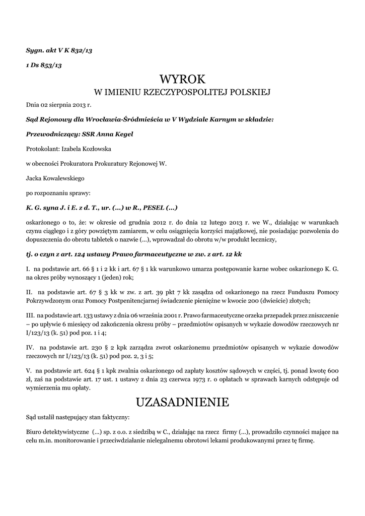 Sygn. akt V K 832/13 1 Ds 853/13 WYROK W IMIENIU RZECZYPOSPOLITEJ POLSKIEJ Dnia 02 sierpnia 2013 r. Sąd Rejonowy dla Wrocławia-Śródmieścia w V Wydziale Karnym w składzie: Przewodniczący: SSR Anna Kegel Protokolant: Izabela Kozłowska w obecności Prokuratora Prokuratury Rejonowej W. Jacka Kowalewskiego po rozpoznaniu sprawy: K. G. syna J. i E. z d. T., ur. (...) w R., PESEL (...) oskarżonego o to, że: w okresie od grudnia 2012 r. do dnia 12 lutego 2013 r. we W., działając w warunkach czynu ciągłego i z góry powziętym zamiarem, w celu osiągnięcia korzyści majątkowej, nie posiadając pozwolenia do dopuszczenia do obrotu tabletek o nazwie (...), wprowadzał do obrotu w/w produkt leczniczy, tj. o czyn z art. 124 ustawy Prawo farmaceutyczne w zw. z art. 12 kk I. na podstawie art. 66 § 1 i 2 kk i art. 67 § 1 kk warunkowo umarza postępowanie karne wobec oskarżonego K. G. na okres próby wynoszący 1 (jeden) rok; II. na podstawie art. 67 § 3 kk w zw. z art. 39 pkt 7 kk zasądza od oskarżonego na rzecz Funduszu Pomocy Pokrzywdzonym oraz Pomocy Postpenitencjarnej świadczenie pieniężne w kwocie 200 (dwieście) złotych; III. na podstawie art. 133 ustawy z dnia 06 września 2001 r. Prawo farmaceutyczne orzeka przepadek przez zniszczenie – po upływie 6 miesięcy od zakończenia okresu próby – przedmiotów opisanych w wykazie dowodów rzeczowych nr I/123/13 (k. 51) pod poz. 1 i 4; IV. na podstawie art. 230 § 2 kpk zarządza zwrot oskarżonemu przedmiotów opisanych w wykazie dowodów rzeczowych nr I/123/13 (k. 51) pod poz. 2, 3 i 5; V. na podstawie art. 624 § 1 kpk zwalnia oskarżonego od zapłaty kosztów sądowych w części, tj. ponad kwotę 600 zł, zaś na podstawie art. 17 ust. 1 ustawy z dnia 23 czerwca 1973 r. o opłatach w sprawach karnych odstępuje od wymierzenia mu opłaty. UZASADNIENIE Sąd ustalił następujący stan faktyczny: Biuro detektywistyczne (...) sp. z o.o. z siedzibą w C., działając na rzecz firmy (...), prowadziło czynności mające na celu m.in. monitorowanie i przeciwdziałanie nielegalnemu obrotowi lekami produkowanymi przez tę firmę. W ramach prowadzonej działalności pracownicy biura ustalili, że na portalu internetowym (...) osoba przedstawiająca się jako K.oferuje do sprzedaży lek o nazwie V.. Sprzedający jako telefon kontaktowy podawał numer (...)oraz adres e-mail: (...) W dniach 05 – 07 grudnia 2012 r. przedstawiciel biura dokonał zakupu testowego 30 tabletek oferowanego leku za kwotę 300 zł. Dowód: zeznania świadka G. B. k. 6 – 7 Zatrzymany przez funkcjonariuszy Wydziału do (...)z Przestępczością Gospodarczą Komendy Wojewódzkiej Policji we W.w dniu 12 lutego 2013 r., K. G.– na ich żądanie – dobrowolnie wydał 14 opakowań z napisem (...), zawierających po 30 tabletek oraz jedno opakowanie z zawartością 22 tabletek Vide: protokół przeszukania osoby k. 16 - 18 Tabletki ujawnione przy oskarżonym stanowiły sfałszowany produkt leczniczy, oryginalnie produkowany przez firmę (...) pod nazwa Viagra. Zakwestionowane tabletki w istotny sposób różniły się od produktu oryginalnego zarówno pod względem rozmiarów, jak i masy. Wykazywały też dużą zmienności substancji czynnej – zarówno między sobą, jak i względem produktu oryginalnego. Dowód: opinia fizykochemiczna k. 56 – 60 K. G. ma wyższe wykształcenie, pracuje w (...) Oddział we W.; na utrzymaniu ma jedno dziecko. Oskarżony nie był dotychczas karany sądownie. Dowód: wyjaśnienia oskarżonego k. 91 dane o karalności k. 55, 74 Przesłuchany w charakterze oskarżonego K. G. przyznał się do popełnienia zarzucanego mu czynu. Wyjaśnił, że tabletki kupił w legalnym obrocie – w aptece w Egipcie. Pieniądze uzyskane z ich sprzedaży w Polsce miały zasilić budżet jego rodziny i być przeznaczone na zakup wyprawki dla mającego się narodzić dziecka. Oskarżony wyraził skruchę z powodu zaistniałego zdarzenia i zadeklarował, że w przyszłości będzie przestrzegał porządku prawnego. Zgromadzone w przedmiotowej sprawie dowody w postaci wyjaśnień oskarżonego, zeznań świadka G. B. oraz opinii fizykochemicznej, wzajemnie się uzupełniając, tworzyły spójną i logiczną całość. Sąd nie znalazł podstaw do kwestionowania rzetelności relacji żadnej z przesłuchanych osób i jako wyczerpującą oraz jasną ocenił opinię biegłego z zakresu badań fizykochemicznych. Wiarygodność dowodów nie była też podważana przez strony postępowania. Przedstawione powyżej dowody – w tym wyjaśnienia samego oskarżonego – nie pozostawiały wątpliwości, że K. G. wyczerpał swoim zachowaniem znamiona występku stypizowanego w art. 124 ustawy z dnia 06 września 2001 r. Prawo farmaceutyczne. Tabletki oferowane przez oskarżonego do sprzedaży z całą pewnością stanowiły produkt leczniczy w rozumieniu art. 2 pkt 32 tej ustawy – wskazuje na to chociażby opinia fizykochemiczna, zaś on sam nie posiadał wymaganego przepisami powoływanej ustawy pozwolenia na ich wprowadzanie do obrotu poprzez sprzedaż. Zważywszy na czas w jakim oskarżony podejmował bezprawne działania oraz fakt, że – jak wynikało z jego wyjaśnień – działania te podejmował w realizacji z góry założonego zamiaru uzyskania dodatkowych środków na zakup wyprawki dla dziecka, uzasadnione było zakwalifikowanie przypisanego mu czynu na podstawie przepisu art. 12 kk. Dokonując oceny stopnia społecznej szkodliwości czynu oskarżonego, Sąd uznał, że nie był on znaczny, podobnie jak stopień zawinienia sprawcy. Oferowany przez K. G. do sprzedaży produkt leczniczy zawierał te same substancje, co oryginalne tabletki. Oskarżony kupił je w aptece – jego wyjaśnień w tym zakresie nie udało się bowiem w toku postępowania skutecznie podważyć miał zatem prawo sądzić, że są produktem oryginalnym. Nie można oczywiście tracić z oczu okoliczności, że tego typu specyfik na polskim rynku podlega reglamentacji – m