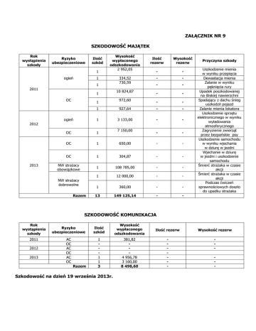 ZAŁĄCZNIK NR 9 SZKODOWOŚĆ MAJĄTEK Rok wystąpienia szkody Ryzyko ubezpieczeniowe Ilość szkód 1 ogień Wysokość wypłaconego odszkodowania 2 952,05 1 1 2011 1 OC 1 334,52 730,59 10 824,87 972,60 Ilość rezerw Wysokość rezerw - - - - - - - - - - 1 927,64 - - ogień 1 3 133,00 - - OC 1 - - OC 1 650,00 - - OC 1 304,87 - - NW strażacy obowiązkowe 1 108 785,00 - - 1 12 000,00 - - 1 360,00 - - 13 149 125,14 - - 2012 2013 NW strażacy dobrowolne Razem 7 150,00 Przyczyna szkody Uszkodzenie mienia w wyniku przepięcia Dewastacja mienia Zalanie w wyniku pęknięcia rury Upadek poszkodowanej na śliskiej nawierzchni Spadający z dachu śnieg uszkodził pojazd Zalanie mienia lokatora Uszkodzenie sprzętu elektronicznego w wyniku wyładowania atmosferycznego Zagryzienie zwierząt przez bezpańskie psy Uszkodzenie samochodu w wyniku wjechania w dziurę w jezdni Wjechanie w dziurę w jezdni i uszkodzenie samochodu Śmierć strażaka w czasie akcji Śmierć strażaka w czasie akcji Podczas ćwiczeń sprawnościowych doszło do upadku strażaka SZKODOWOŚĆ KOMUNIKACJA Rok wystąpienia szkody 2011 2012 2013 Ryzyko ubezpieczeniowe Ilość szkód Wysokość wypłaconego odszkodowania Ilość rezerw Wysokość rezerw AC OC AC OC AC OC 1 1 1 3 381,82 4 956,78 3 160,00 8 498,60 - - Razem Szkodowość na dzień 19 września 2013r. -