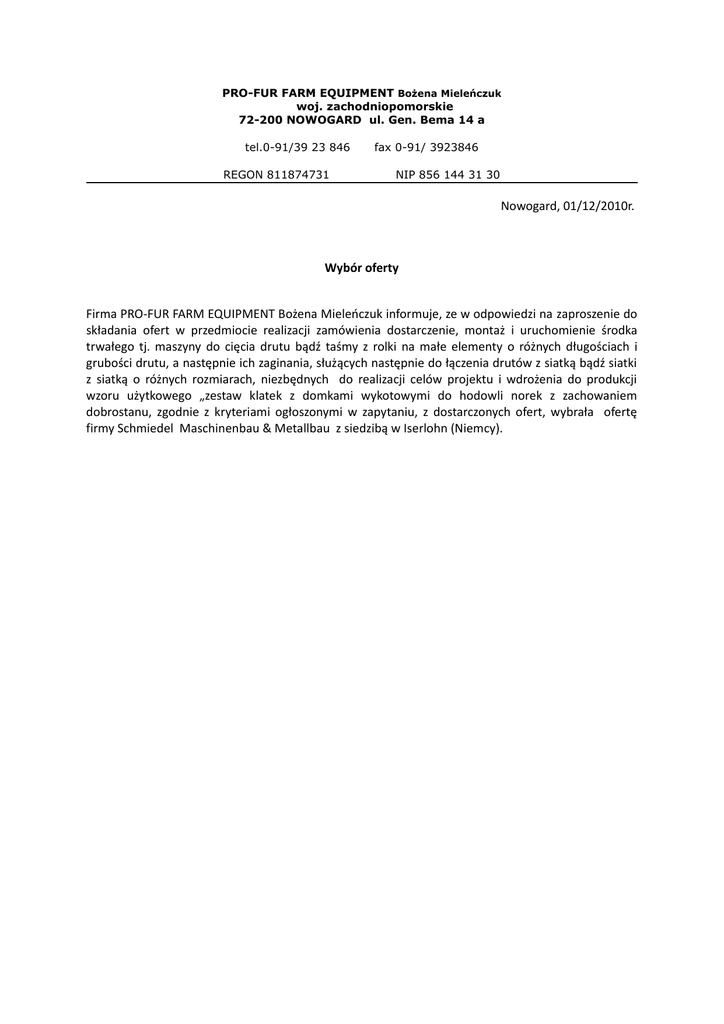 PRO-FUR FARM EQUIPMENT Bożena Mieleńczuk woj. zachodniopomorskie 72-200 NOWOGARD ul. Gen. Bema 14 a tel.0-91/39 23 846 REGON 811874731 fax 0-91/ 3923846 NIP 856 144 31 30 Nowogard, 01/12/2010r. Wybór oferty Firma PRO‐FUR FARM EQUIPMENT Bożena Mieleńczuk informuje, ze w odpowiedzi na zaproszenie do składania ofert w przedmiocie realizacji zamówienia dostarczenie, montaż i uruchomienie środka trwałego tj. maszyny do cięcia drutu bądź taśmy z rolki na małe elementy o różnych długościach i grubości drutu, a następnie ich zaginania, służących następnie do łączenia drutów z siatką bądź siatki z siatką o różnych rozmiarach, niezbędnych do realizacji celów projektu i wdrożenia do produkcji wzoru użytkowego „zestaw klatek z domkami wykotowymi do hodowli norek z zachowaniem dobrostanu, zgodnie z kryteriami ogłoszonymi w zapytaniu, z dostarczonych ofert, wybrała ofertę firmy Schmiedel Maschinenbau & Metallbau z siedzibą w Iserlohn (Niemcy).