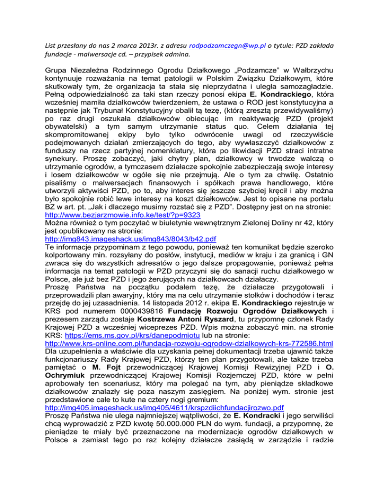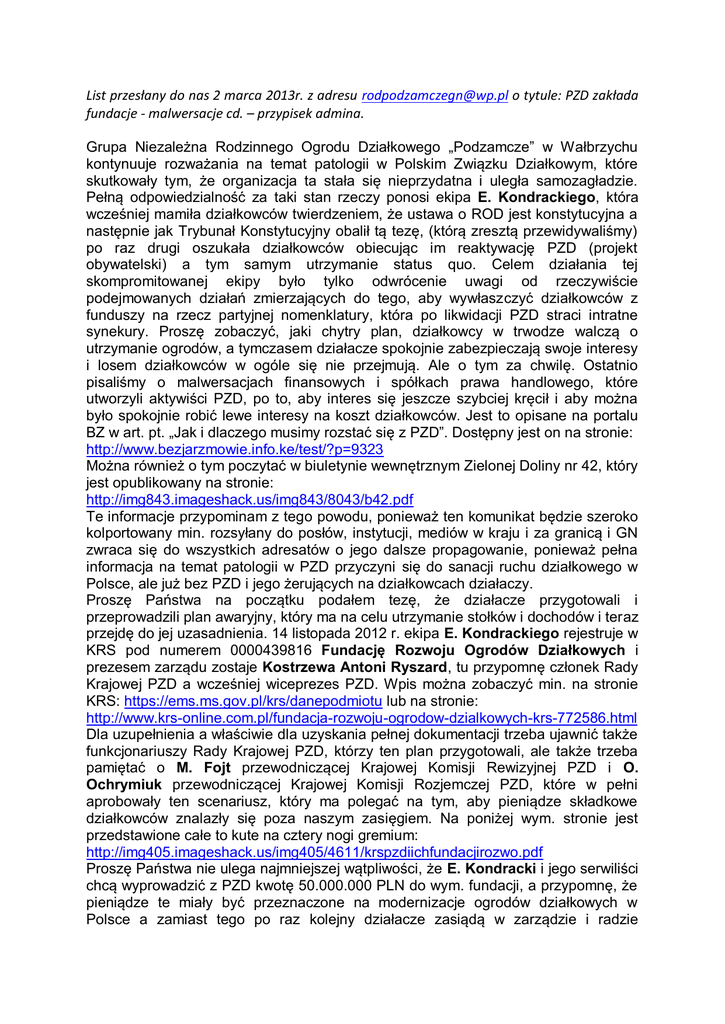 List przesłany do nas 2 marca 2013r. z adresu [email protected] o tytule: PZD zakłada fundacje - malwersacje cd. – przypisek admina. Grupa Niezależna Rodzinnego Ogrodu Działkowego „Podzamcze” w Wałbrzychu kontynuuje rozważania na temat patologii w Polskim Związku Działkowym, które skutkowały tym, że organizacja ta stała się nieprzydatna i uległa samozagładzie. Pełną odpowiedzialność za taki stan rzeczy ponosi ekipa E. Kondrackiego, która wcześniej mamiła działkowców twierdzeniem, że ustawa o ROD jest konstytucyjna a następnie jak Trybunał Konstytucyjny obalił tą tezę, (którą zresztą przewidywaliśmy) po raz drugi oszukała działkowców obiecując im reaktywację PZD (projekt obywatelski) a tym samym utrzymanie status quo. Celem działania tej skompromitowanej ekipy było tylko odwrócenie uwagi od rzeczywiście podejmowanych działań zmierzających do tego, aby wywłaszczyć działkowców z funduszy na rzecz partyjnej nomenklatury, która po likwidacji PZD straci intratne synekury. Proszę zobaczyć, jaki chytry plan, działkowcy w trwodze walczą o utrzymanie ogrodów, a tymczasem działacze spokojnie zabezpieczają swoje interesy i losem działkowców w ogóle się nie przejmują. Ale o tym za chwilę. Ostatnio pisaliśmy o malwersacjach finansowych i spółkach prawa handlowego, które utworzyli aktywiści PZD, po to, aby interes się jeszcze szybciej kręcił i aby można było spokojnie robić lewe interesy na koszt działkowców. Jest to opisane na portalu BZ w art. pt. „Jak i dlaczego musimy rozstać się z PZD”. Dostępny jest on na stronie: http://www.bezjarzmowie.info.ke/test/?p=9323 Można również o tym poczytać w biuletynie wewnętrznym Zielonej Doliny nr 42, który jest opublikowany na stronie: http://img843.imageshack.us/img843/8043/b42.pdf Te informacje przypominam z tego powodu, ponieważ ten komunikat będzie szeroko kolportowany min. rozsyłany do posłów, instytucji, mediów w kraju i za granicą i GN zwraca się do wszystkich adresatów o jego dalsze propagowanie, ponieważ pełna informacja na temat patologii w PZD przyczyni się do sanacji ruchu działkowego w Polsce, ale już bez PZD i jego żerujących na działkowcach działaczy. Proszę Państwa na początku podałem tezę, że działacze przygotowali i przeprowadzili plan awaryjny, który ma na celu utrzymanie stołków i dochodów i teraz przejdę do jej uzasadnienia. 14 listopada 2012 r. ekipa E. Kondrackiego rejestruje w KRS pod numerem 0000439816 Fundację Rozwoju Ogrodów Działkowych i prezesem zarządu zostaje Kostrzewa Antoni Ryszard, tu przypomnę członek Rady Krajowej PZD a wcześniej wiceprezes PZD. Wpis można zobaczyć min. na stronie KRS: https://ems.ms.gov.pl/krs/danepodmiotu lub na stronie: http://www.krs-online.com.pl/fundacja-rozwoju-ogrodow-dzialkowych-krs-772586.html Dla uzupełnienia a właściwie dla uzyskania pełnej dokumentacji trzeba ujawnić także funkcjonariuszy Rady Krajowej PZD, którzy ten plan przygotowali, ale także trzeba pamiętać o M. Fojt przewodniczącej Krajowej Komisji Rewizyjnej PZD i O. Ochrymiuk przewodniczącej Krajowej Komisji Rozjemczej PZD, które w pełni aprobowały ten scenariusz, który ma polegać na tym, aby pieniądze składkowe działkowców znalazły się poza naszym zasięgiem. Na poniżej wym. stronie jest przedstawione całe to kute na cztery nogi gremium: http://img405.imageshack.us/img405/4611/krspzdiichfundacjirozwo.pdf Proszę Państwa nie ulega najmniejszej wątpliwości, że E. Kondracki i jego serwiliści chcą wyprowadzić z PZD kwotę 50.000.000 PLN do wym. fundacji, a przypomnę, że pieniądze te miały być przeznaczone na modernizacje ogrodów działkowych w Polsce a zamiast tego po raz kolejny działacze zasiądą w zarządzie i radzie nadzorczej wym. fundacji i za puste debaty na temat rozwoju ogrodów działkowych będą się sowicie wynagradzać, natomiast działkowcy zostaną pozbawieni szansy na uzyskanie środków na modernizacje swoich ogrodów, mimo, że zgromadzili na ten cel fundusze. Po raz kolejny działkowcy zostali oszukani, bo wcześniej prominentni działacze PZD za pieniądze działkowców utworzyli sobie intratne etaty w spółkach prawa handlowego, ale to im nie wystarczyło i teraz dodatkowo stworzyli sobie wym. fundację, której byt nie ma żadnego uzasadnienia, ponieważ wcześniej zgromadzone na ten cel środki powinny zostać przekazane ogrodom na modernizację i to byłby dodatkowy atut, aby nie likwidować dobrze urządzonych i zmodernizowanych ogrodów. Jednym słowem pieniądze działkowców są wykorzystywane do celów pozastatutowych i marnowane są na interesy działaczy z Rady Krajowej PZD oraz na utrzymywanie kancelarii prawniczych, które tu również korzystają i czerpią znaczne korzyści. Taki patologiczny stan rzeczy jednoznacznie dyskwalifikuje PZD, jako podmiot, który może zabierać głos w sprawach działkowców, natomiast działkowcy powinni powstrzymać się z płaceniem składek członkowskich na rzecz PZD, ponieważ nie mają oni obowiązku finansować podejrzanych interesów funkcjonariuszy PZD, spółek czy fundacji. Tak na marginesie dodam tylko, że członkiem RK jest Z. Śliwa, który jednocześnie jest prezesem OZ w Poznaniu, a z Wielkopolski GN otrzymuje największą ilość niepokojących sygnałów i prezesi ROD z tego rejonu z jednej strony wspierają nasze starania o likwidację PZD i budowę samorządu ogrodniczego od podstaw, a z drugiej strony nie mogą w tym procesie aktywnie uczestniczyć, bo są z miejsca „ustawiani” przez wym. PRL-owskiego pułkownika. W ogrodach, które zamierzają się usamodzielnić wprowadza się natychmiast zarządy komisaryczne, a rzekomo projekt obywatelski i PZD dopuszcza secesję i jak się okazuje tylko na papierze. Otrzymaliśmy także informację, że w Poznaniu biura PZD są już wysprzątane i nie udostępnia się już żadnych dokumentów. Jednym słowem działacze RK dokładnie wiedzą