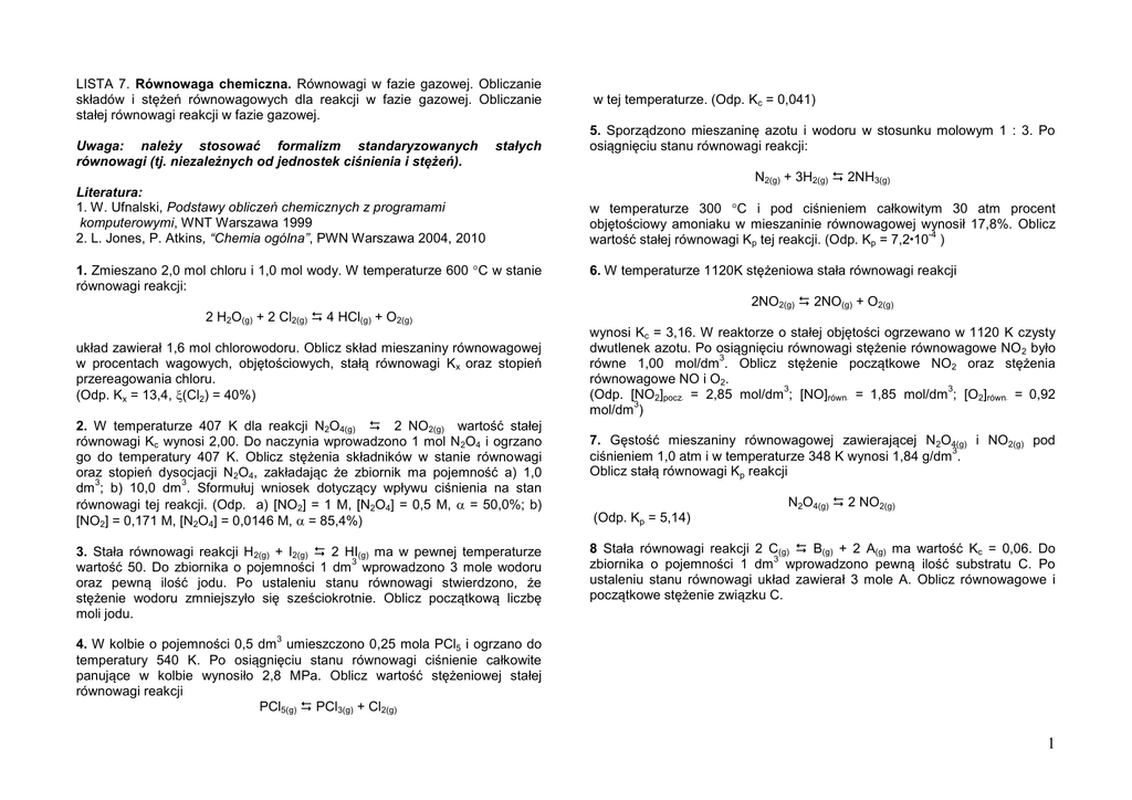 LISTA 7. Równowaga chemiczna. Równowagi w fazie