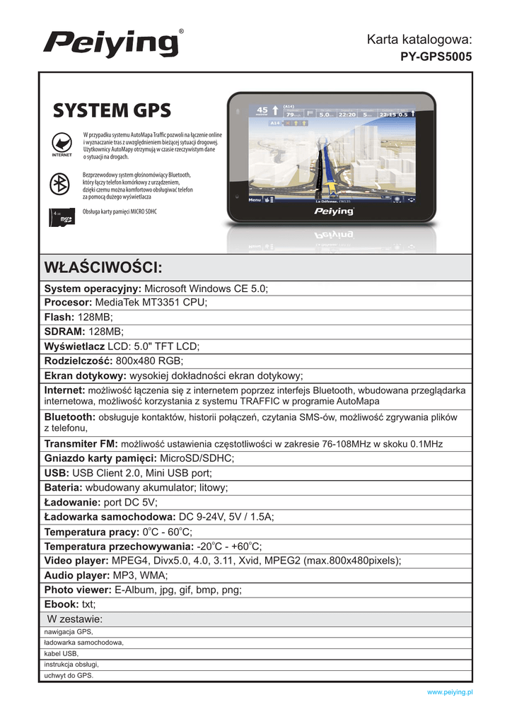 Karta katalogowa: PY-GPS5005 SYSTEM GPS W przypadku systemu AutoMapa Traffic pozwoli na ³¹czenie online i wyznaczanie tras z uwzglêdnieniem bie¿¹cej sytuacji drogowej. U¿ytkownicy AutoMapy otrzymuj¹ w czasie rzeczywistym dane o sytuacji na drogach. Bezprzewodowy system g³oœnomówi¹cy Bluetooth, który ³¹czy telefon komórkowy z urz¹dzeniem, dziêki czemu mo¿na komfortowo obs³ugiwaæ telefon za pomoc¹ du¿ego wyœwietlacza 4 Obs³uga karty pamiêci MICRO SDHC W£AŒCIWOŒCI: System operacyjny: Microsoft Windows CE 5.0; Procesor: MediaTek MT3351 CPU; Flash: 128MB; SDRAM: 128MB; Wyœwietlacz LCD: 5.0" TFT LCD; Rodzielczoœæ: 800x480 RGB; Ekran dotykowy: wysokiej dok³adnoœci ekran dotykowy; Internet: mo¿liwoœæ ³¹czenia siê z internetem poprzez interfejs Bluetooth, wbudowana przegl¹darka internetowa, mo¿liwoœæ korzystania z systemu TRAFFIC w programie AutoMapa Bluetooth: obs³uguje kontaktów, historii po³¹czeñ, czytania SMS-ów, mo¿liwoœæ zgrywania plików z telefonu, Transmiter FM: mo¿liwoœæ ustawienia czêstotliwoœci w zakresie 76-108MHz w skoku 0.1MHz Gniazdo karty pamiêci: MicroSD/SDHC; USB: USB Client 2.0, Mini USB port; Bateria: wbudowany akumulator; litowy; £adowanie: port DC 5V; £adowarka samochodowa: DC 9-24V, 5V / 1.5A; Temperatura pracy: 0oC - 60oC; Temperatura przechowywania: -20oC - +60oC; Video player: MPEG4, Divx5.0, 4.0, 3.11, Xvid, MPEG2 (max.800x480pixels); Audio player: MP3, WMA; Photo viewer: E-Album, jpg, gif, bmp, png; Ebook: txt; W zestawie: nawigacja GPS, ³adowarka samochodowa, kabel USB, instrukcja obs³ugi, uchwyt do GPS. www.peiying.pl