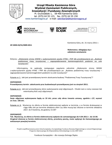 Nie moŜna wy świetlić obrazu. Na k omputerze moŜe brak ować pamięci do otwarcia obrazu lub obraz moŜe by ć uszk odzony . Uruchom ponownie k omputer, a następnie otwórz plik ponownie. Jeśli czerwony znak x nadal będzie wy świetlany , k onieczne moŜe by ć usunięcie obrazu, a następnie ponowne wstawienie go. Urząd Miasta Kamienna Góra Wydział Zamówień Publicznych, Inwestycji i Funduszy Zewnętrznych Pl. Grunwaldzki 1, 58-400 Kamienna Góra tel. (075) 64 55 123, fax. (075) 64 55 150 www.kamiennagora.pl e-mail: [email protected] Kamienna Góra, dn. 31 marca 2011 r. ZIF.3030-24/31/2009-2011 Wykonawcy ubiegający się o udzielenie zamówienia Dotyczy: „Wykonanie strony WWW z wykorzystaniem języka HTML i PHP dla przedsięwzięcia pn. „Budowa podziemnej trasy turystycznej – zagospodarowanie kamiennogórskich podziemi na cele turystyczne” Informujemy, że wpłynęły następujące zapytania odnośnie „Wykonanie strony WWW z wykorzystaniem języka HTML i PHP dla przedsięwzięcia pn. „Budowa podziemnej trasy turystycznej – zagospodarowanie kamiennogórskich podziemi na cele turystyczne” Pytanie nr 1: Jaki jest przewidywany termin ukończenia budowy "Podziemnej Trasy Turystycznej"? ODPOWIEDŹ: Przewidywany termin zakończenia prac budowlanych przewidywany jest na sierpień 2011. Pytanie nr 2: Jaki jest przewidywany okres wykonywania sesji zdjęciowych. Chodzi nam o ramy czasowe lub ewentualną ilość sesji zdjęciowych. ODPOWIEDŹ: Sesje zdjęciowe wykonywane będą co 10 dni, przez cały okres trwania umowy, zgodnie z §7, wynosi on max. 106 dni. Pytanie nr 3: Wystarczy że oferta w formie elektronicznej wpłynie w terminie, a w formie drukowanej w ciągu kilku dni po terminie składania ofert czy obie muszą być złożone w terminie składania ofert do 4 kwietnia, do godziny 15:30? ODPOWIEDŹ: Tak. Wystarczy, że oferta w formie elektronicznej wpłynie do zamawiającego do 4.04.2011 r. do 15:30. Oryginał złożonej w formie elektronicznej oferty, przesłany pocztą, może wpłynąć do Zamawiającego po wskazanym powyżej terminie. Projekt współfinansowany przez Unię Europejską z Europejskiego Funduszu Rozwoju Regionalnego w ramach Regionalnego Programu Operacyjnego dla Województwa Dolnośląskiego na lata 2007-2013 Fundusze Europejskie – dla rozwoju Dolnego Śląska Nie moŜna wy świetlić obrazu. Na k omputerze moŜe brak ować pamięci do otwarcia obrazu lub obraz moŜe by ć uszk odzony . Uruchom ponownie k omputer, a następnie otwórz plik ponownie. Jeśli czerwony znak x nadal będzie wy świetlany , k onieczne moŜe by ć usunięcie obrazu, a następnie ponowne wstawienie go. Urząd Miasta Kamienna Góra Wydział Zamówień Publicznych, Inwestycji i Funduszy Zewnętrznych Pl. Grunwaldzki 1, 58-400 Kamienna Góra tel. (075) 64 55 123, fax. (075) 64 55 150 www.kamiennagora.pl e-mail: [email protected] Pytanie nr 4: Data 2010r. w terminie składania ofert to pomyłka? ODPOWIEDŹ: Tak, jest to pomyłka. Poprawny rok to 2011. Wyjaśnienia stanowią uzupełnienie Zapytania ofertowego i są wiążące dla stron. Z poważaniem Z up. Burmistrza Miasta Kamiennej Góry Zastępca Burmistrza /-/ Kazimierz Kawa Sprawę prowadzi: Wydział Zamówień Publicznych, Inwestycji i Funduszy Zewnętrznych Kamila Stypuła – w sprawach proceduralnych tel. (0 75) 64 55 123 [email protected] Tadeusz Ferenc – w sprawach technicznych, informatycznych tel. (0 75) 64 55 114 [email protected] Otrzymują: 1. Adresat 2. a/a Projekt współfinansowany przez Unię Europejską z Europejskiego Funduszu Rozwoju Regionalnego w ramach Regionalnego Programu Operacyjnego dla Województwa Dolnośląskiego na lata 2007-2013 Fundusze Europejskie – dla rozwoju Dolnego Śląska