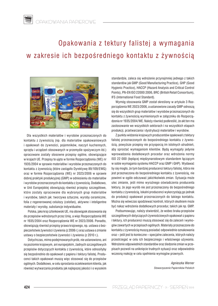 OPAKOWANIA PAPIEROWE Opakowania z tektur y falistej a wymagania w zakresie ich bezpośredniego kontaktu z żywnością standardzie, zaleca się wdrożenie przynajmniej jednego z takich standardów jak GMP (Good Manufacturing Practice), GHP (Good Hygienic Practice), HACCP (Hazard Analysis and Critical Control Points), PN-EN ISO 22000:2006, BRC (British Retail Consortium), IFS (International Food Standard). Wymóg stosowania GMP został określony w artykule 3 Rozporządzenia WE 2023/2006, a ustanowione zasady GMP odnoszą się do wszystkich grup materiałów i wyrobów przeznaczonych do kontaktu z żywnością wymienionych w załączniku do Rozporządzenia nr 1935/2004/WE. Należy również podkreślić, że akt ten ma zastosowanie we wszystkich sektorach i na wszystkich etapach produkcji, przetwarzania i dystrybucji materiałów i wyrobów. Dla wszystkich materiałów i wyrobów przeznaczonych do Z punktu widzenia krajowych producentów opakowań z tektury kontaktu z żywnością (np. dla materiałów opakowaniowych falistej przeznaczonych do bezpośredniego kontaktu z żywno- i opakowań do żywności, pojemników, naczyń kuchennych, ścią, powyższe przepisy nie przysporzą im istotnych utrudnień, sprzętu i urządzeń stosowanych w przemyśle spożywczym itd.) aby sprostać wymaganiom klientów. Będą wymagały jedynie opracowane zostały stosowne przepisy ogólne, obowiązujące wprowadzenia dodatkowych procedur oraz wdrożenia normy w krajach UE. Przepisy te ujęto w formie Rozporządzenia (WE) nr ISO 22 000 (będącej międzynarodowym standardem łączącym 1935/2004 w sprawie materiałów i wyrobów przeznaczonych do w sobie wymagania systemu HACCP oraz GMP i GHP). Wydawać kontaktu z żywnością (które zastąpiło Dyrektywę 89/109/EWG) by się mogło, że tym bardziej producenci tektury falistej, która nie oraz w formie Rozporządzenia (WE) nr 2023/2006 w sprawie jest przeznaczona do bezpośredniego kontaktu z żywnością, nie dobrej praktyki produkcyjnej (GMP) w odniesieniu do materiałów powinni w ogóle odczuwać jakichkolwiek zmian. Sytuacja może i wyrobów przeznaczonych do kontaktu z żywnością. Dodatkowo, ulec zmianie, jeśli mimo wyraźnego oświadczenia producenta w Unii Europejskiej obowiązują również przepisy szczegółowe, tektury, że jego wyrób nie jest przeznaczony do bezpośredniego które zostały opracowane dla wybranych grup materiałów kontaktu z żywnością, lokalni producenci wykorzystają go jednak i wyrobów, takich jak: tworzywa sztuczne, wyroby ceramiczne, do produkcji opakowań przeznaczonych do takiego kontaktu. folia z regenerowanej celulozy (celofan), aktywne i inteligentne Można się wówczas spodziewać kontroli, których skutkiem może materiały i wyroby, substancje indywidualne. być nakaz wdrożenia dodatkowych procedur, takich jak np. GMP. Polska, jako kraj członkowski UE, ma obowiązek stosowania się Podsumowując, należy stwierdzić, że wobec braku przepisów do przepisów wdrożonych przez Unię, a więc Rozporządzenia WE szczegółowych dotyczących żywnościowych opakowań z papieru nr 1935/2004 oraz Rozporządzenia WE nr 2023/2006. Ponadto, i tektury, ich producenci muszą stosować się do zaleceń i wymo- obowiązują również przepisy prawa krajowego, np. ustawa o bez- gów zawartych w przepisach ogólnych. Materiały przeznaczone do pieczeństwie żywności i żywienia (z 2006 r.) oraz ustawa o zmianie kontaktu z żywnością muszą posiadać odpowiednie oznakowania ustawy o bezpieczeństwie żywności i żywienia (z 2010 r.). oraz – jeśli jest to konieczne – specjalne zalecenia, których należy Dotychczas, mimo podejmowanych prób, nie ustanowiono, ani przestrzegać w celu ich bezpiecznego i właściwego używania. na poziomie krajowym, ani europejskim, żadnych szczegółowych Wdrożenie odpowiednich standardów oraz śledzenie zmian w prze- przepisów dotyczących kontaktu z żywnością, które odnosiłyby pisach pozwoli na uniknięcie trudnych sytuacji oraz odpowiednio się bezpośrednio do opakowań z papieru i tektury falistej. Produ- wczesną reakcję w celu spełnienia wymogów prawnych. cenci takich opakowań muszą więc stosować się do przepisów ogólnych. Dodatkowo, w celu sprostania oczekiwaniom klienta, jak Agnieszka Werner również wytwarzania produktu jak najlepszej jakości i o wysokim Stowarzyszenie Papierników Polskich 424 PRZEGLĄD PAPIERNICZY · 71 · SIERPIEŃ 2015